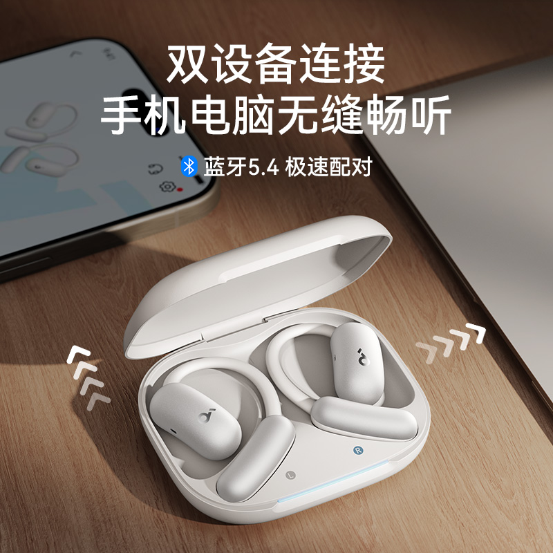 1、适配不同耳型/自适应耳挂 2、全天候不累耳/双曲面释压设计 3、强力沉浸感/旗舰无损音质 4、开放式告别漏音/3.0定向传音技术 5、通话超清晰/4麦AI降噪 6、超级快充/支持无线充电