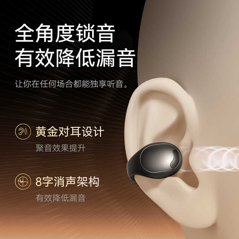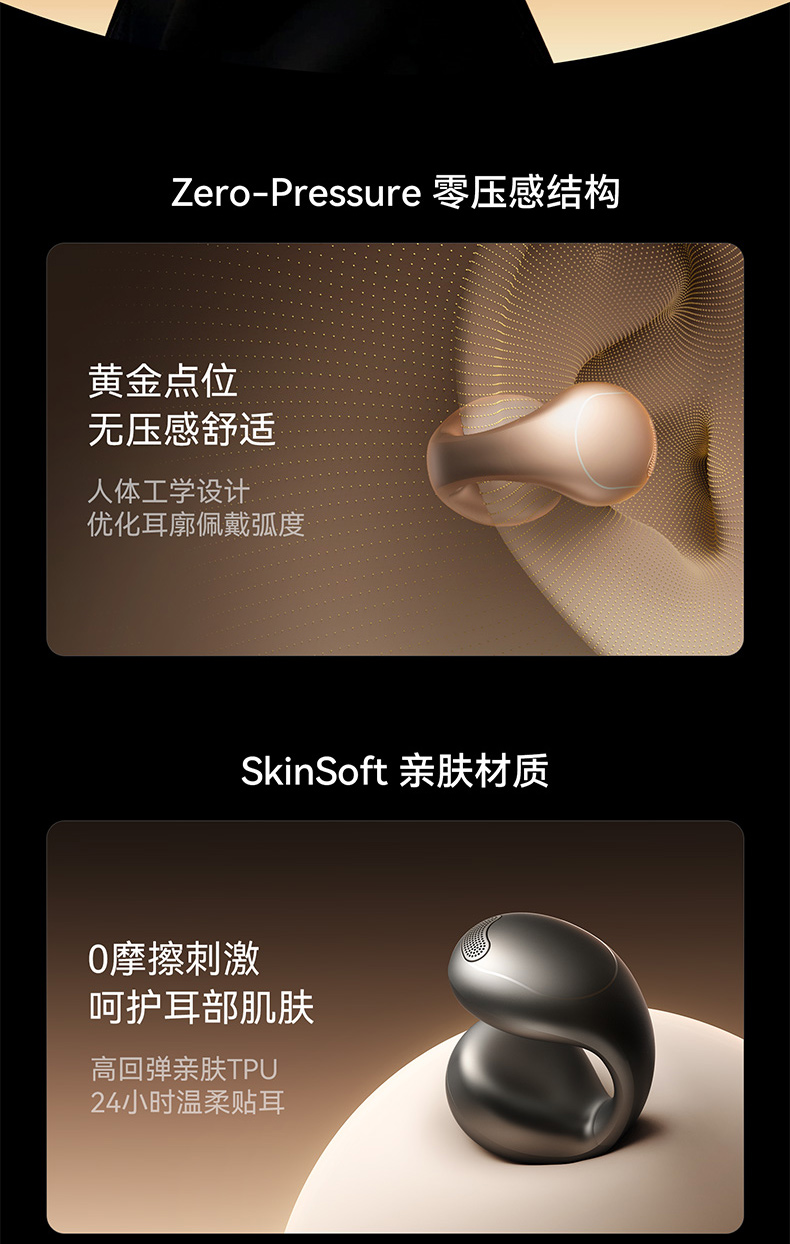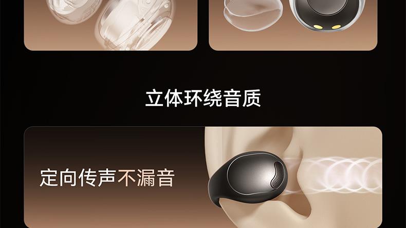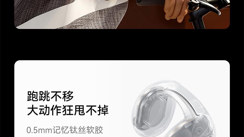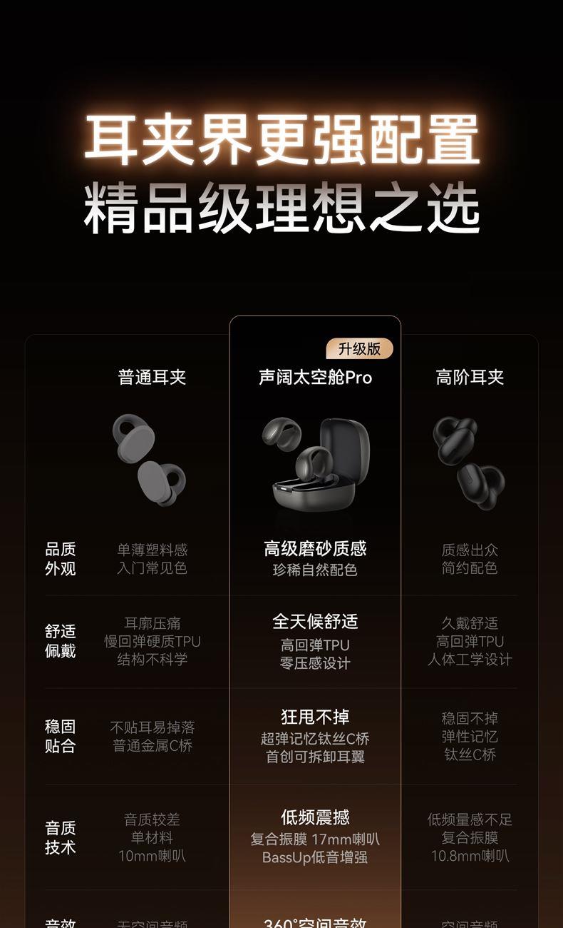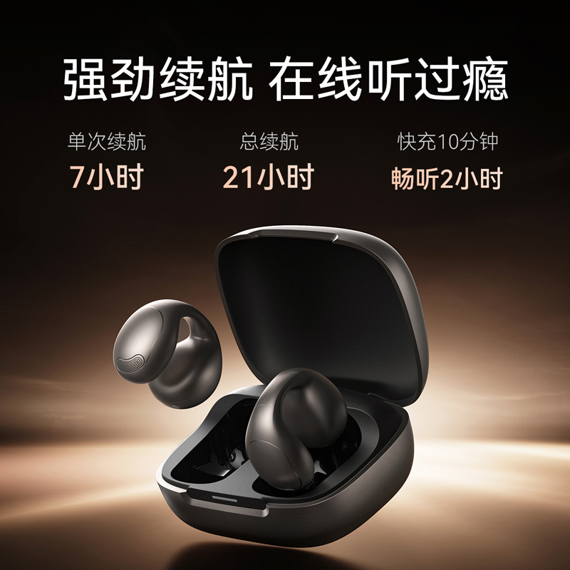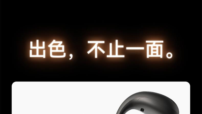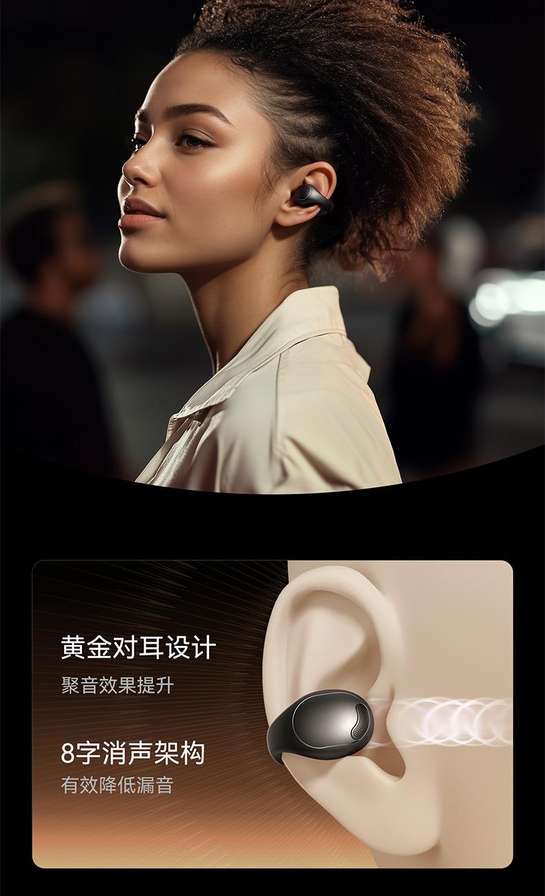1、耳夹式不入耳,不闷堵舒适聆听 2、 零压感设计,全天候舒适佩戴 3、 记忆钛丝软胶,自适应贴合耳廓 4、 首创透明耳翼,适配不同耳型 5、 17mm跑道型喇叭,音质立体澎湃 6、 总续航21小时,日夜随心听