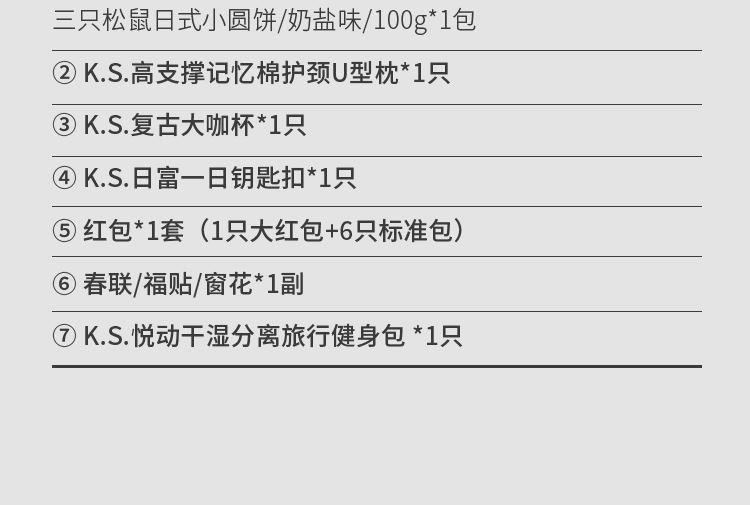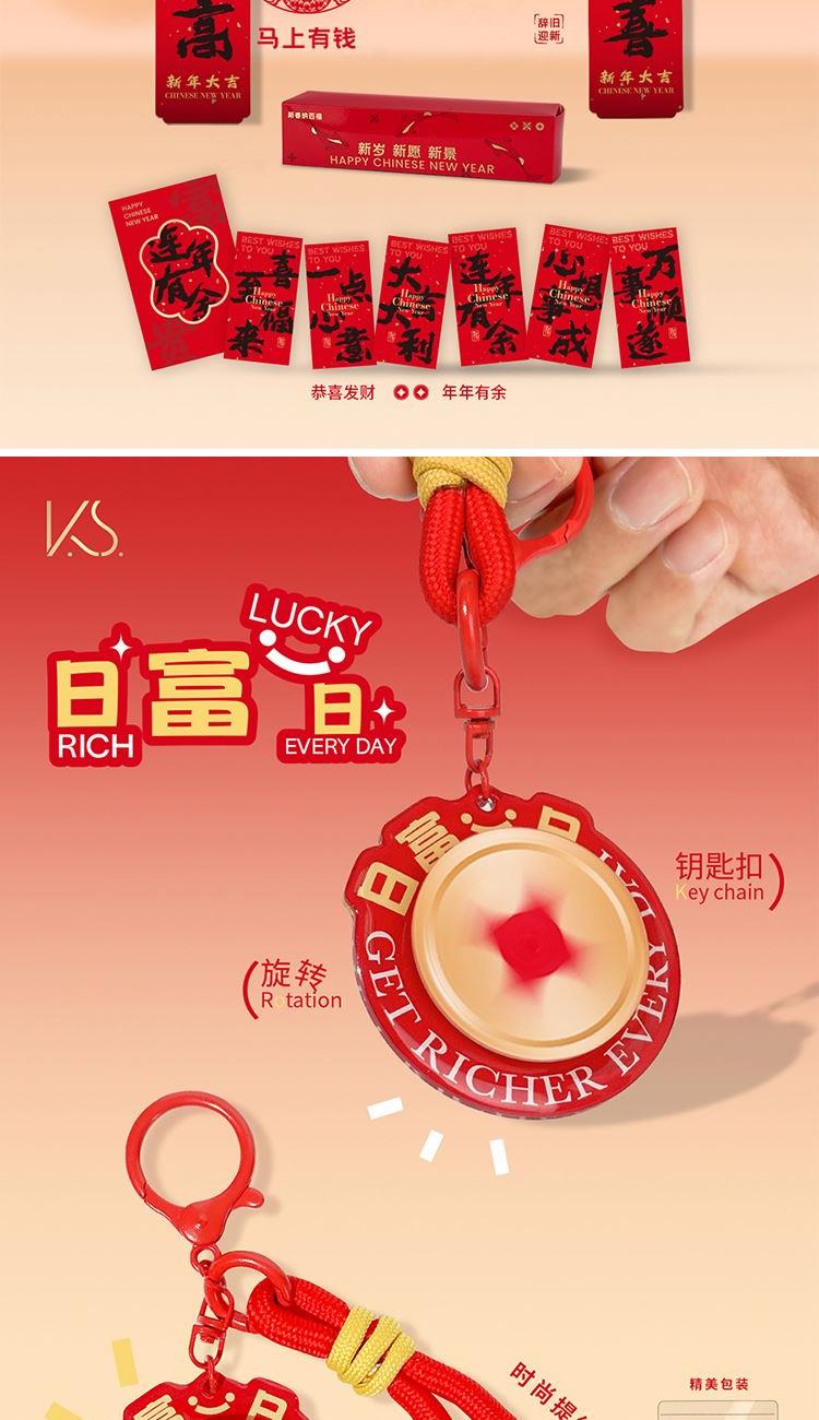 内置经典年品(春联、红包、窗花)与零食礼盒,搭配实用好物(钥匙扣、U型枕、保温杯),心意满满。