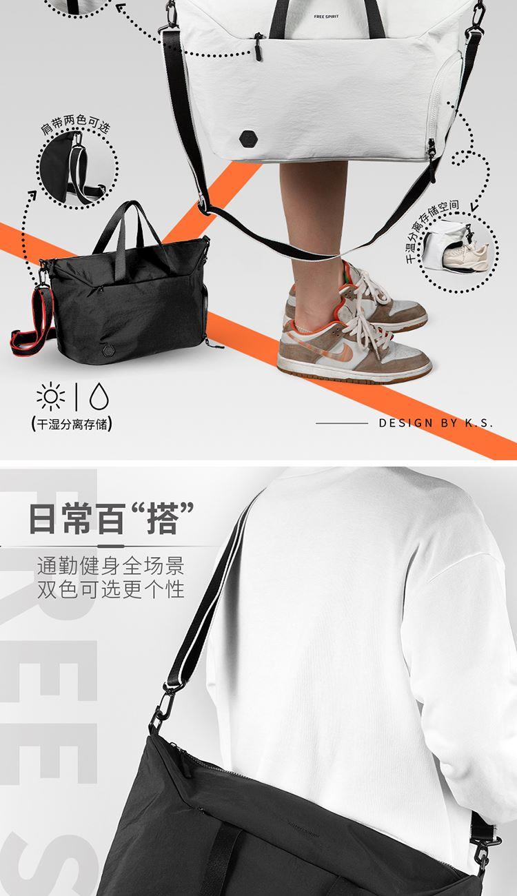 健身包:50CM*27CM 主料:尼龙塔丝隆,成分:99.9%尼龙里布:桃皮绒+210T,99.9%涤纶 肩带和提手:99.9%涤纶