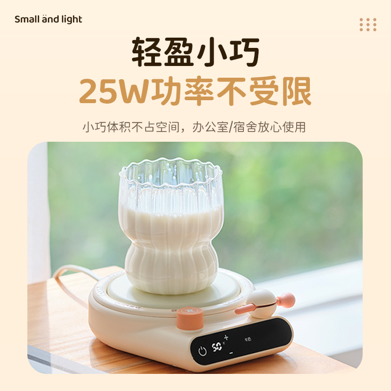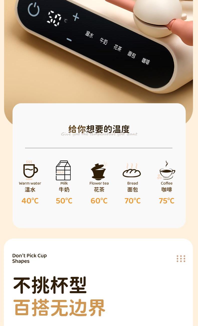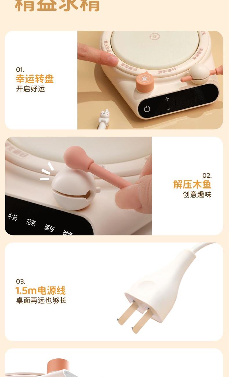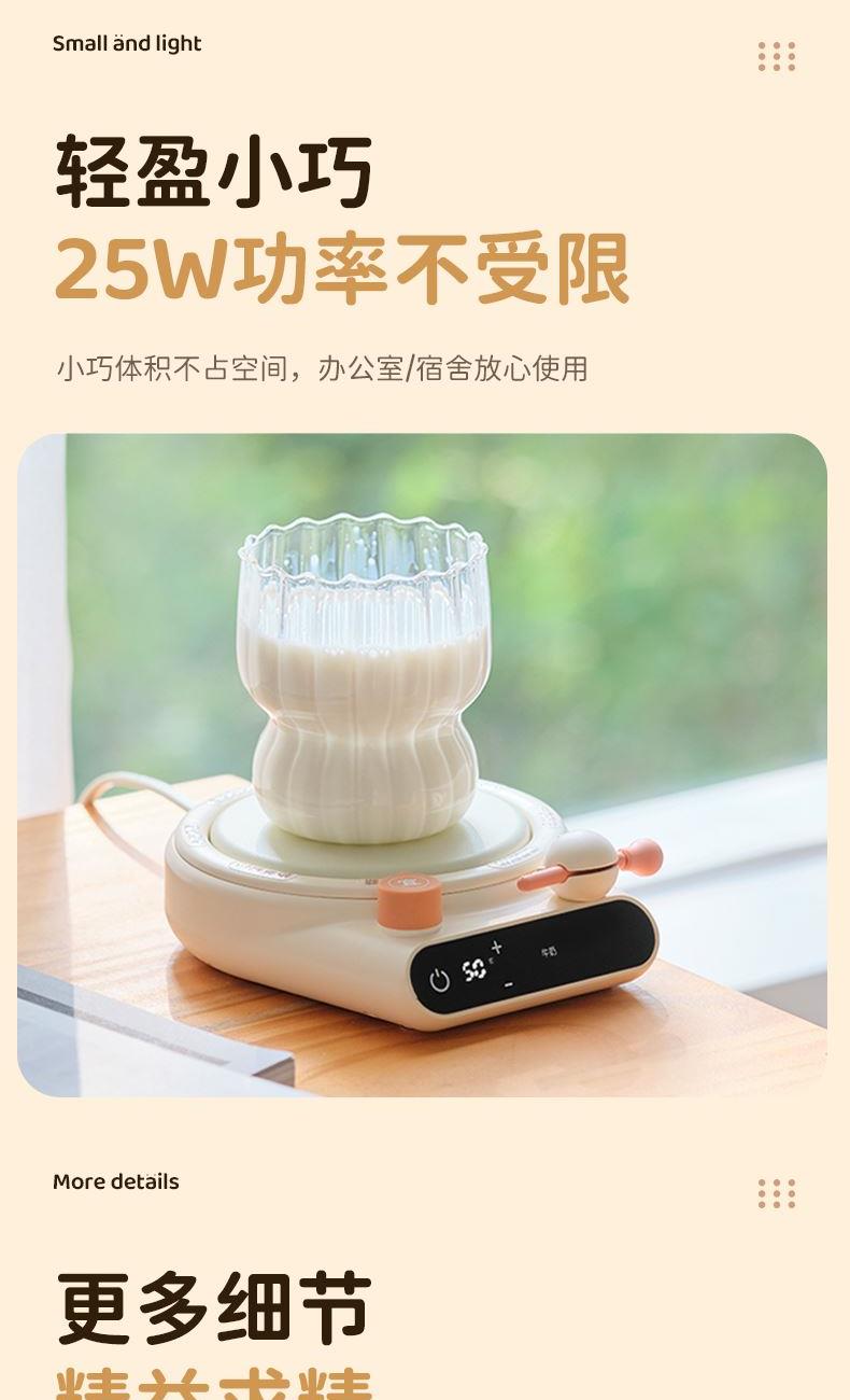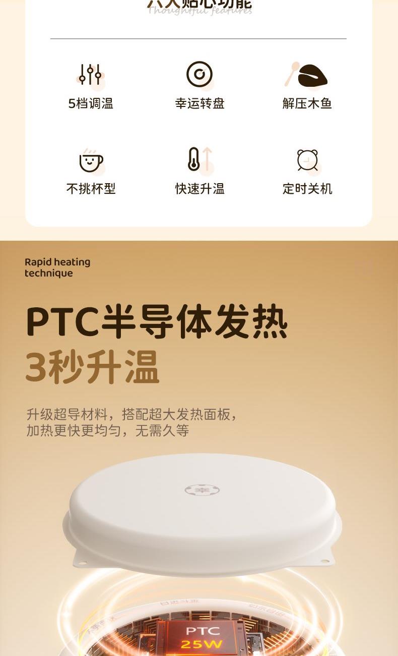 产品尺寸:132*157*40mm产品重量:362g 输入:110-220V 功率:25W 材质:ABS防火料+硅胶+铝片 颜色:粉白色 运势转盘,解压木鱼,无边界百搭不挑杯 5挡温度,TC发热3S升温,8小时智能断电 25W功率放心使用,智能数显,快速升温,定时关机 阻燃材料 ,一体成型更耐脏, 底部防滑