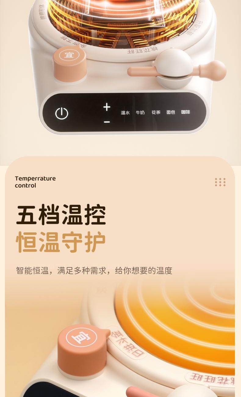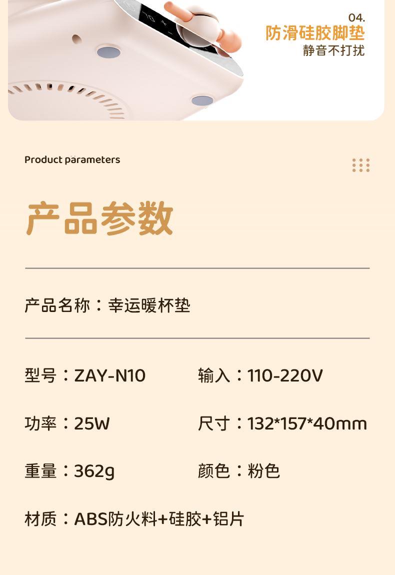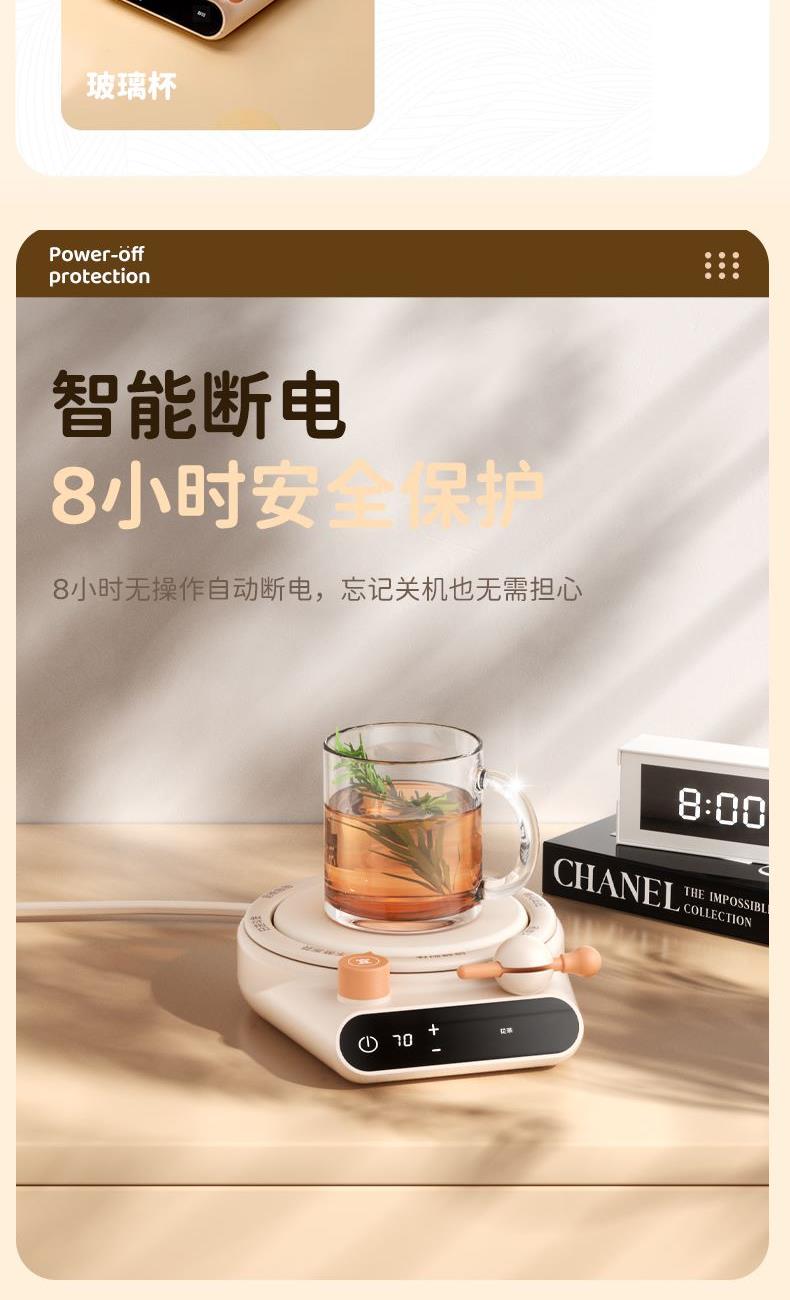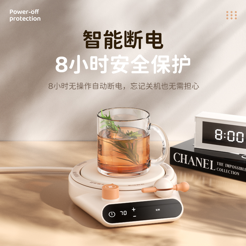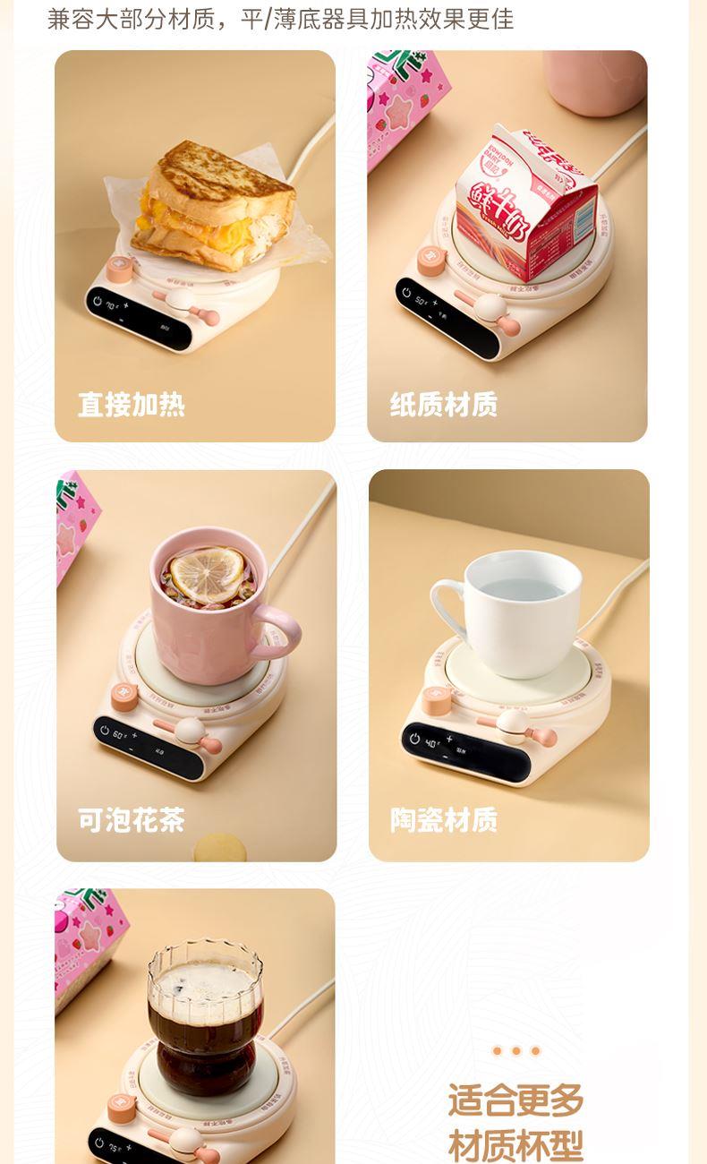 产品尺寸:132*157*40mm产品重量:362g 输入:110-220V 功率:25W 材质:ABS防火料+硅胶+铝片 颜色:粉白色 运势转盘,解压木鱼,无边界百搭不挑杯 5挡温度,TC发热3S升温,8小时智能断电 25W功率放心使用,智能数显,快速升温,定时关机 阻燃材料 ,一体成型更耐脏, 底部防滑