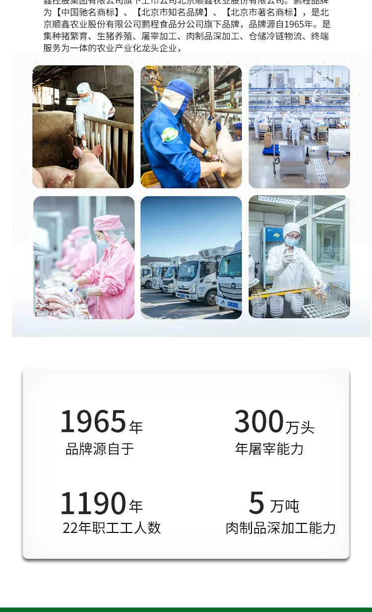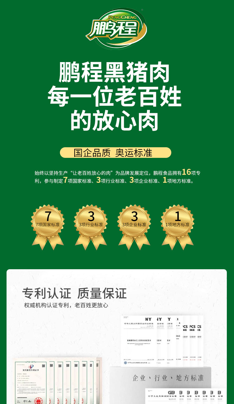鹏程黑猪肉具有肉质紧实、脂肪含量低、口感细腻等特点,且注重无抗养殖和透明供应链管理 肉色鲜红,脂肪呈乳白色,具有明显大理石花纹,肉质细嫩有弹性 养殖周期12个月以上,采用中草药无抗饲料,全程透明可追溯 供应链覆盖种猪繁育、生猪养殖、屠宰加工至仓储物流,确保品质与安全 塞牧勒黑猪肉欢聚礼盒898型 梅花肉300g 五花肉400g 小里脊 300g 猪肉馅400g*2 汤骨400g 猪腿肉400g 肋排400g*2