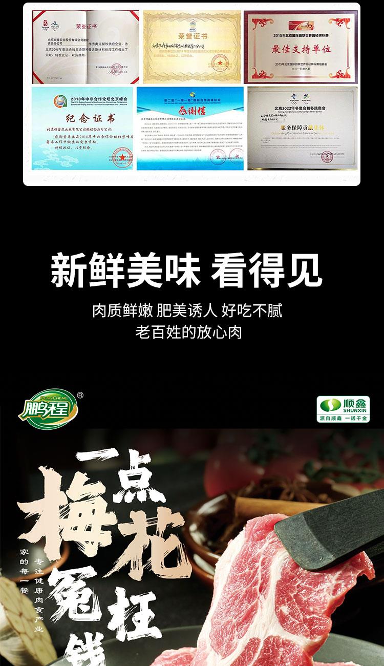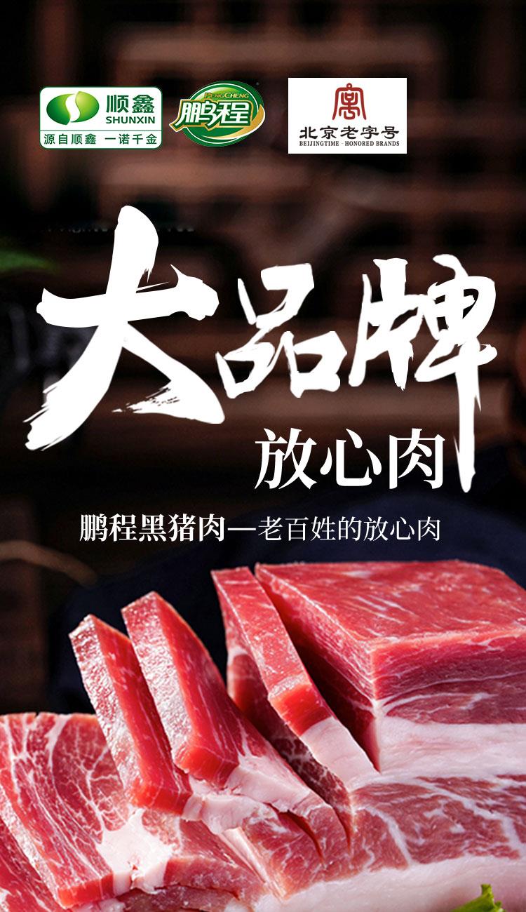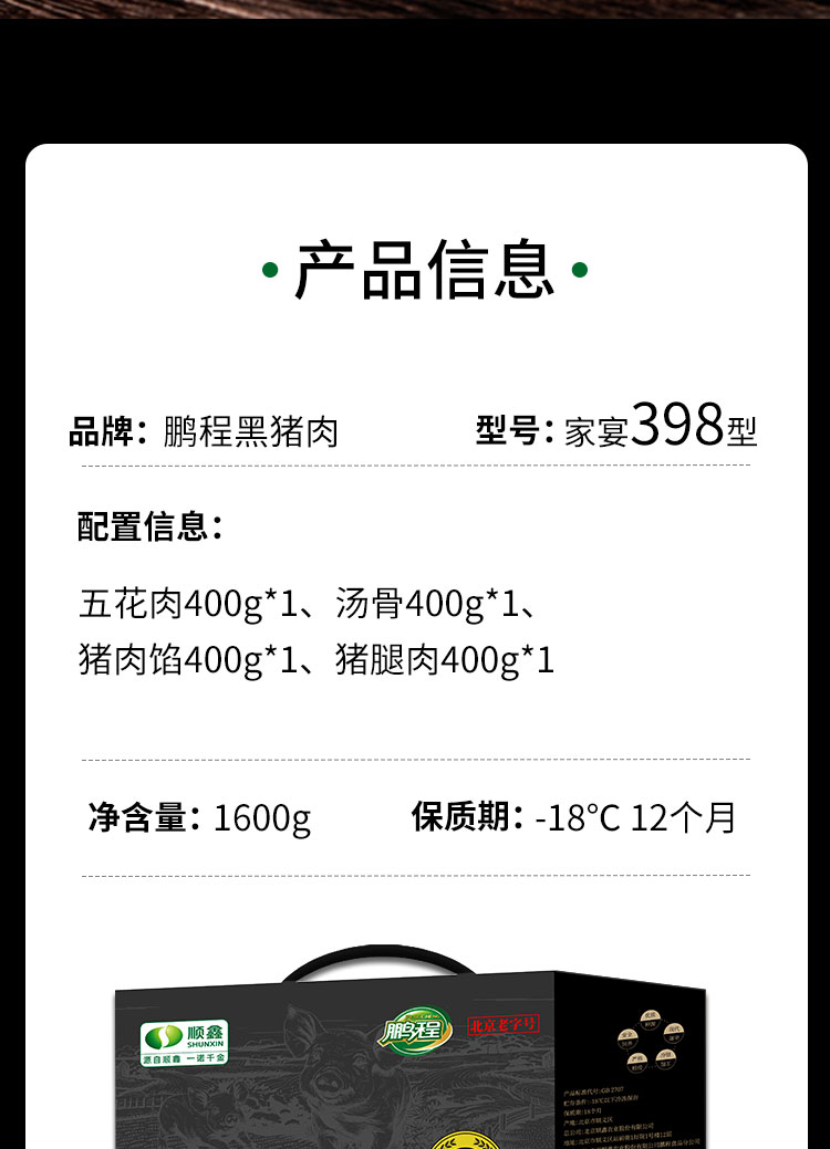 鹏程黑猪肉具有肉质紧实、脂肪含量低、口感细腻等特点,且注重无抗养殖和透明供应链管理 肉色鲜红,脂肪呈乳白色,具有明显大理石花纹,肉质细嫩有弹性 养殖周期12个月以上,采用中草药无抗饲料,全程透明可追溯 供应链覆盖种猪繁育、生猪养殖、屠宰加工至仓储物流,确保品质与安全 塞牧勒黑猪肉家宴礼盒398型 五花肉400g 汤骨400g 猪肉馅400g 猪腿肉400g