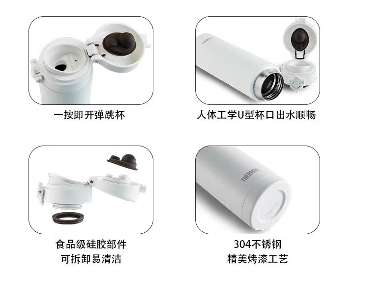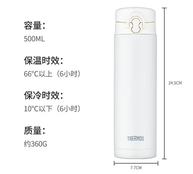 颜 色:BGD红色 MWH白色 NCGY灰色 NBLK黑色 容 量:500ml 类 型:弹盖杯 材 质:外管304不锈钢 内管:304不锈钢 食品级PP 食品级硅胶 保温时间: 66℃以上(6小时) 保冷时间: 10℃以下(6小时)