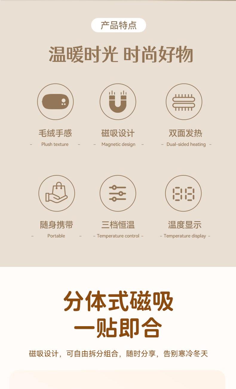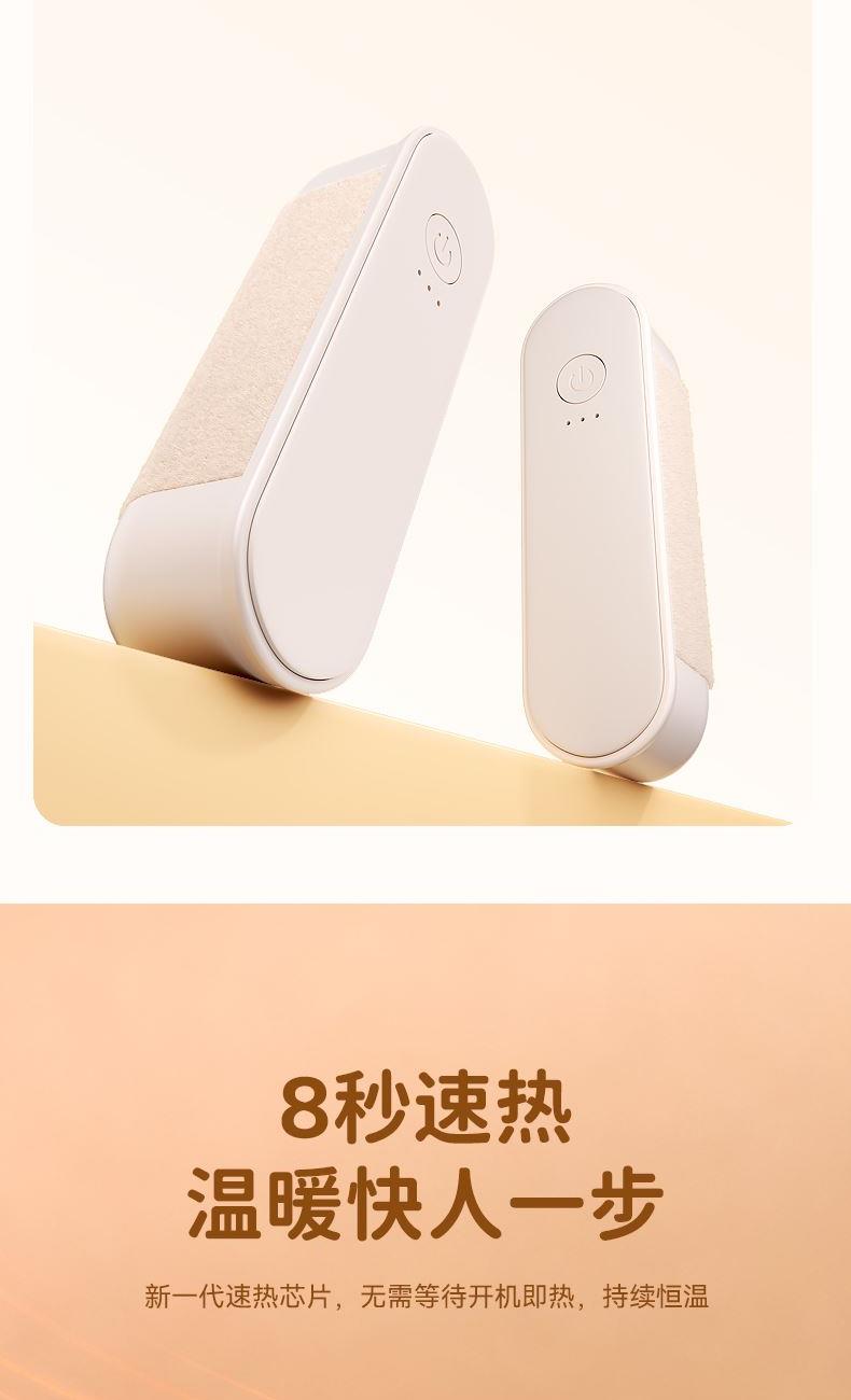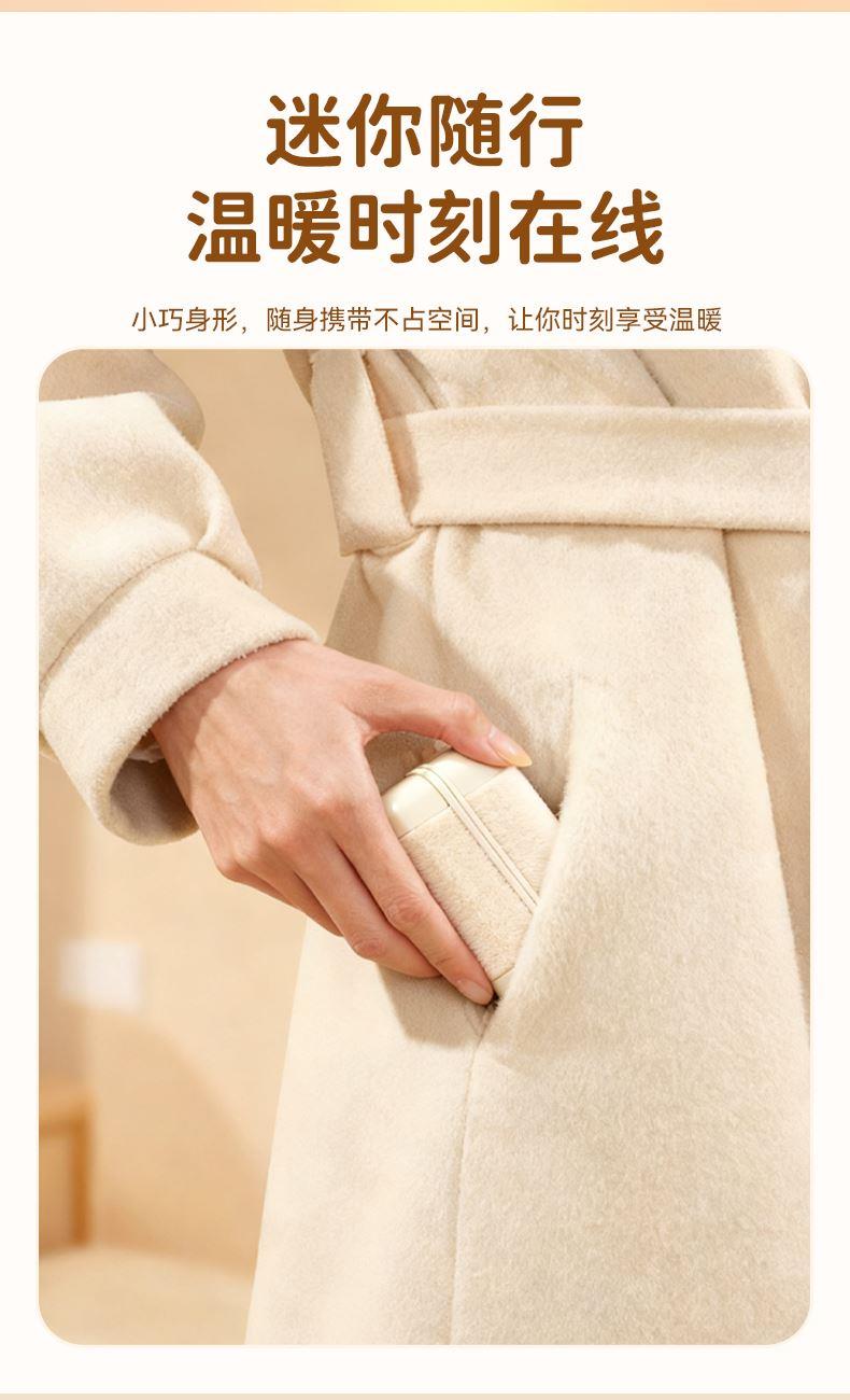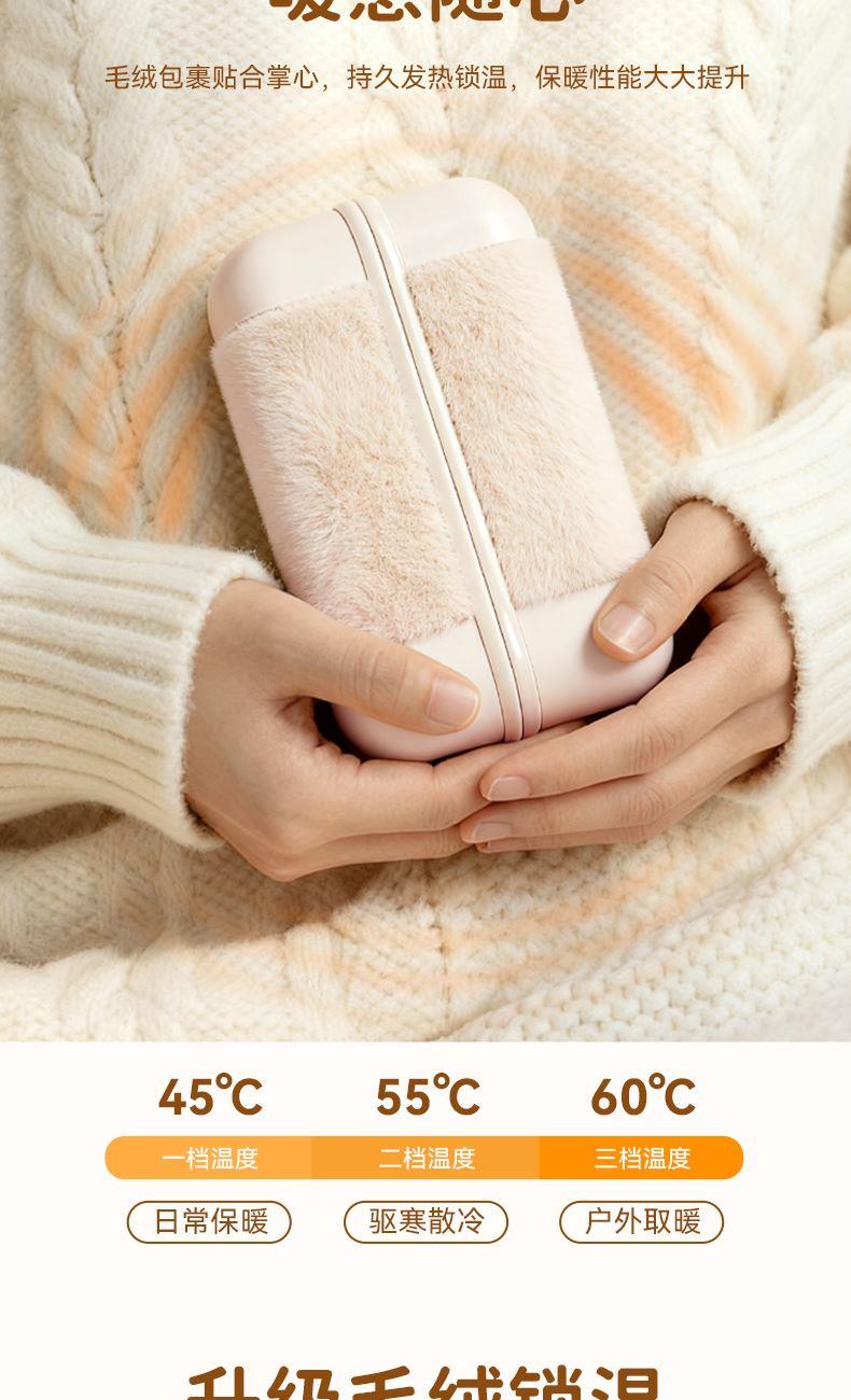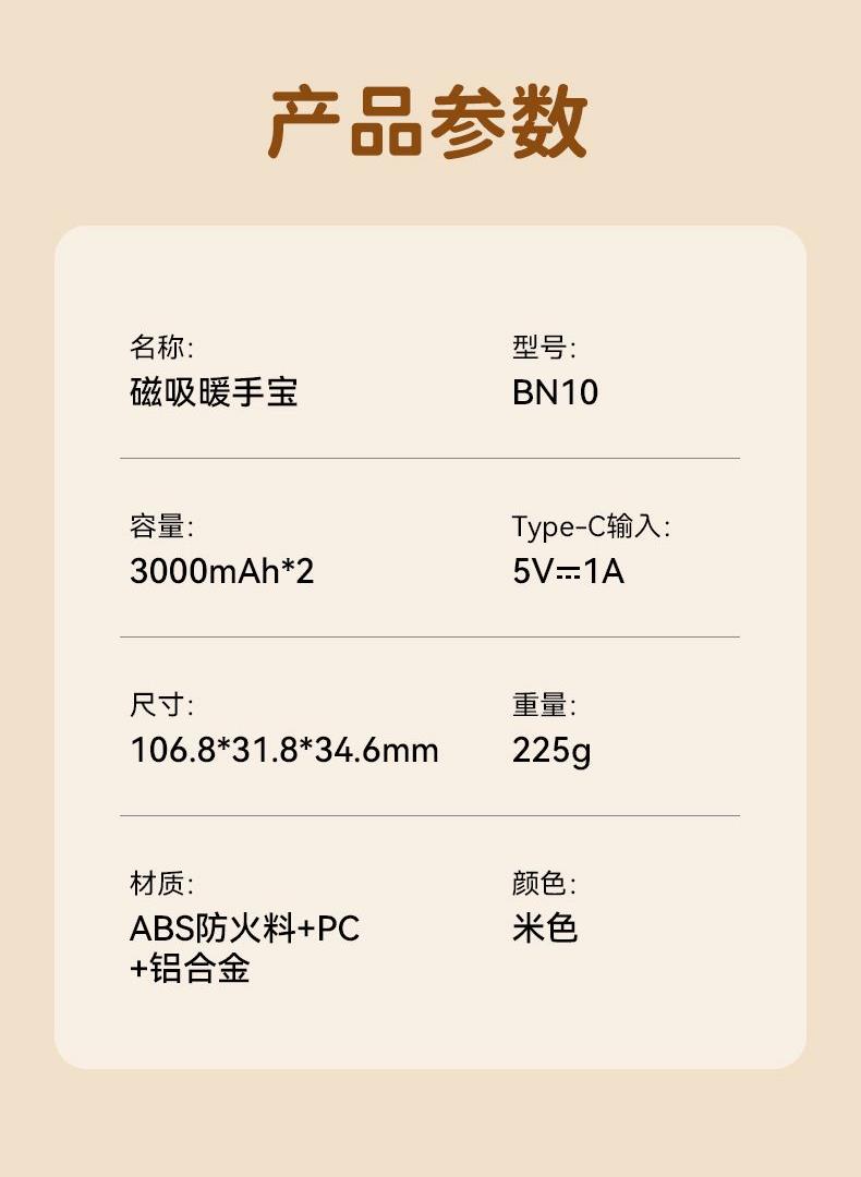 电池容量:3000*2mAh 产品尺寸:106.8*31.8*34.6mm 产品重量:225g 材质:ABS+铝合金+电子料 Type-C输入:5V/2A 额定功率:4.5W 充电:3.2H 续航:1档:7小时,2档:4.5小时,3档:3小时 颜色:米白色 材质:PC 双面毛绒触感,只手可握 采用PET发热膜双面发热,安全、可靠,使用寿命长 智能恒温三档可调温度: 45℃ 55℃ 60℃双面发热 理论发热时间3-7小时
