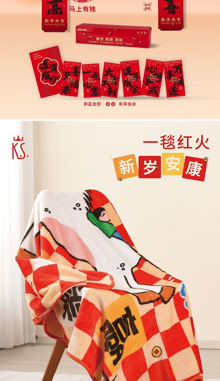 围巾30*170cm、99.9%涤纶 毛毯/95x148cm、 300克涤纶针织布 钥匙扣:绳长100mm、亚克力直径55mm 亚克力 春联/福贴*1副(157G铜版纸) 窗花/pvc10丝带纸140G静电膜23.5*23.5cm 红包/铜版纸200g 传统福禄纹样烫金纸盒,设计轻盈便携,年味洋溢,传递真挚祝福。 满足企业员工福利、普适客户问候等广谱送礼需求,彰显贴心关怀。 精选传统年味春联、红包、窗花与零食礼盒构成经典组合,并搭配实用好物(钥匙扣、格纹围巾、躺赢毯),支持产品替换,灵活自由。 支持小批量灵活定制,打造专属年礼,彰显诚意。 以下代发价不含偏远地区:黑龙江、吉林、内蒙古、青海、云南、宁夏、海南、贵州、甘肃、新疆,(西藏地区按官网核价)