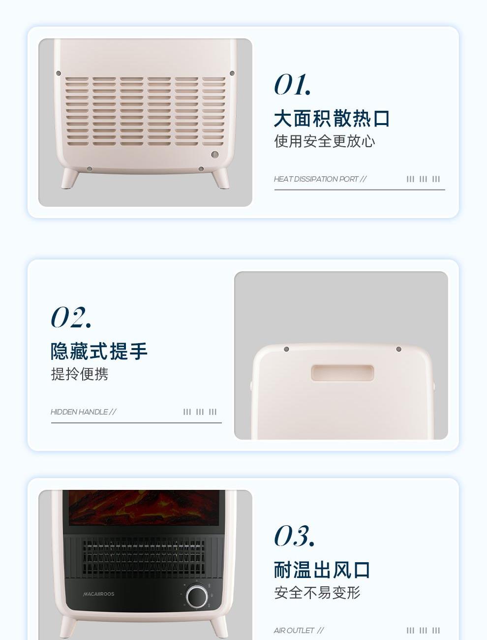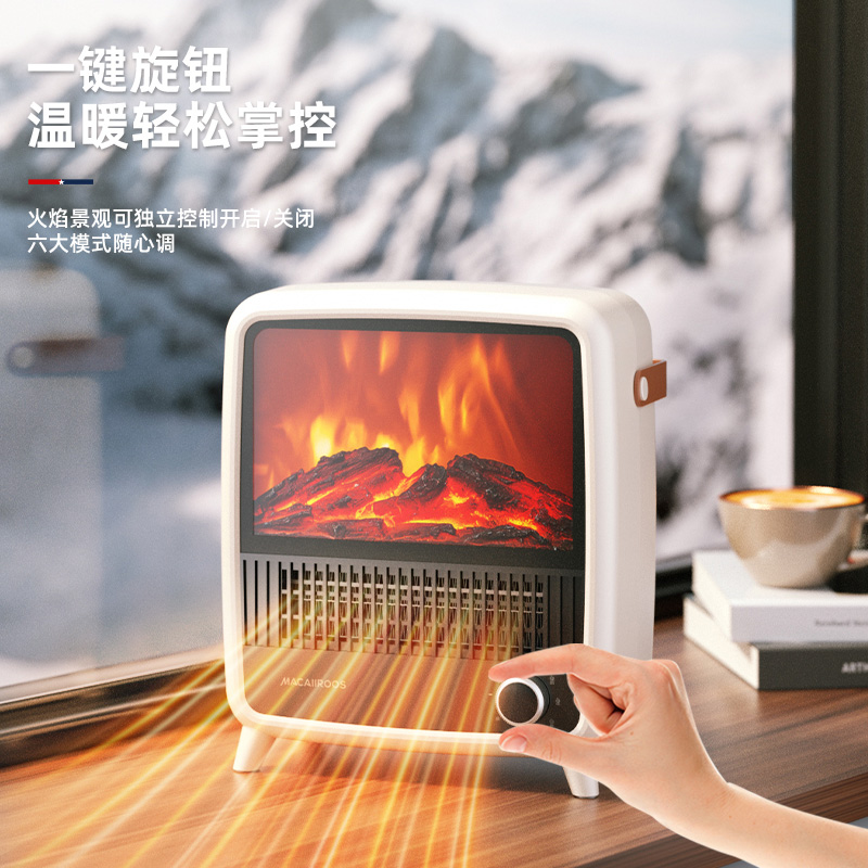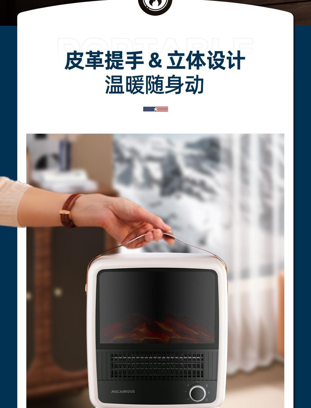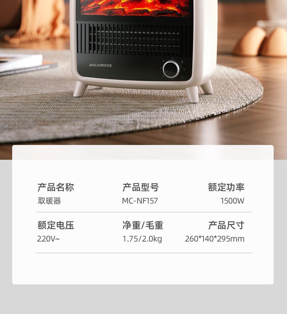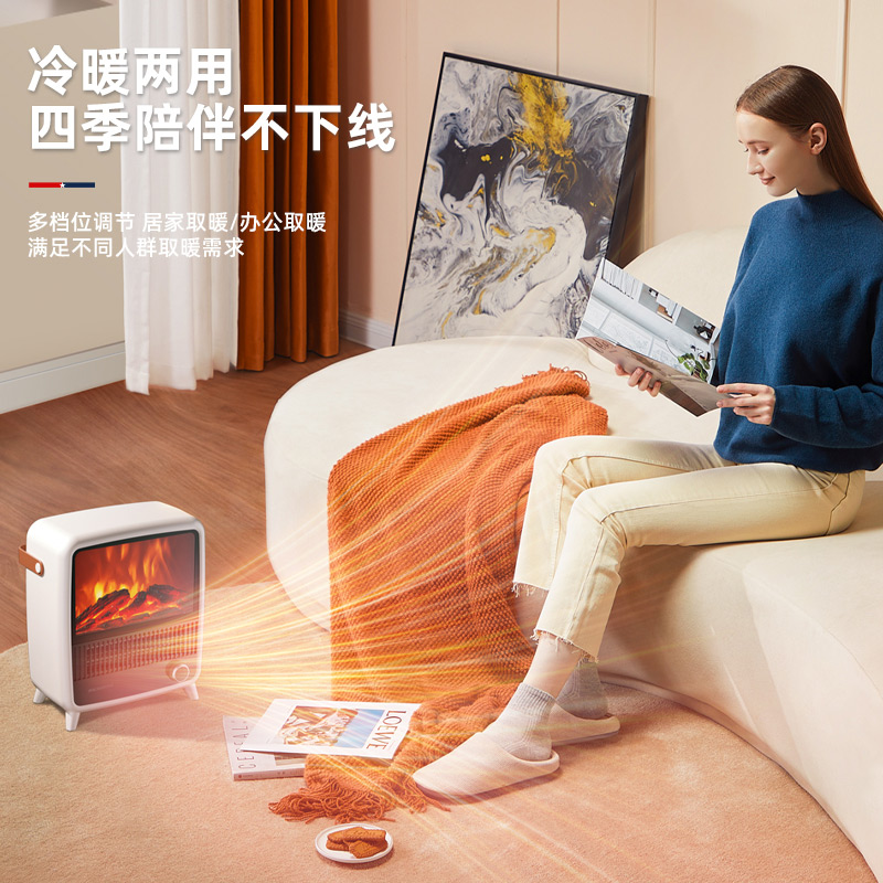 额定功率:1500W 功 能:保暖/制冷 额定电压:220V~ 产品频率:50Hz 产品净重:1.75kg 产品毛重:2.0kg 整箱重量:17.4kg 装 箱 数:8台/箱 PTC陶瓷发热 发热快速,经久耐用;具有冷风、低热、高热三挡风温; 3秒速热一键旋钮控制,3秒暖意速达,热空气充分流动,暖意充盈满屋; 3D炭火动态视觉还原壁炉焰火景观,营造炉火取暖氛围;PU皮革提手灵活便携; 安全运行高温过热、倾倒自动断电,为安全保驾护航。