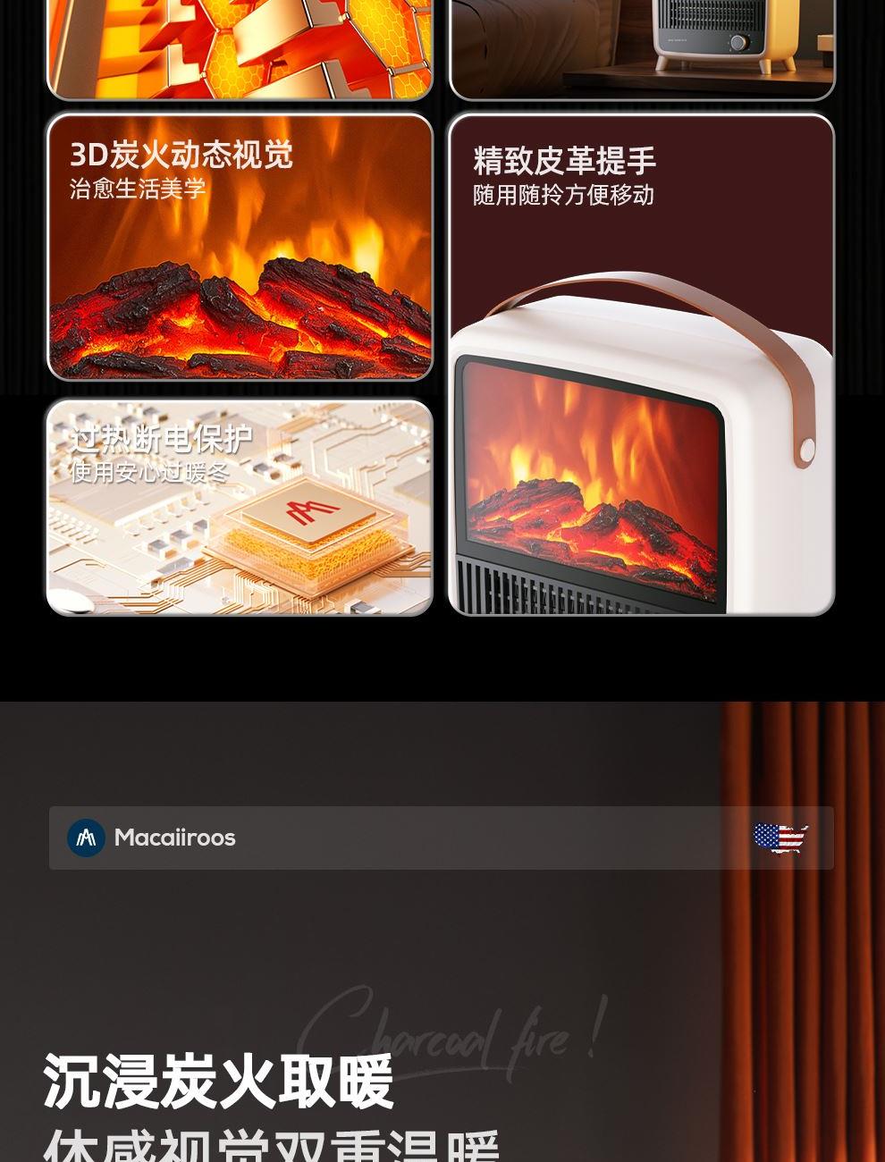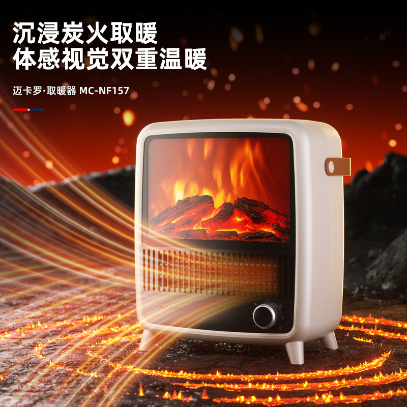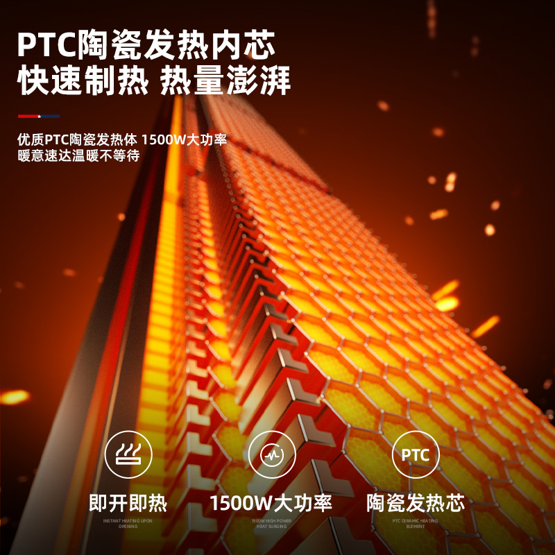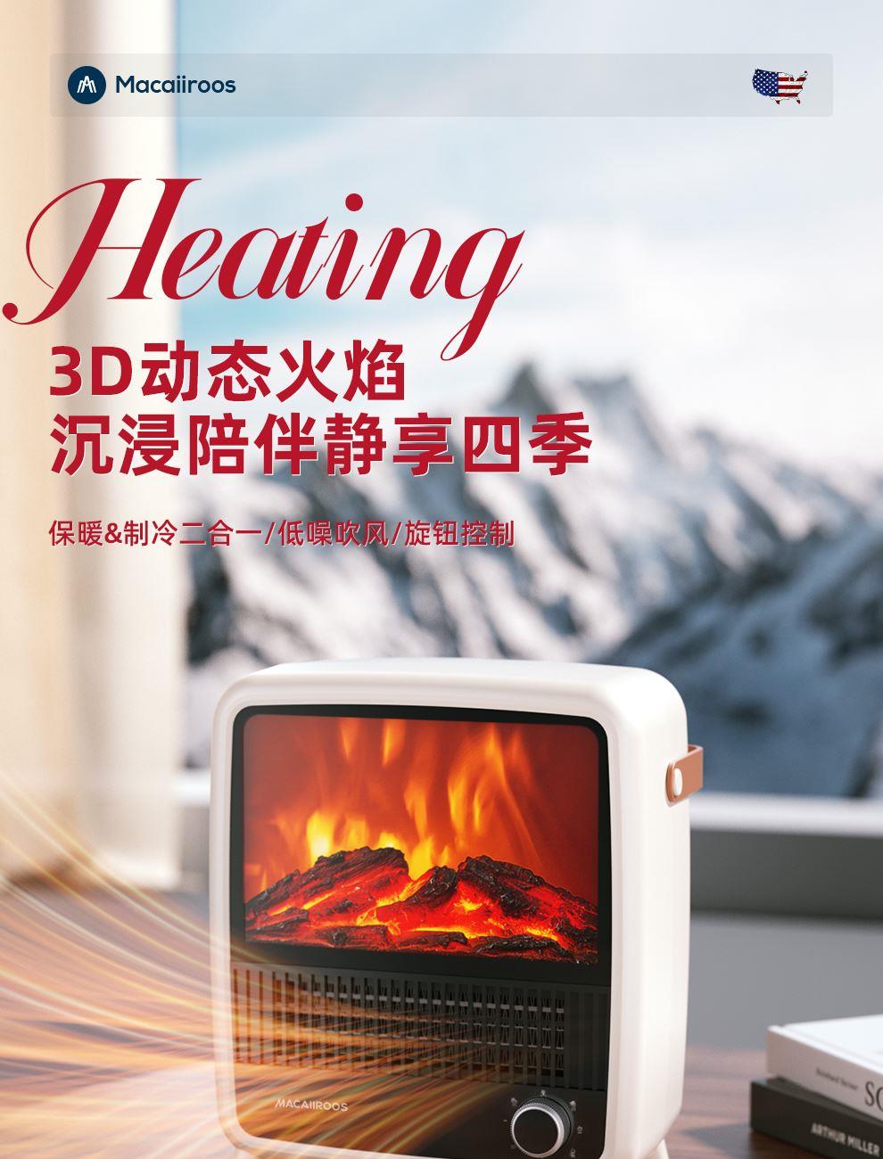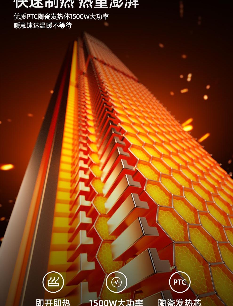额定功率:1500W 功 能:保暖/制冷 额定电压:220V~ 产品频率:50Hz 产品净重:1.75kg 产品毛重:2.0kg 整箱重量:17.4kg 装 箱 数:8台/箱 PTC陶瓷发热 发热快速,经久耐用;具有冷风、低热、高热三挡风温; 3秒速热一键旋钮控制,3秒暖意速达,热空气充分流动,暖意充盈满屋; 3D炭火动态视觉还原壁炉焰火景观,营造炉火取暖氛围;PU皮革提手灵活便携; 安全运行高温过热、倾倒自动断电,为安全保驾护航。