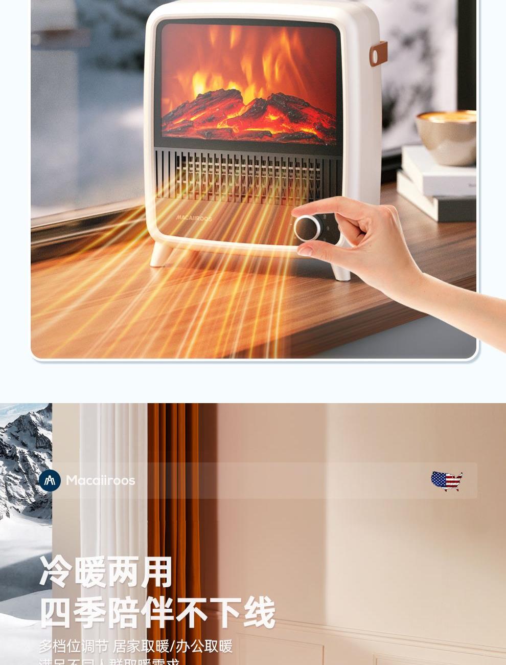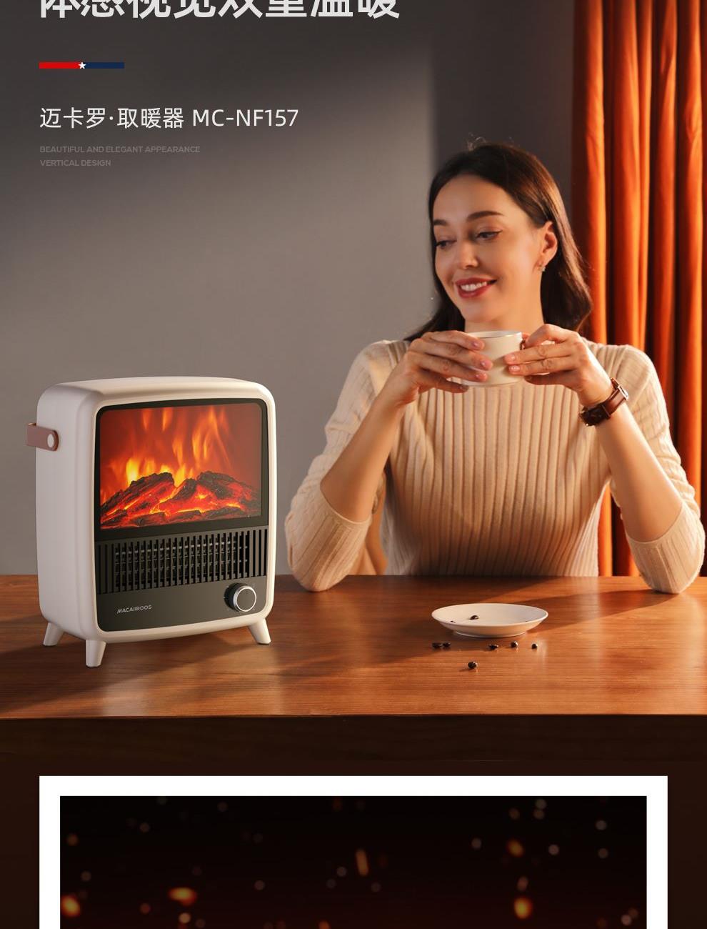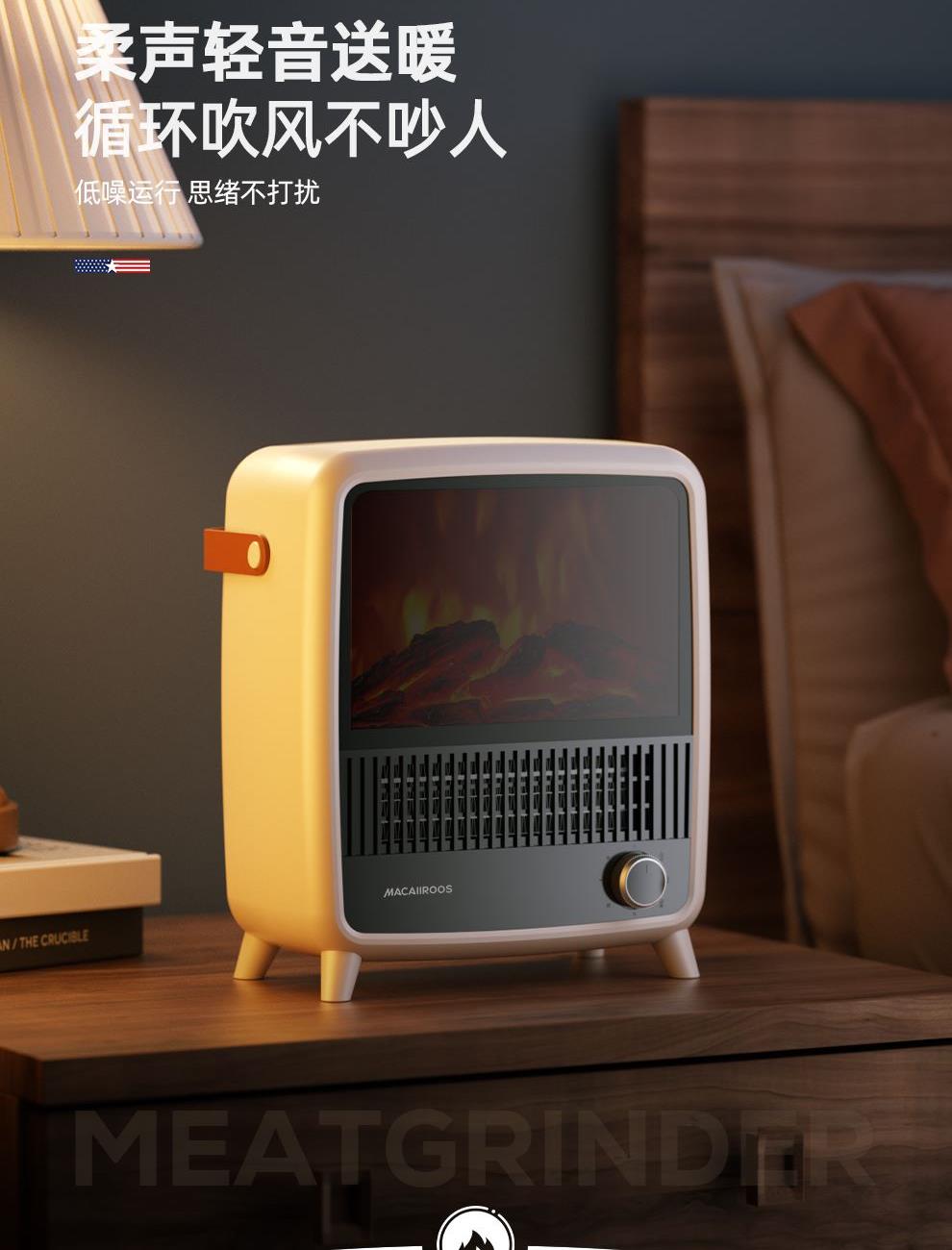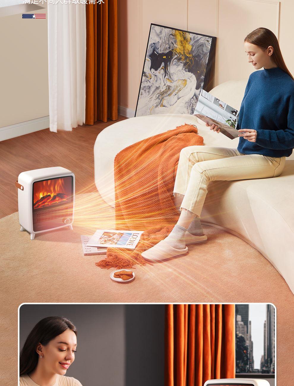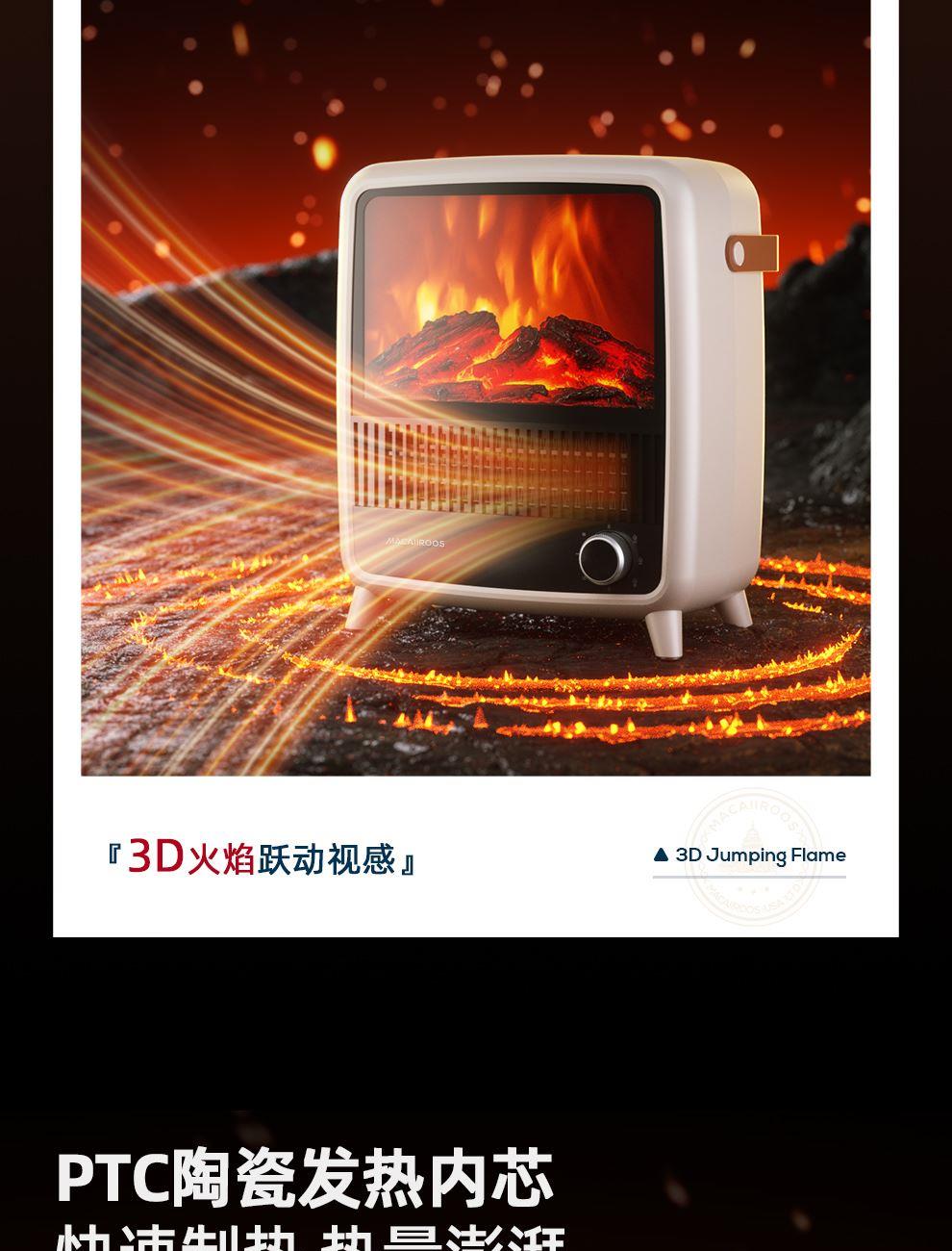 额定功率:1500W 功 能:保暖/制冷 额定电压:220V~ 产品频率:50Hz 产品净重:1.75kg 产品毛重:2.0kg 整箱重量:17.4kg 装 箱 数:8台/箱 PTC陶瓷发热 发热快速,经久耐用;具有冷风、低热、高热三挡风温; 3秒速热一键旋钮控制,3秒暖意速达,热空气充分流动,暖意充盈满屋; 3D炭火动态视觉还原壁炉焰火景观,营造炉火取暖氛围;PU皮革提手灵活便携; 安全运行高温过热、倾倒自动断电,为安全保驾护航。