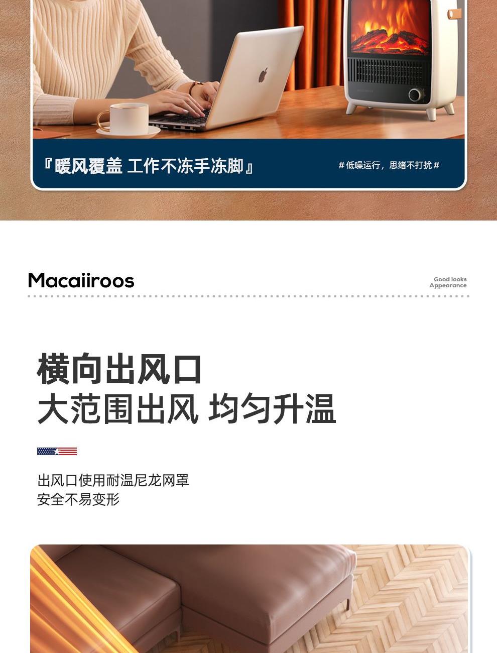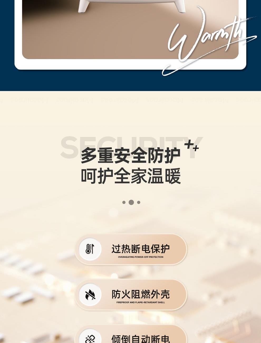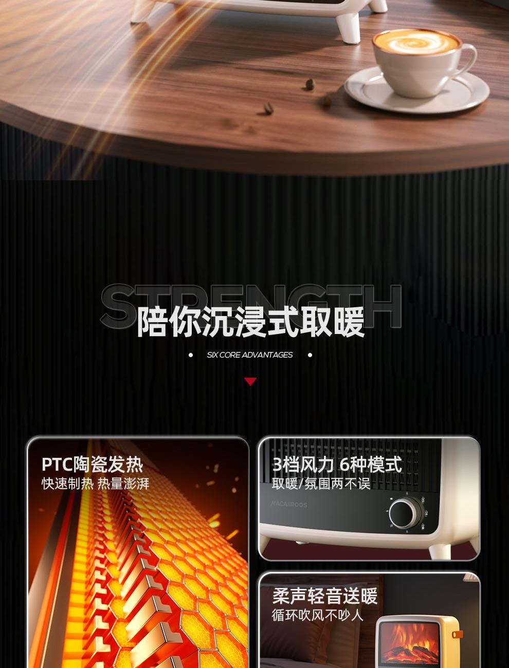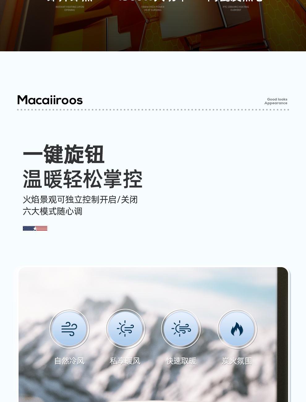 额定功率:1500W 功 能:保暖/制冷 额定电压:220V~ 产品频率:50Hz 产品净重:1.75kg 产品毛重:2.0kg 整箱重量:17.4kg 装 箱 数:8台/箱 PTC陶瓷发热 发热快速,经久耐用;具有冷风、低热、高热三挡风温; 3秒速热一键旋钮控制,3秒暖意速达,热空气充分流动,暖意充盈满屋; 3D炭火动态视觉还原壁炉焰火景观,营造炉火取暖氛围;PU皮革提手灵活便携; 安全运行高温过热、倾倒自动断电,为安全保驾护航。
