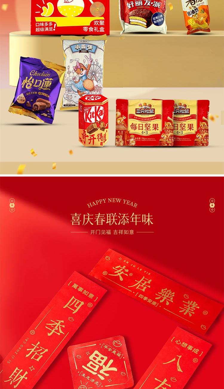 内含经典春联红包套装,零食礼盒、求签桶、针织围巾。