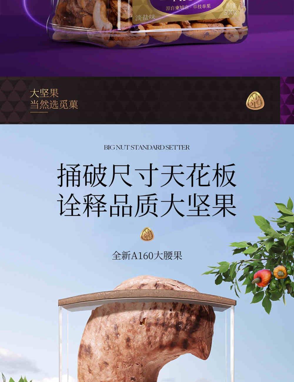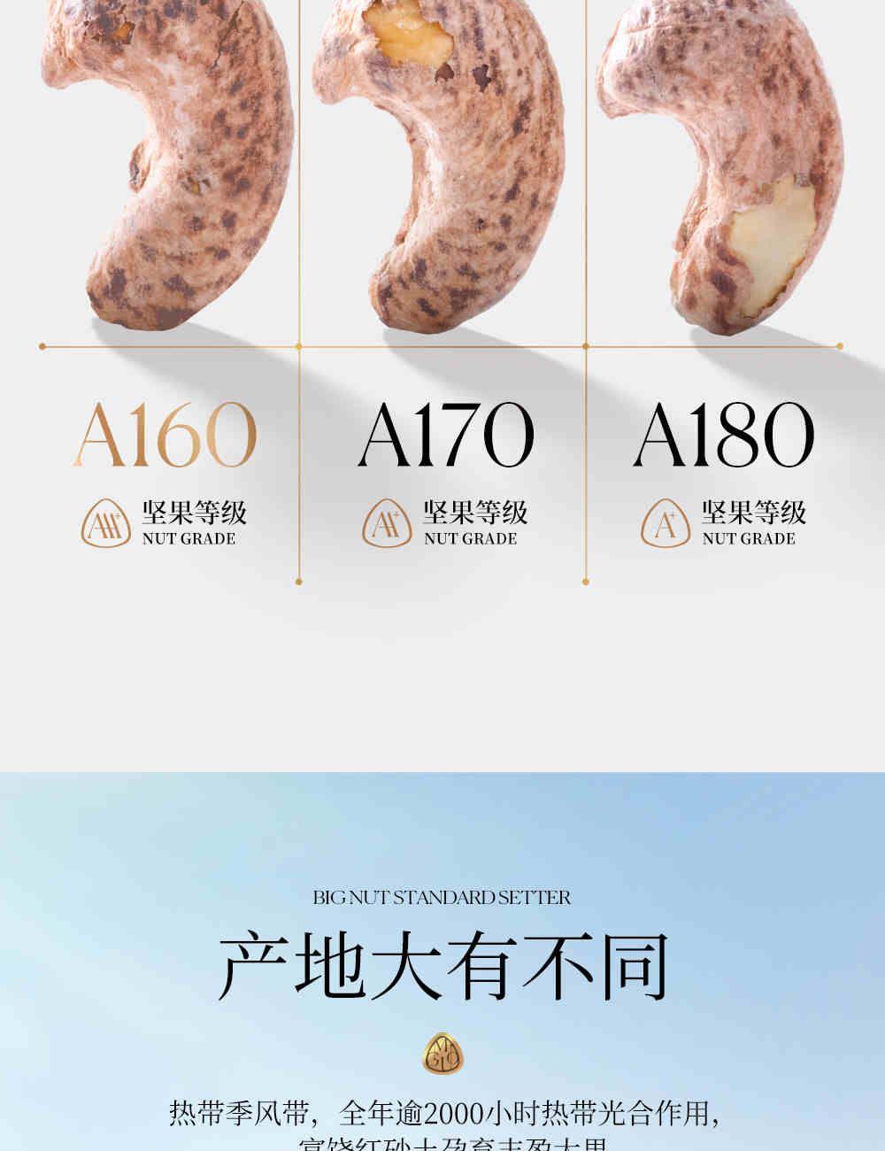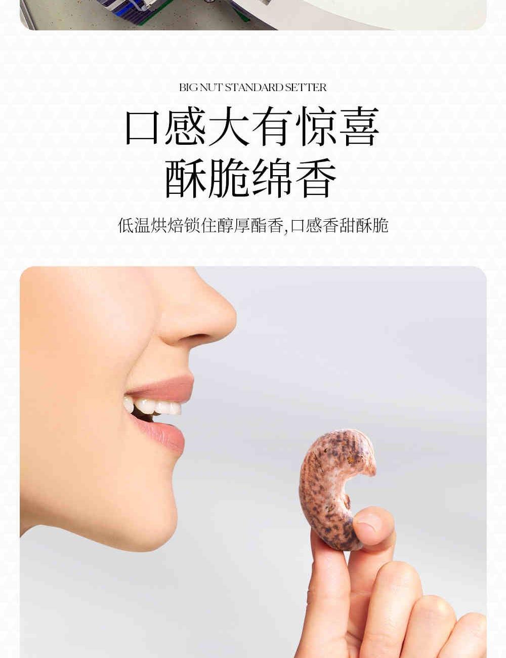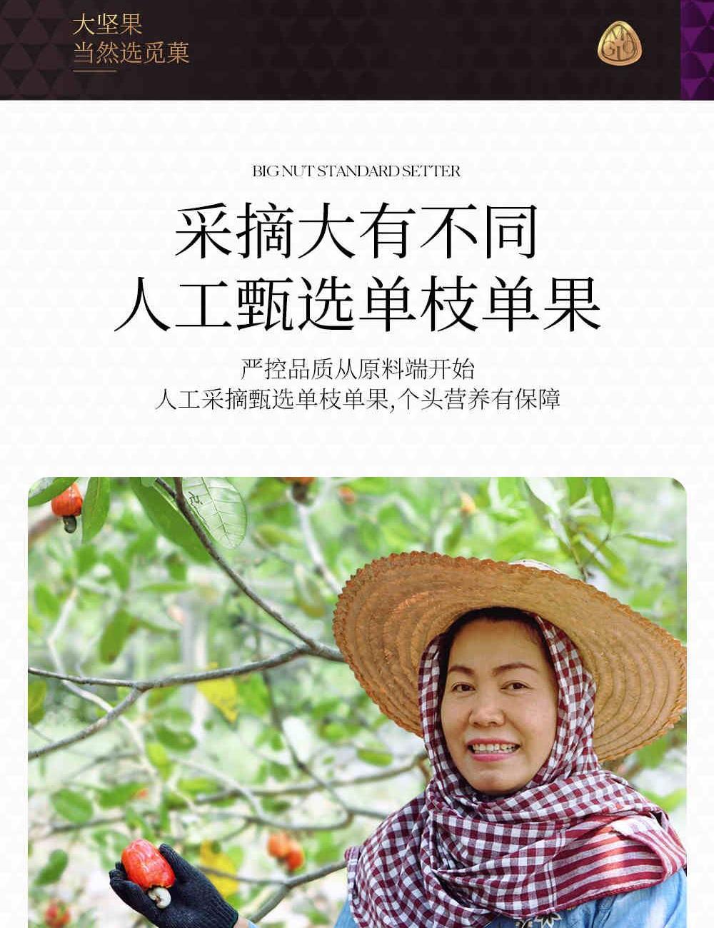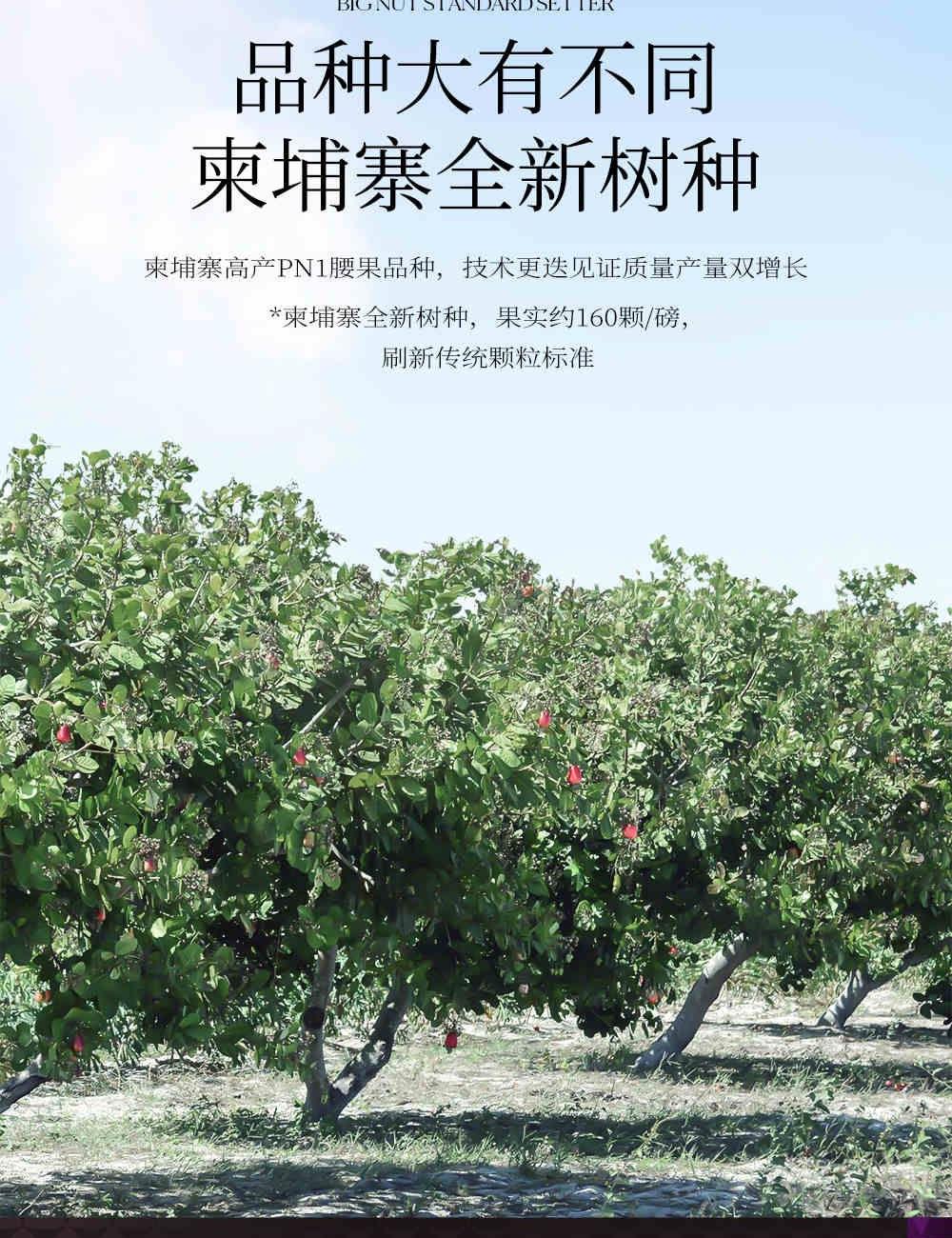 1、热带季风带 全年逾2000小时光合作用 富饶红砂土孕育丰盈大果 2、柬埔寨高产PN1腰果品种 技术更迭见证质量产量双增长 柬埔寨全新树种 果实约160颗/磅 刷新传统颗粒标准 3、低温烘焙锁住醇厚酯香 酥脆绵香 香甜酥脆
