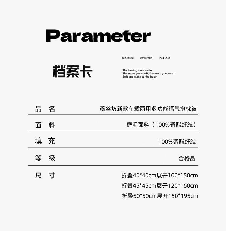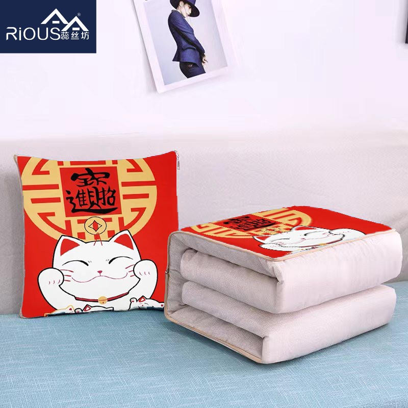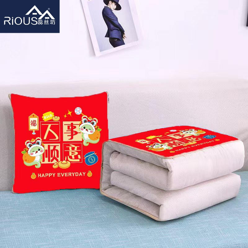 花色:发财蛇、福到我家、福气蛇、金蛇送福、如意蛇、万事顺意、暴富、财运猫、福气满满、好事发生、好运、招财猫、加油鸭 规格:折叠40*40cm展开100*150cm 面料:磨毛面料(聚酯纤维) 填充:聚酯纤维 抱枕被设计,一枕多用,可做靠枕,打开可做被子,用途广泛,携带方便。采用磨毛面料,亲肤透气,填用优质整张聚脂纤维,不易变形。活性印染,不起球,不脱色,拉链顺滑。