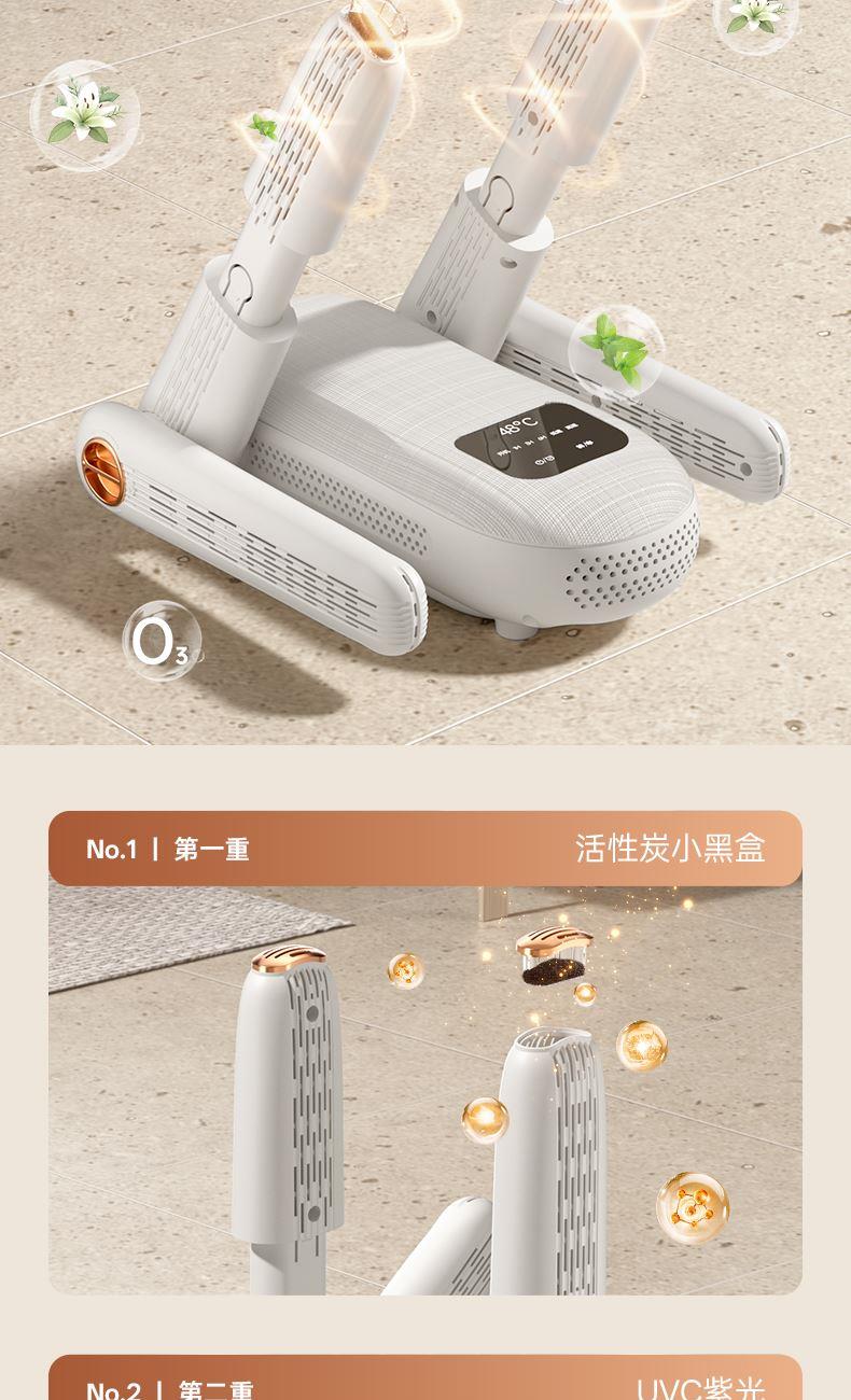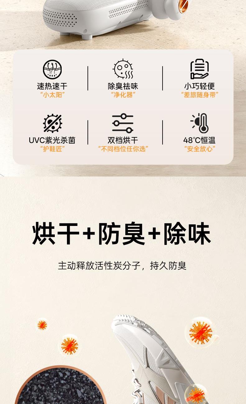速干,祛味,小巧,主动释放活性炭分子,吸附鞋内异味,持久防臭,烘干+防臭+除味,