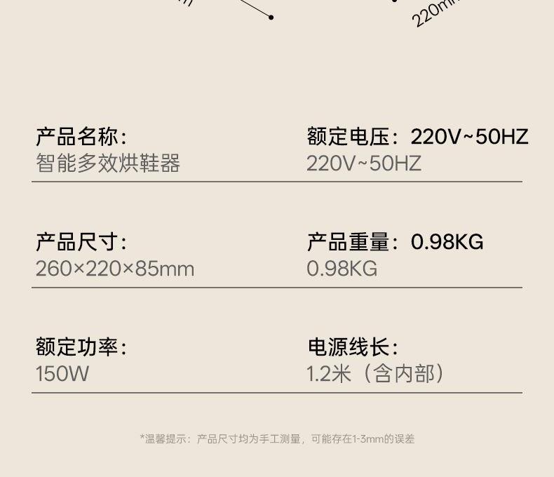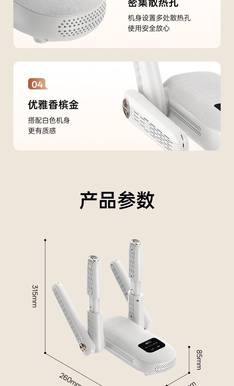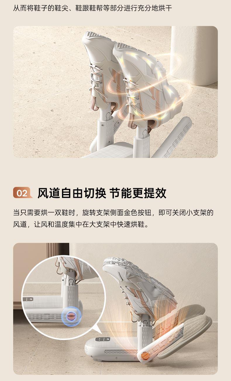 10分钟闪烘 速干,一次可以烘两双,密集出风孔设计,优化风道,实现360度环绕出风,鞋跟不漏烘, 风道自由切换,节能更高效,