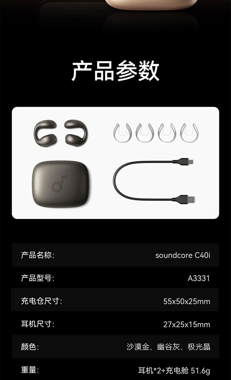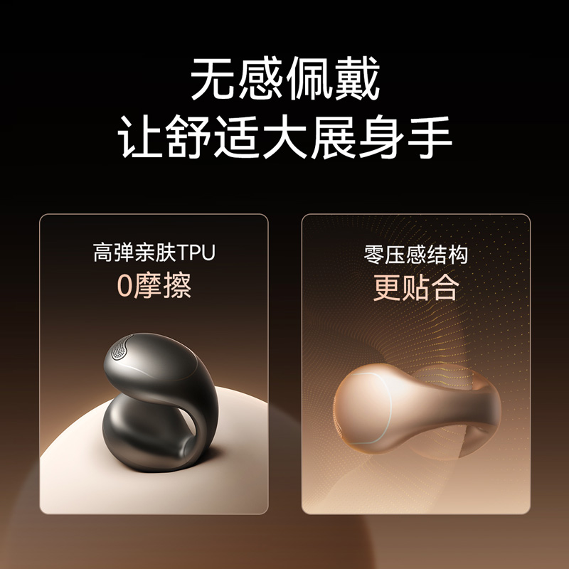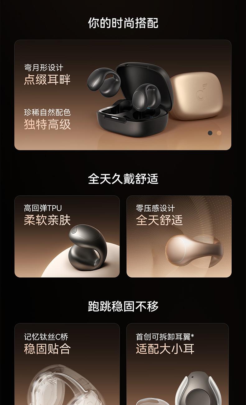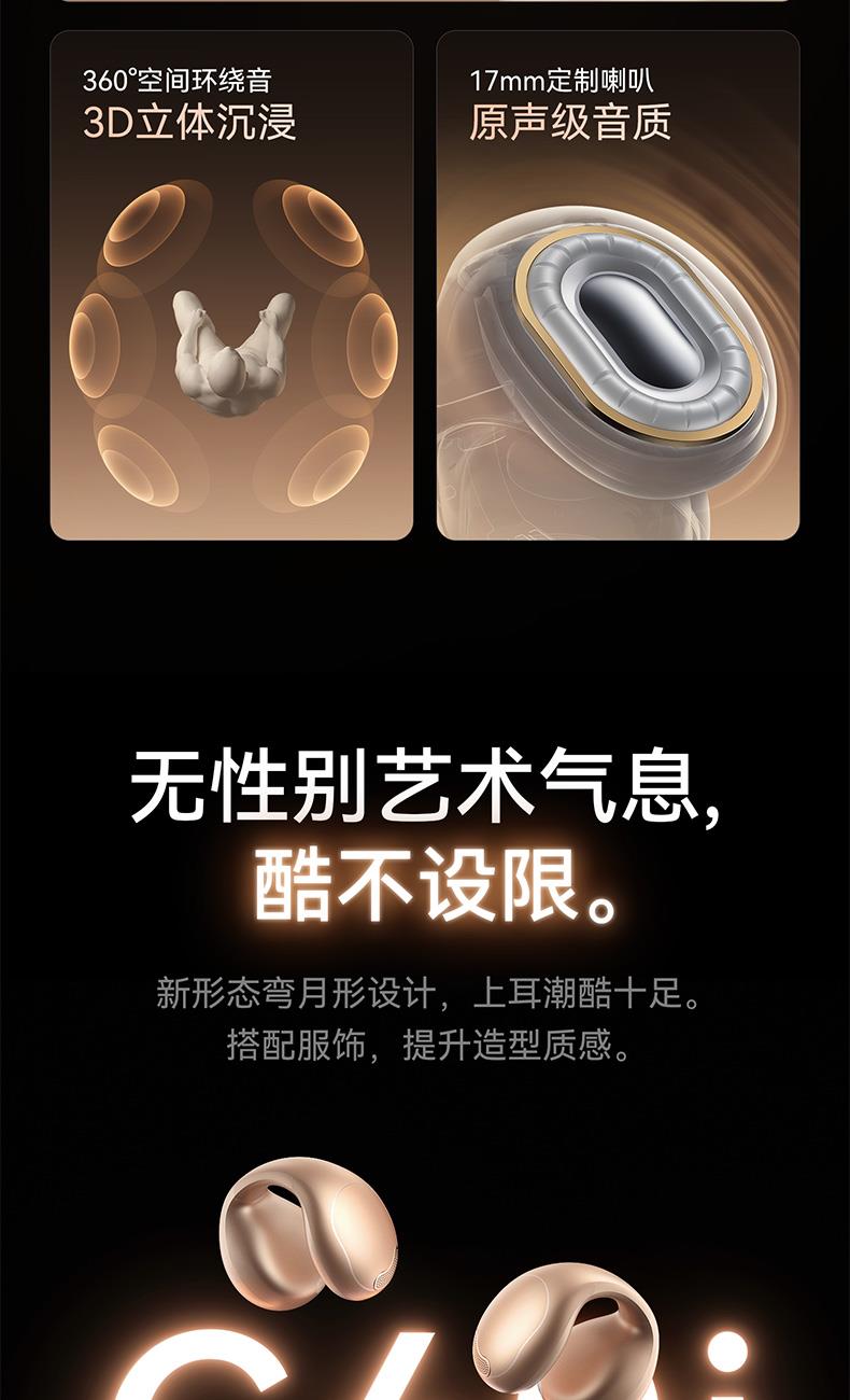 1、耳夹式不入耳,不闷堵舒适聆听 2、 零压感设计,全天候舒适佩戴 3、 记忆钛丝软胶,自适应贴合耳廓 4、 首创透明耳翼,适配不同耳型 5、 17mm跑道型喇叭,音质立体澎湃 6、 总续航21小时,日夜随心听