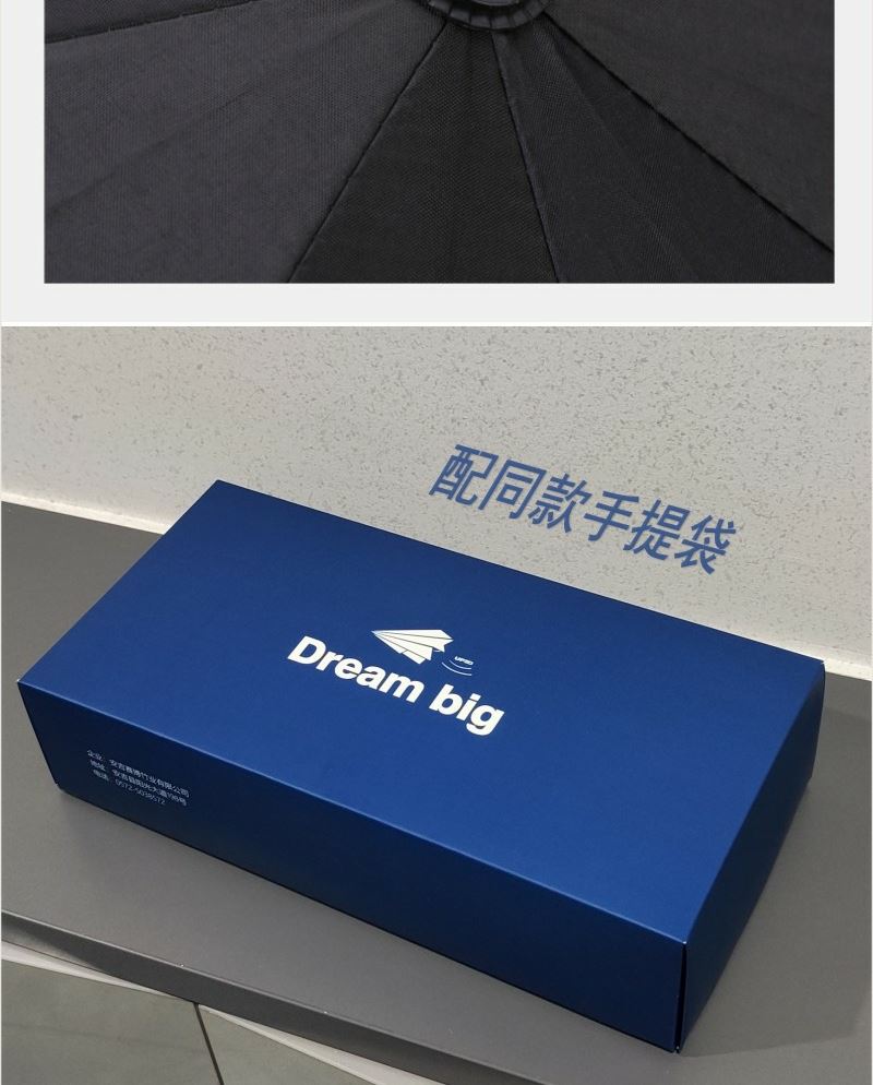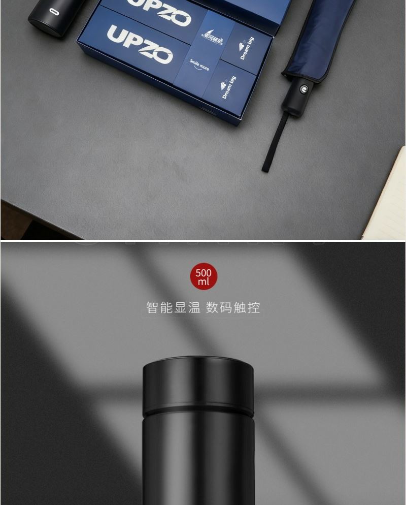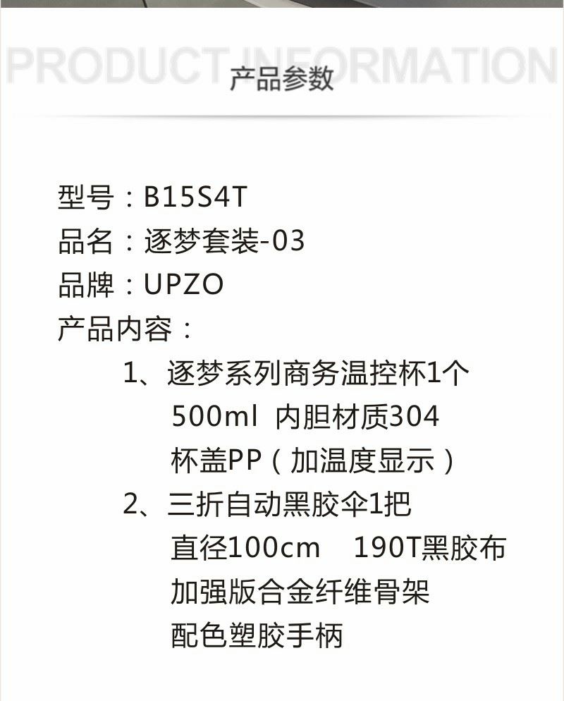 产品内容: 三折自动黑胶伞 规格:直径100CM 伞架:加强版合金纤维骨架 面料:190T黑胶布 手柄:配色塑胶手柄 逐梦系列商务温控杯 材质: 内胆材质304 杯盖PP (加温度显示) 容量: 500ML 礼盒:29.5*15*7CM