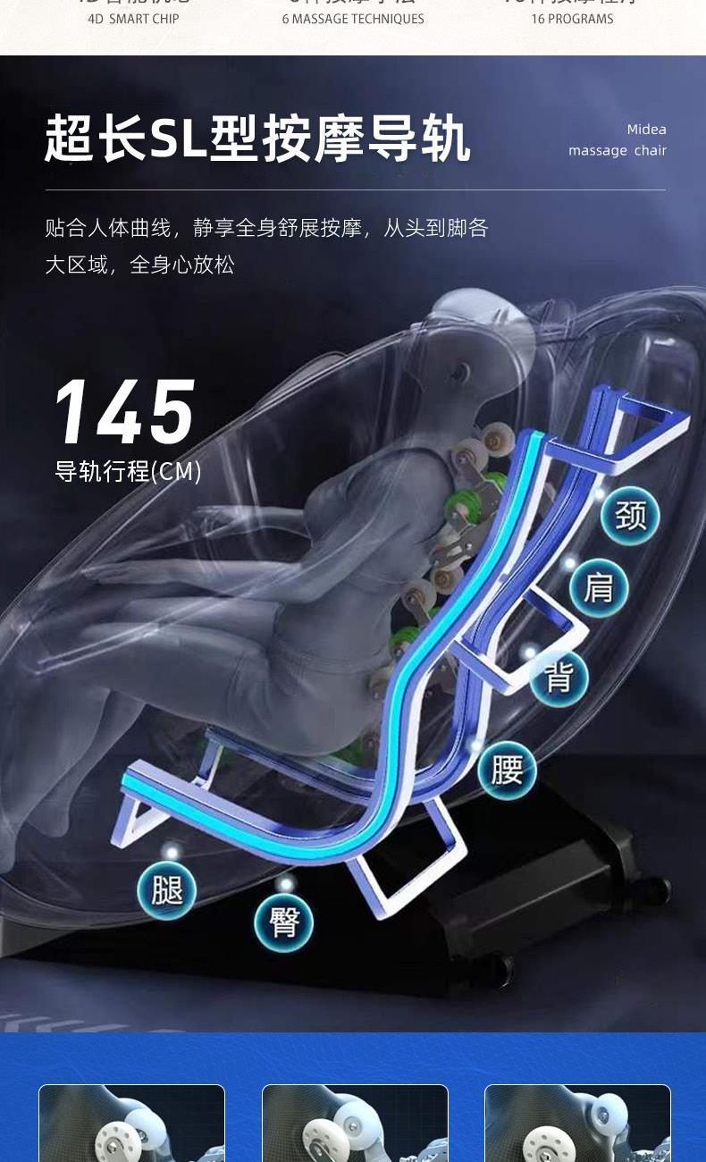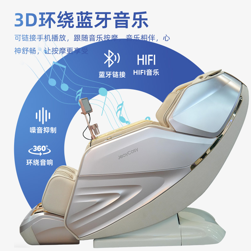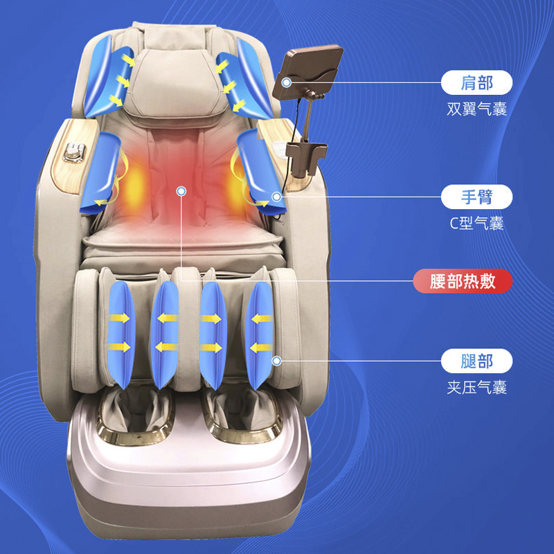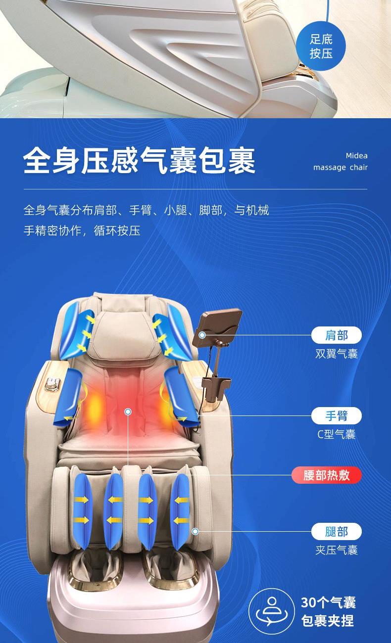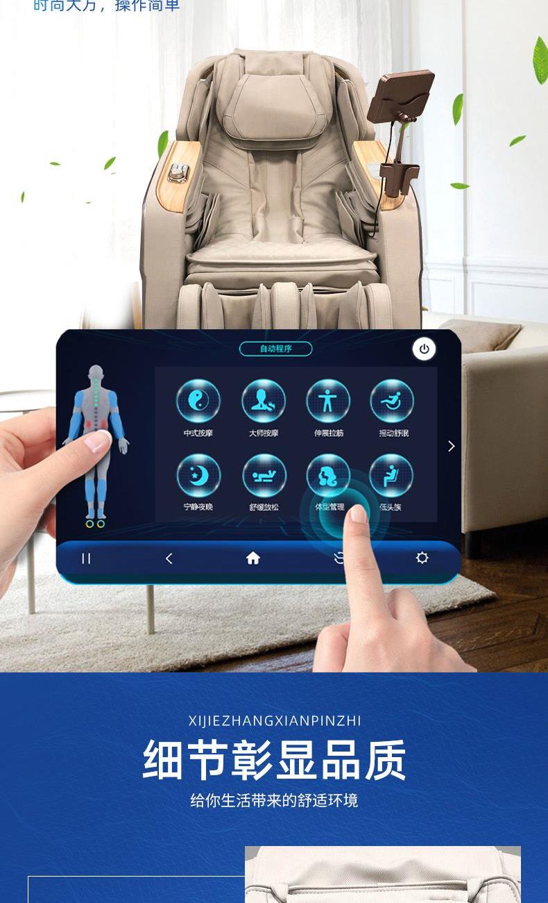 1、超长SL型按摩导轨,贴合人体曲线,静享全身舒展按摩 2、全身气囊分布肩部、手臂、小腿、脚部,与机械手精密协作,循环按压 3、3D环绕蓝牙音乐,让按摩更享受 4、6种按摩手法,16大按摩程序,触控屏幕,操作简单
