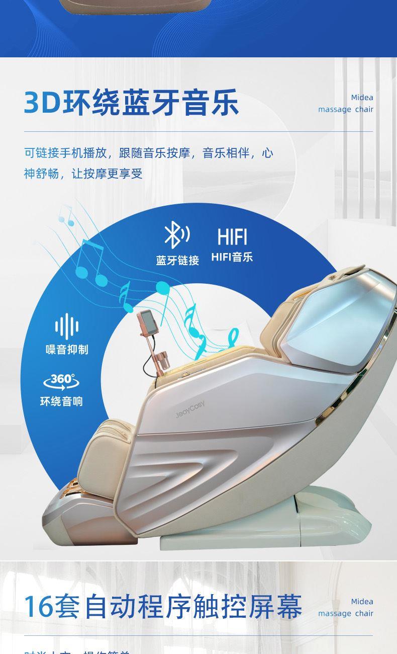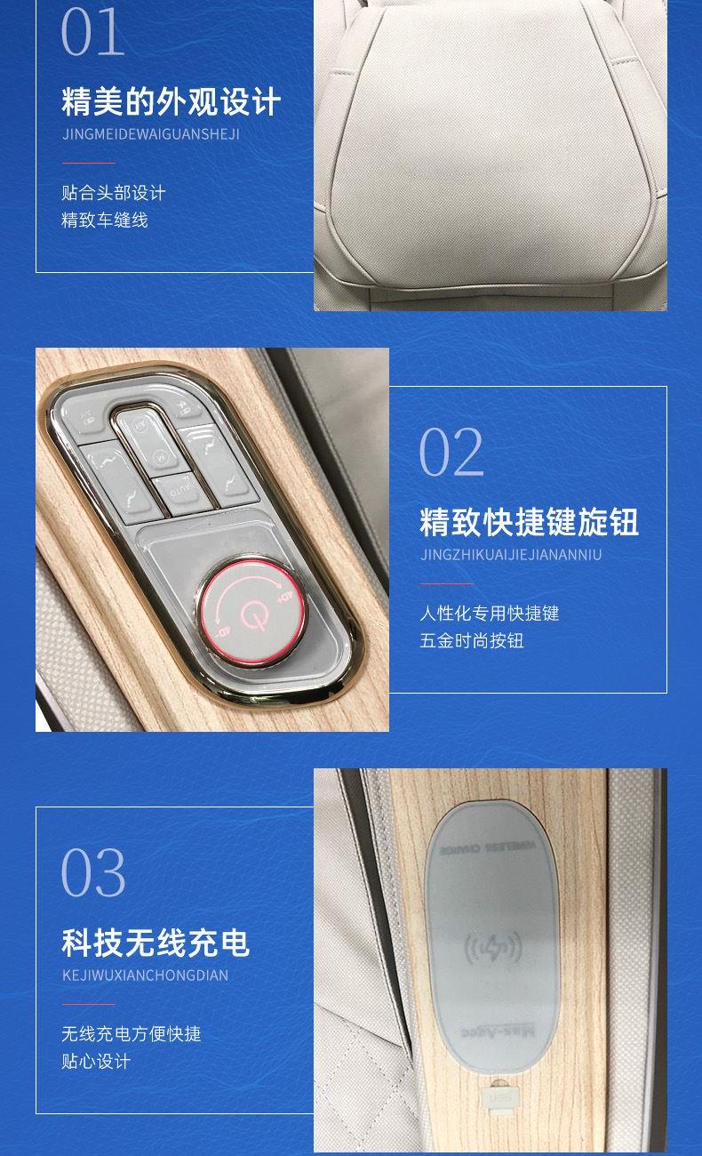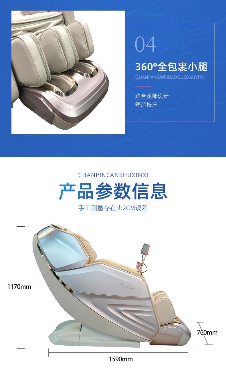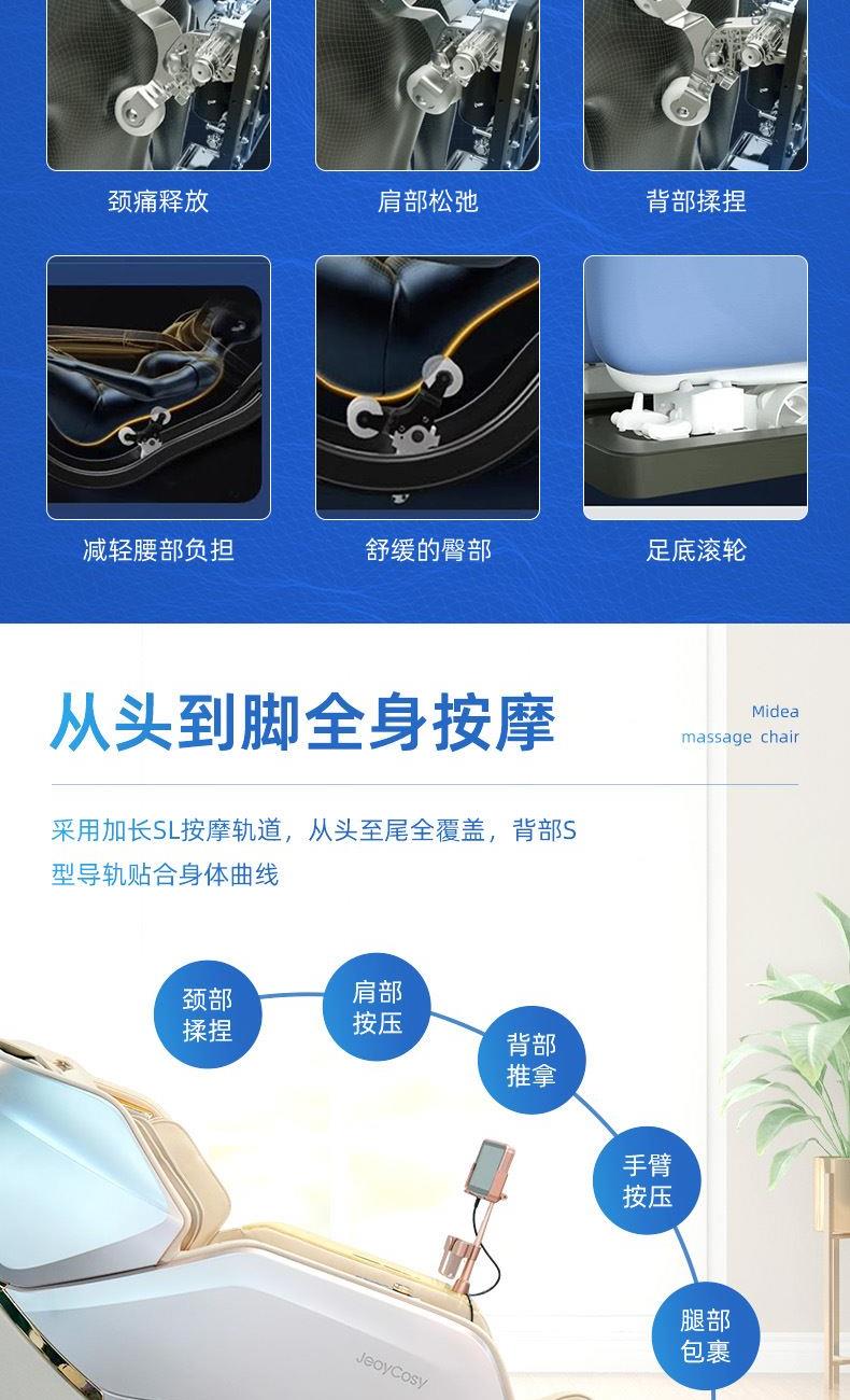 1、超长SL型按摩导轨,贴合人体曲线,静享全身舒展按摩 2、全身气囊分布肩部、手臂、小腿、脚部,与机械手精密协作,循环按压 3、3D环绕蓝牙音乐,让按摩更享受 4、6种按摩手法,16大按摩程序,触控屏幕,操作简单