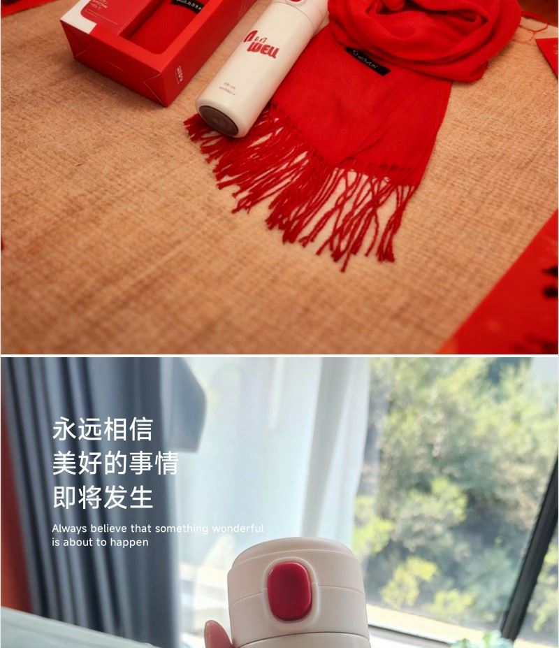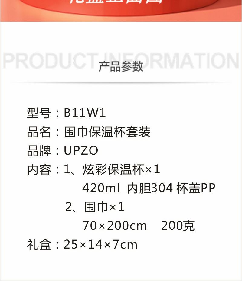 围巾:成份: 聚酯纤维 规格: 70cm×200cm×1条 克重: 200克每条 保温杯:材质: 内胆材质304 杯盖PP 容量: 420ML 礼盒: 25×14×7cm
