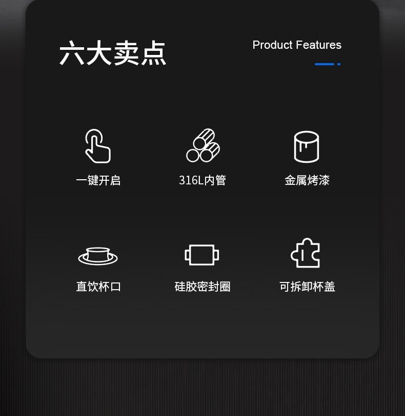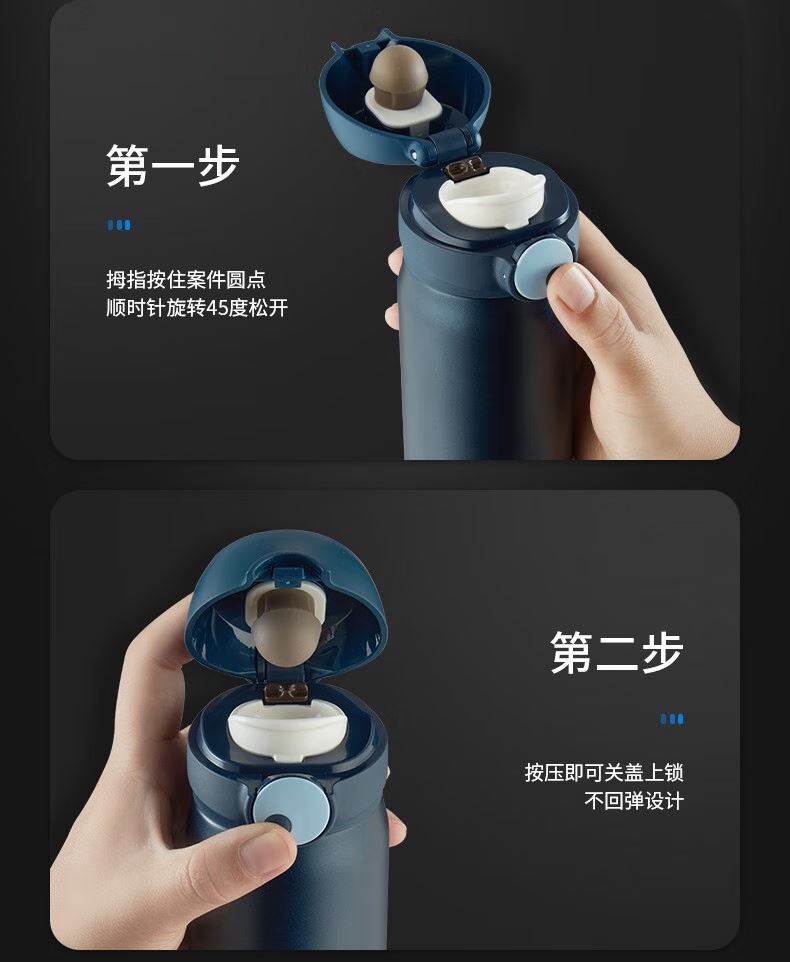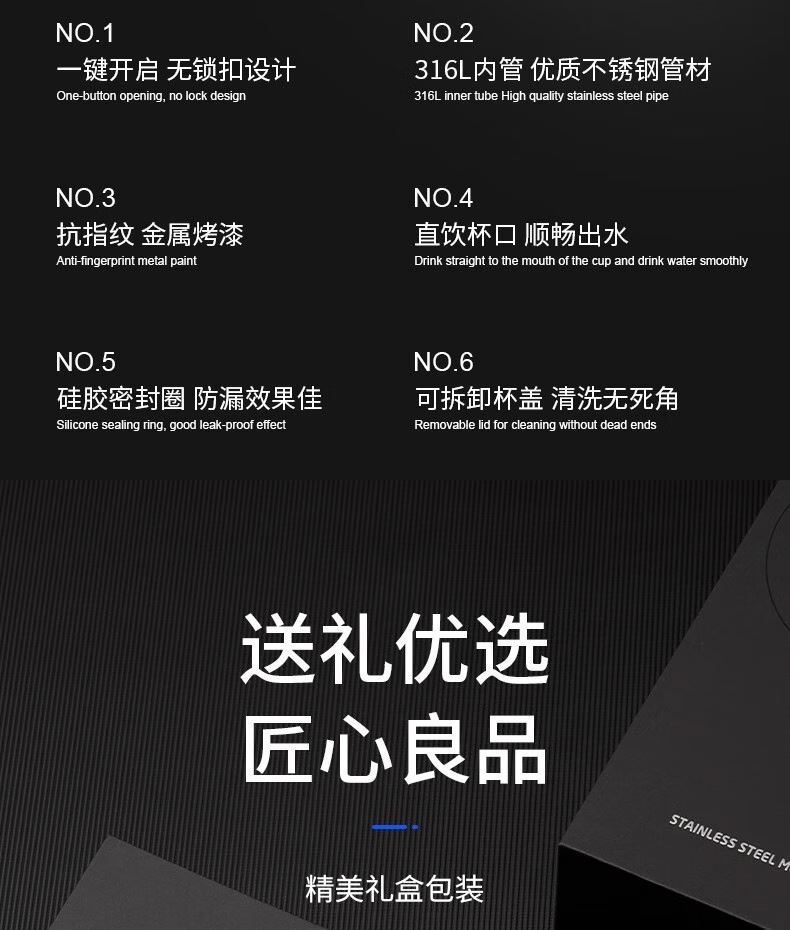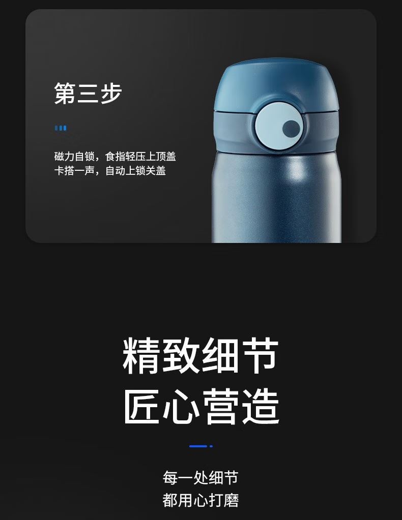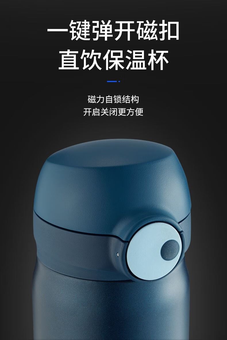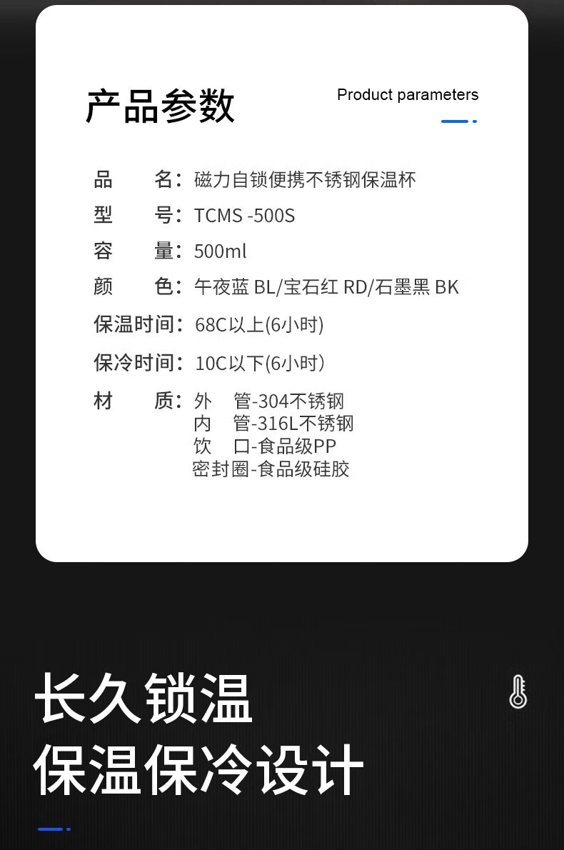开盖特点:磁力自锁 颜 色:RD宝石红/BL午夜蓝/BK石墨黑 容 量:500ml 保温效力:68C以上(6小时) 保冷效力:10C以下(6小时) 外管材质:304不锈钢 内管材质:316L不锈钢 密封圈:食品级硅胶 饮口:食品级PP 包装:礼盒装