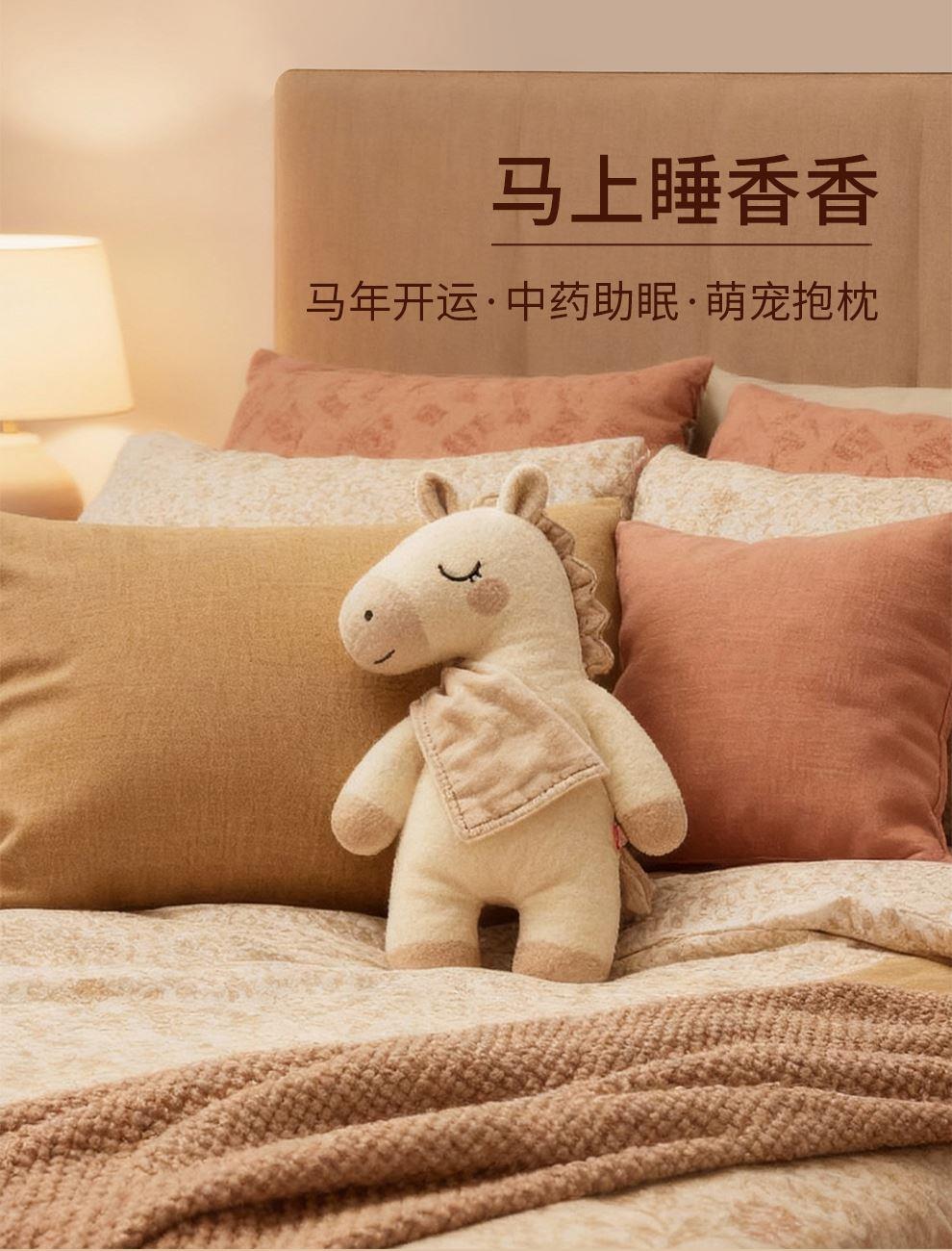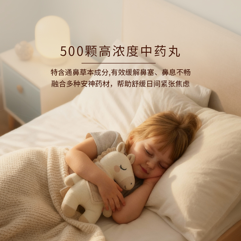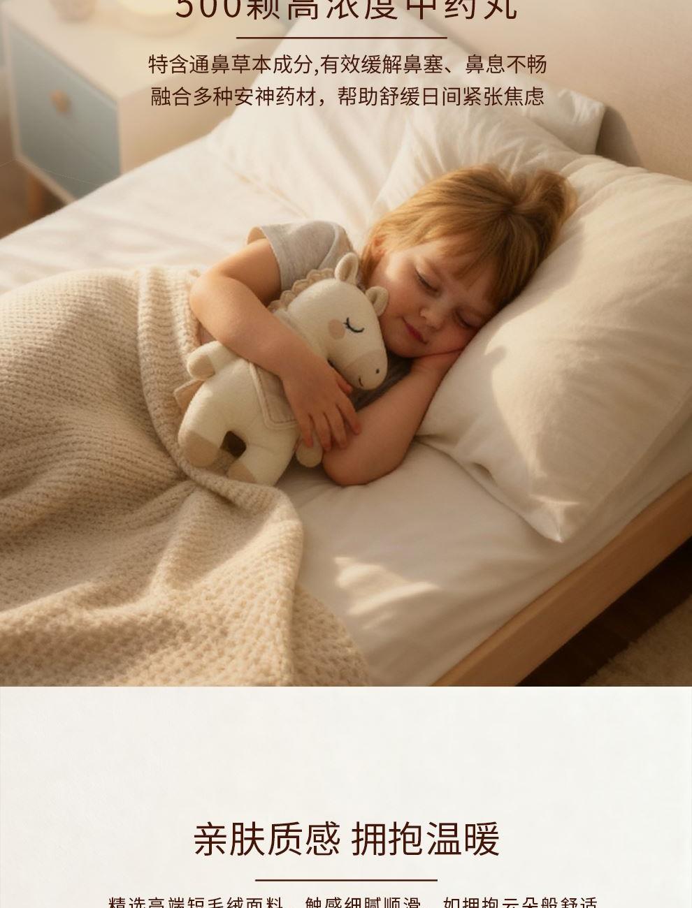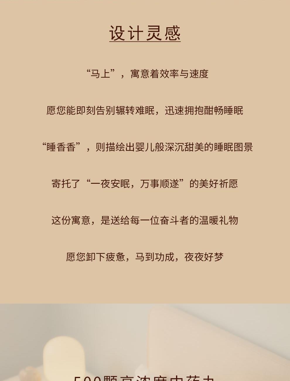 设计师说 “马上”,寓意着效率与速度,愿您能即刻告别辗转难眠,迅速拥抱酣畅睡眠;“睡香香”,则描绘出婴儿般深沉甜美的睡眠图景,寄托了“一夜安眠,万事顺遂”的美好祈愿。这份寓意,是送给每一位奋斗者的温暖礼物,愿您卸下疲惫,马到功成,夜夜好梦。 我们精选500颗高浓度药丸,每一颗都凝聚自然精华,靶向解决睡眠困扰: 畅通呼吸,舒心入眠:特含通鼻草本成分,有效缓解因鼻塞、鼻息不畅导致的入睡困难,让呼吸先于意识放松下来。 产品配置:小马抱枕1,中草药药丸枕芯