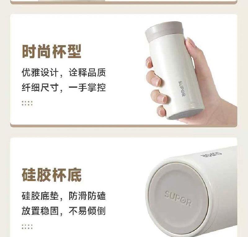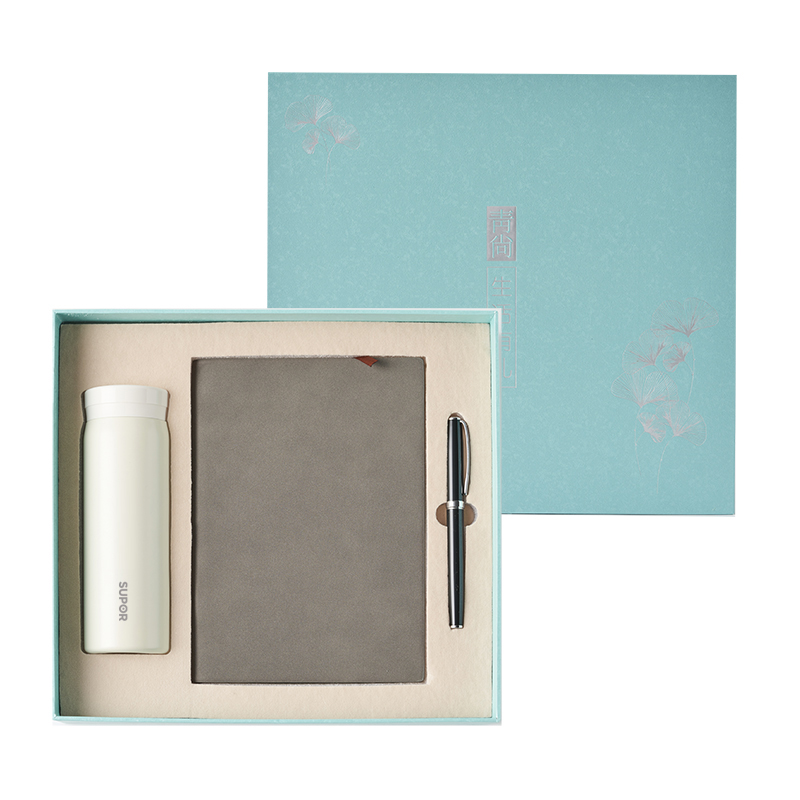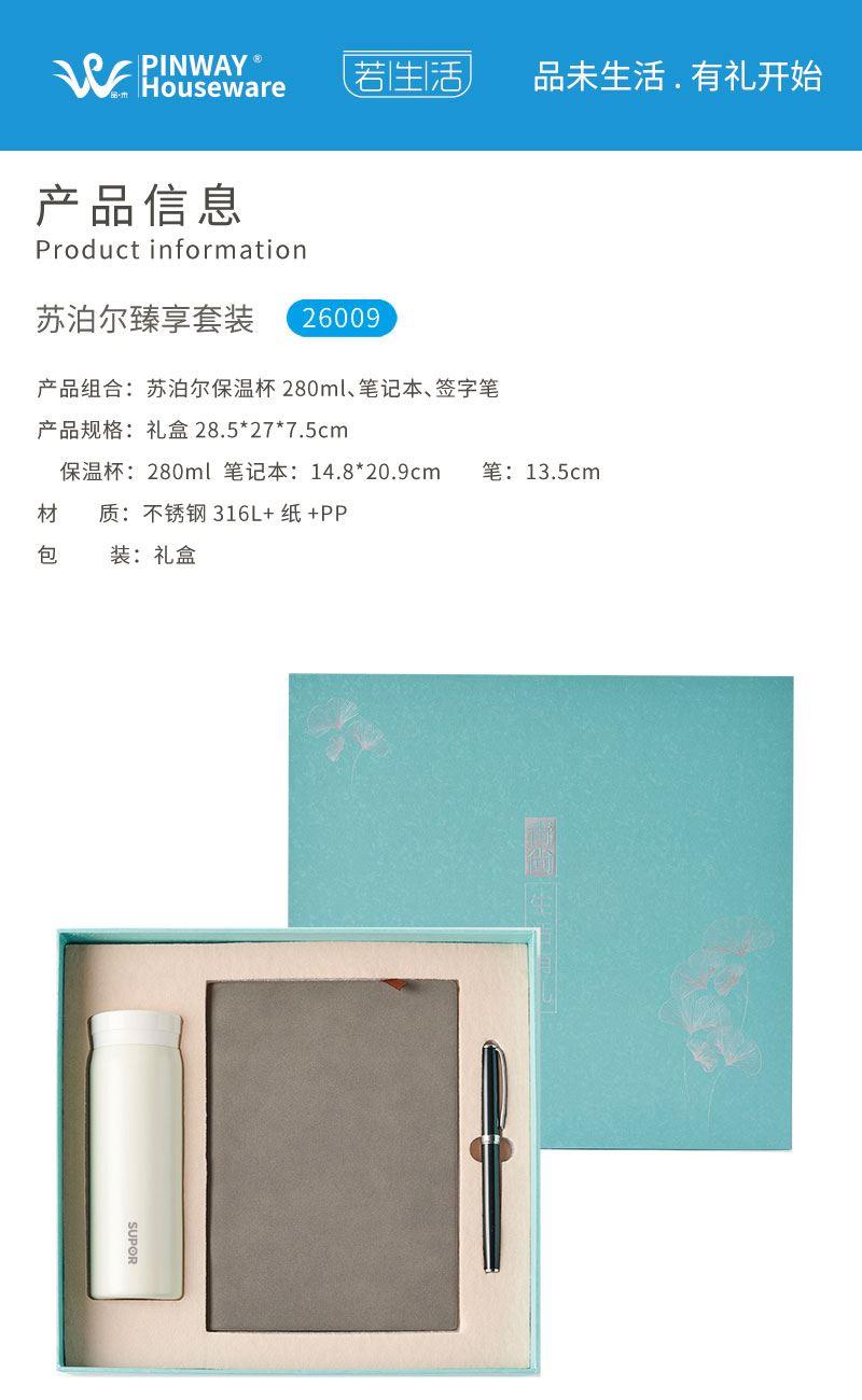 产品组合:苏泊尔保温杯280ml+笔记本+签字笔 产品规格:礼盒28.5*27*7.5cm 保温杯:280ml 笔记本:14.8*20.9cm 笔:13.5cm 材质:不锈钢316L+纸+PP 包装:精装礼盒