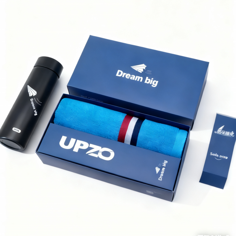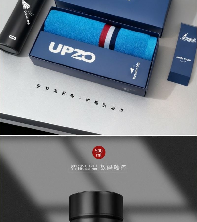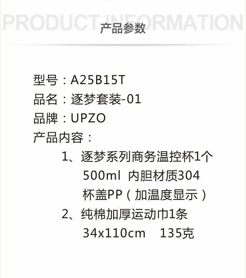 产品内容: 1、纯棉加厚运动巾 34*110CM 135克 精梳棉材质 2、逐梦系列商务温控杯 材质: 内胆材质304 杯盖PP (加温度显示) 容量: 500ML 礼盒:29.5*15*7CM