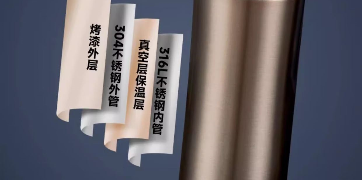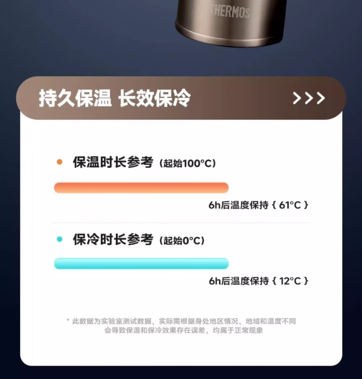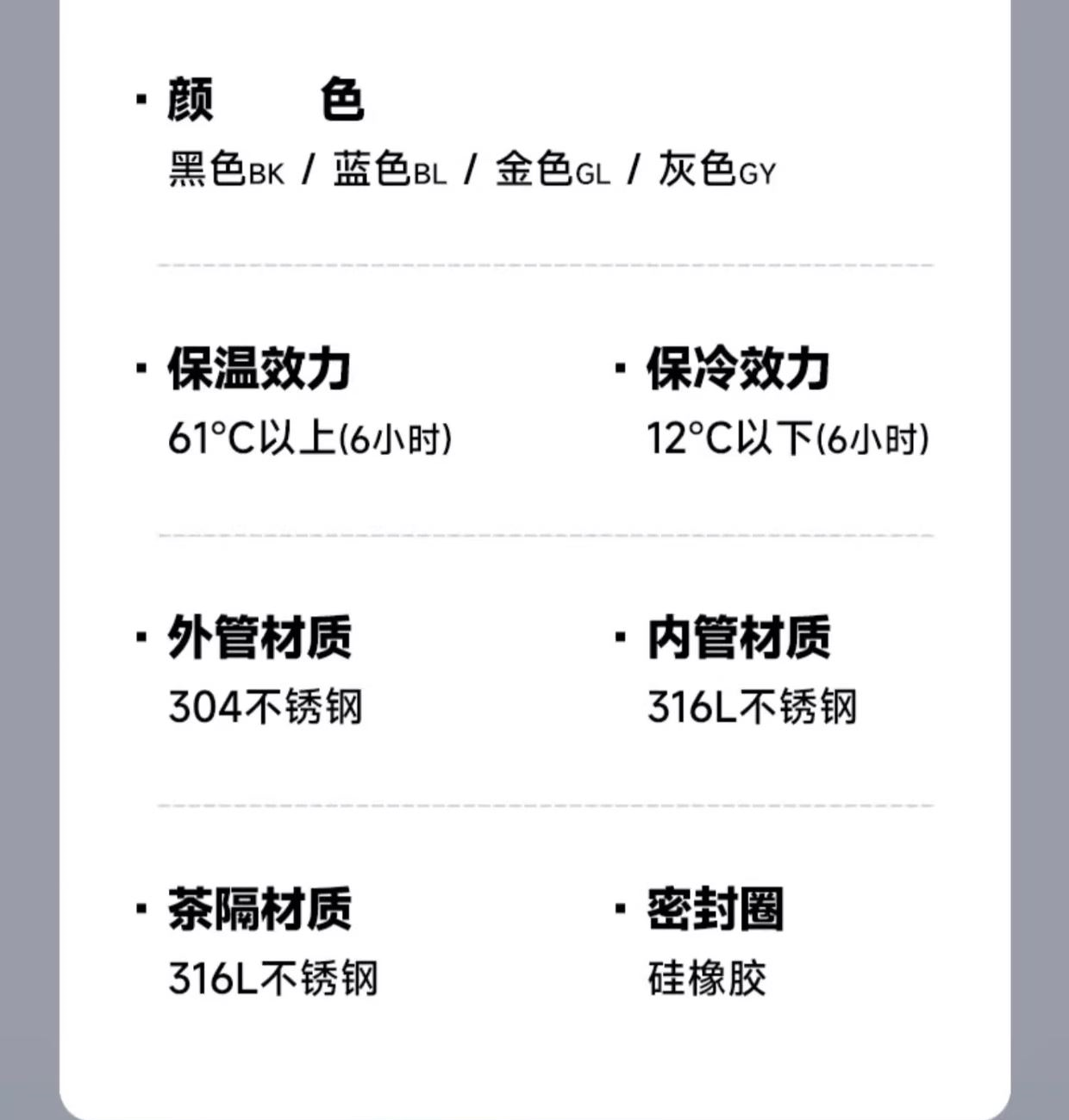 颜 色:金色GL/蓝色BL/黑灰色GY/纯黑BK 容 量:400ml 保温效力:61°C以上(6小时) 保冷效力:12°C以下(6小时) 外管材质:304不锈钢 内管材质:316L不锈钢 茶隔材质:316L不锈钢 密封圈:硅橡胶