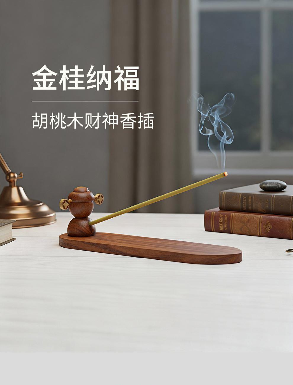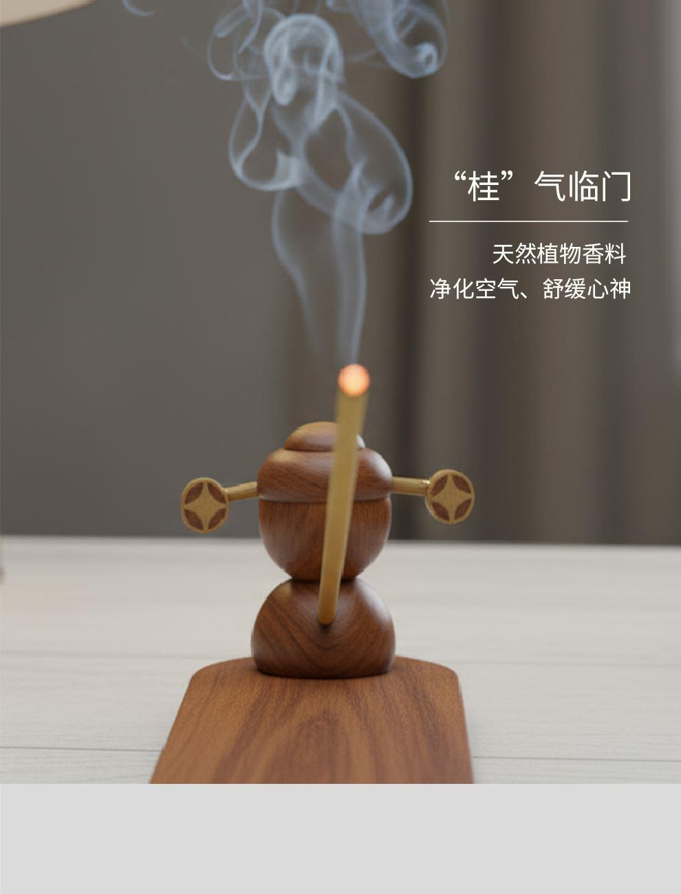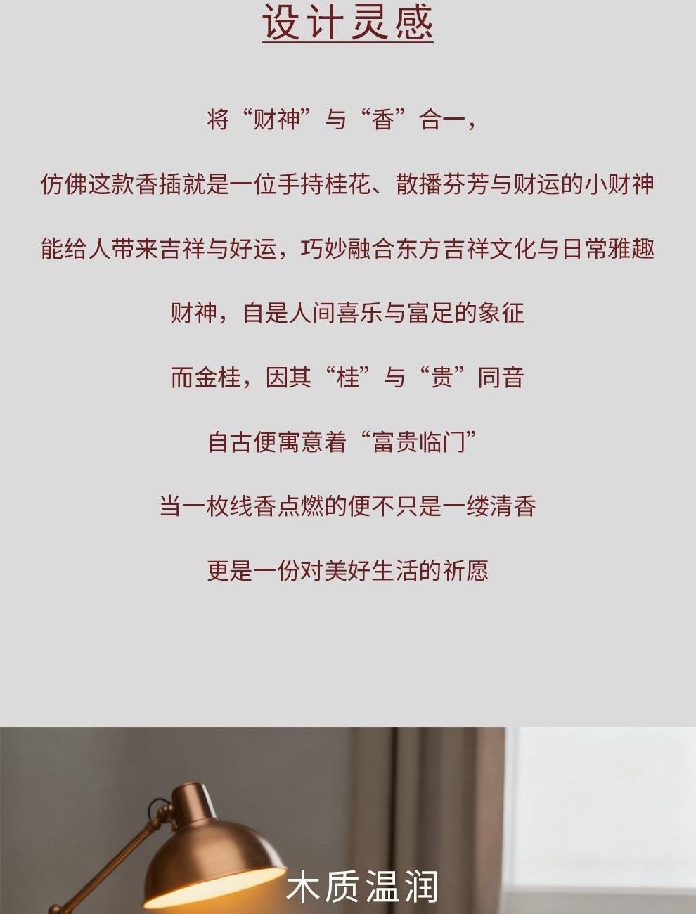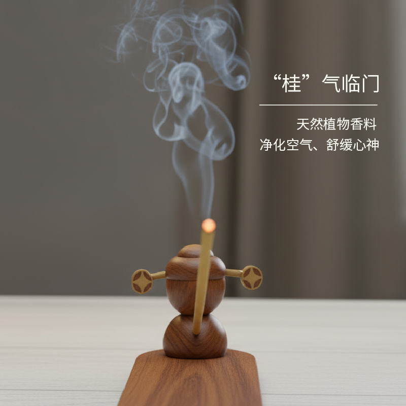 设计师说 将“财神”与“香”合一,仿佛这款香插就是一位手持桂花、散播芬芳与财运的小财神能给人带来吉祥与好运,巧妙融合东方吉祥文化与日常雅趣。财神,自是人间喜乐与富足的象征;而金桂,因其“桂”与“贵”同音,自古便寓意着“富贵临门”。 产品配置:底座1,财神摆件1,线香1(桂花味)