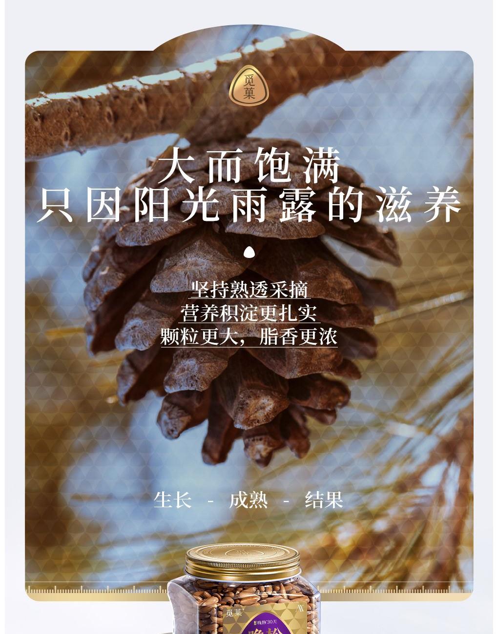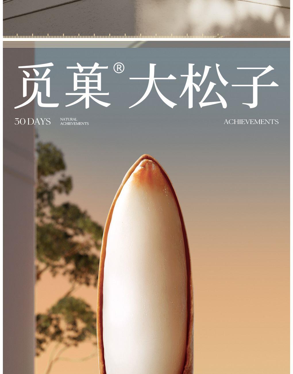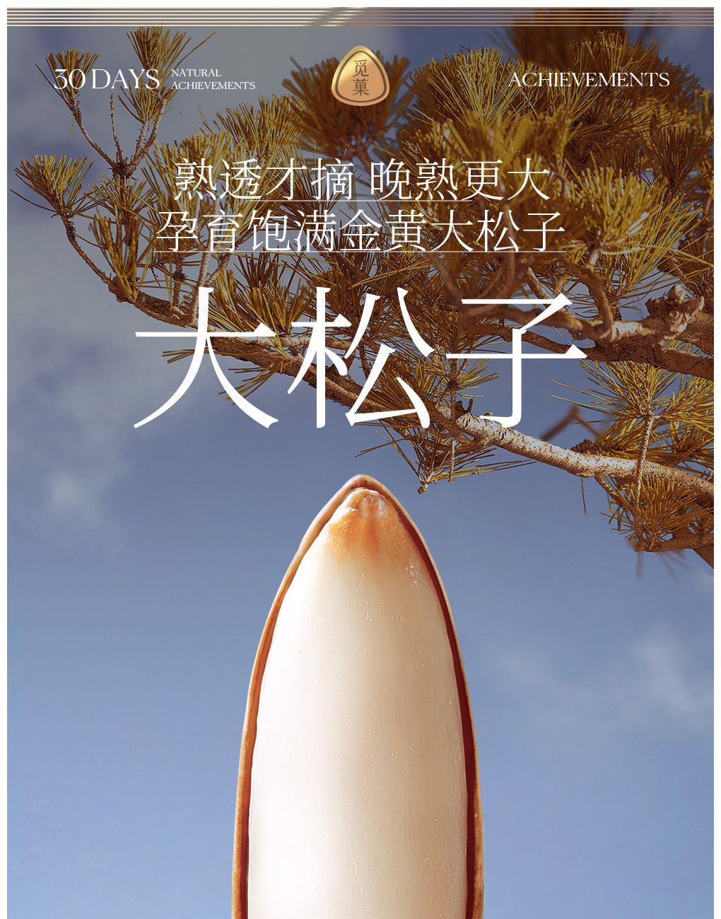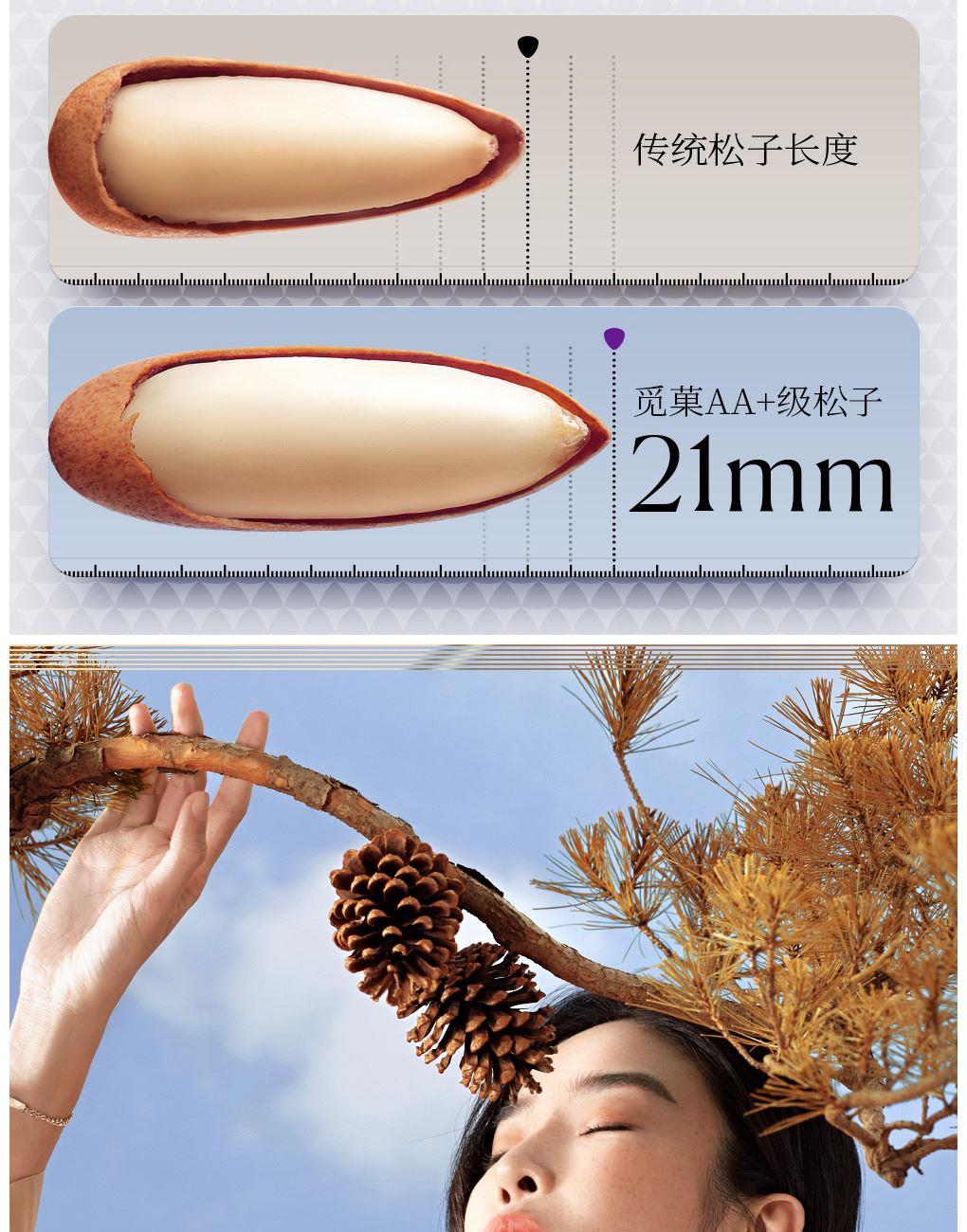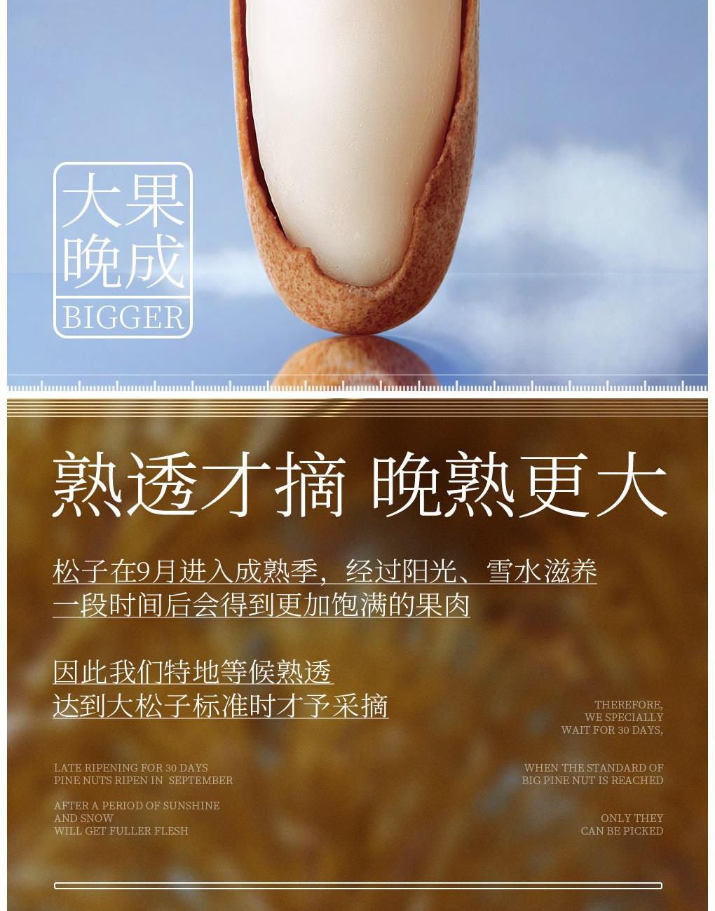 1.采用AI机器筛选标准大果 ,颗粒更均匀 ,AI机器筛选 , 坏子率控制在3%以下。 2.晚熟30天 ,颗粒大 , 营养大 ,风味大 口感酥脆松香、 更浓郁 ,松子营养积淀 更扎实, 3.壳薄易剥不伤手