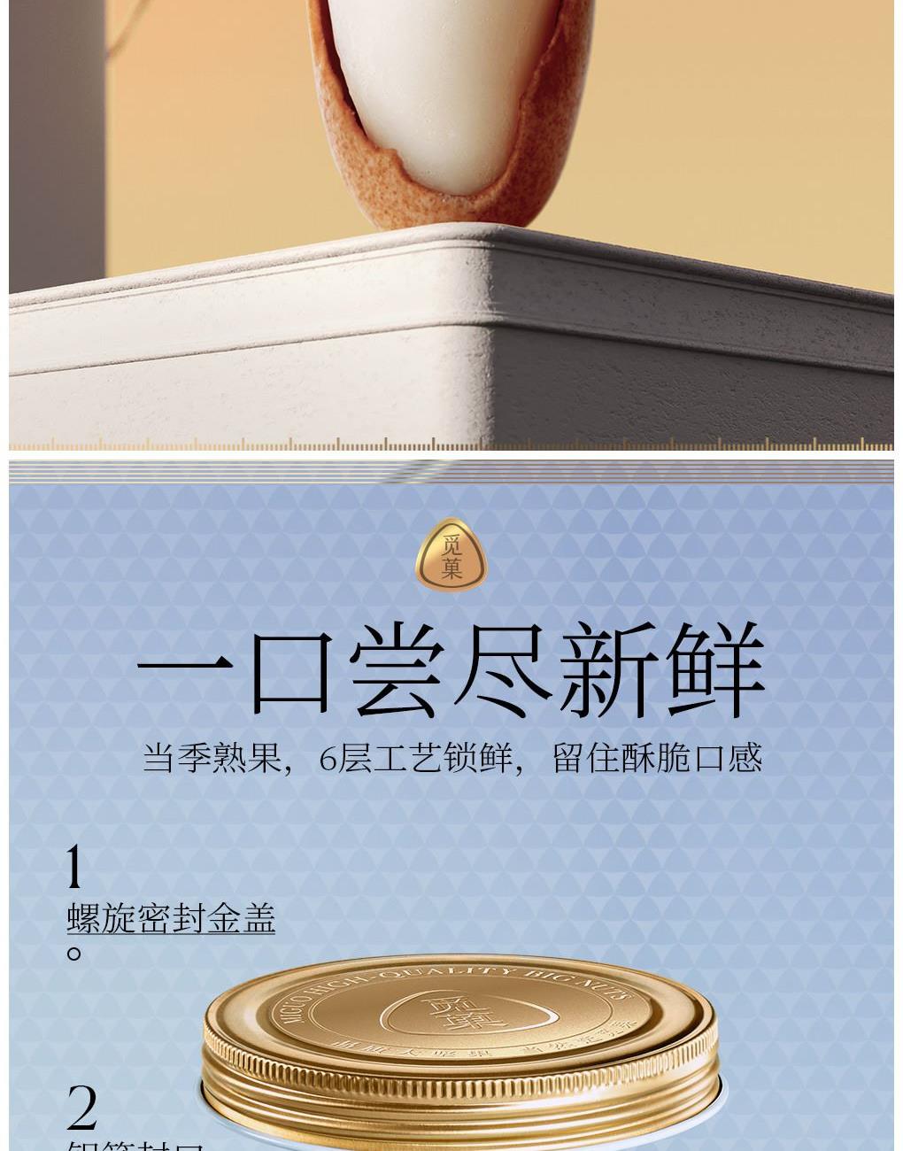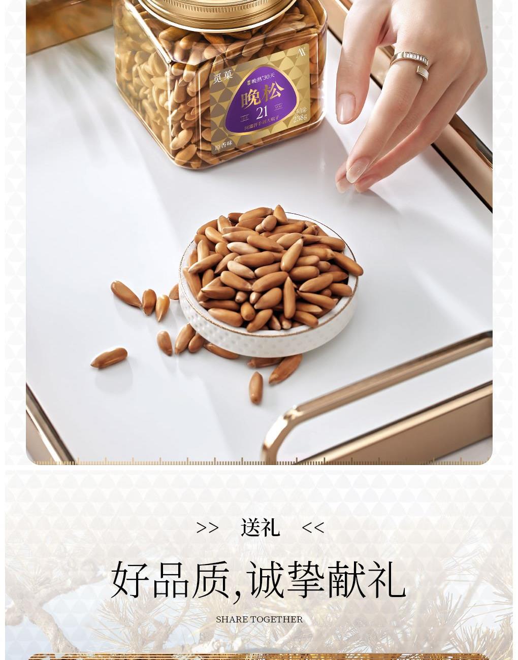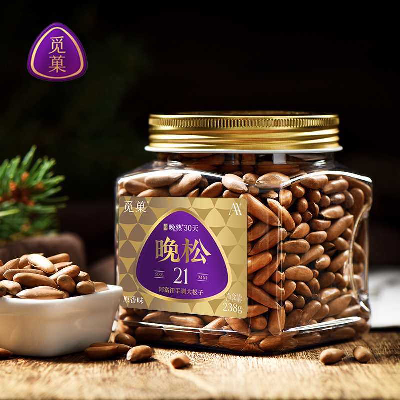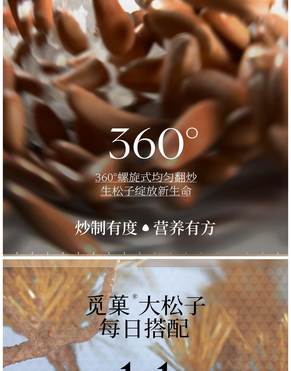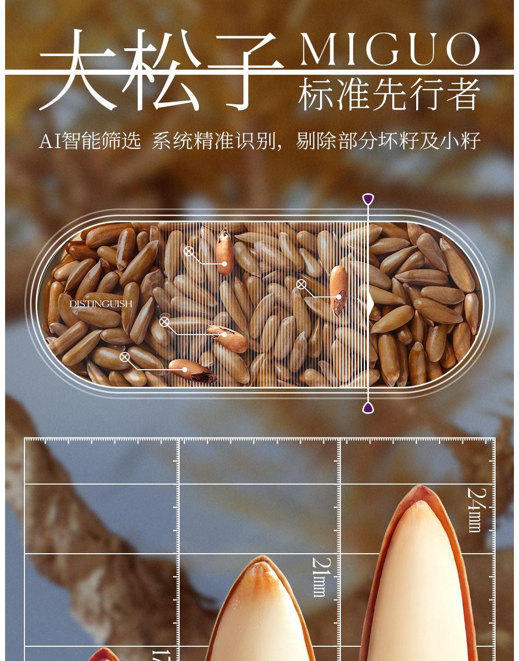 1.采用AI机器筛选标准大果 ,颗粒更均匀 ,AI机器筛选 , 坏子率控制在3%以下。 2.晚熟30天 ,颗粒大 , 营养大 ,风味大 口感酥脆松香、 更浓郁 ,松子营养积淀 更扎实, 3.壳薄易剥不伤手