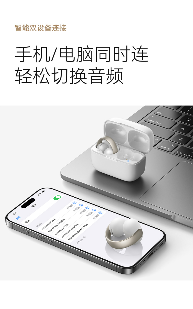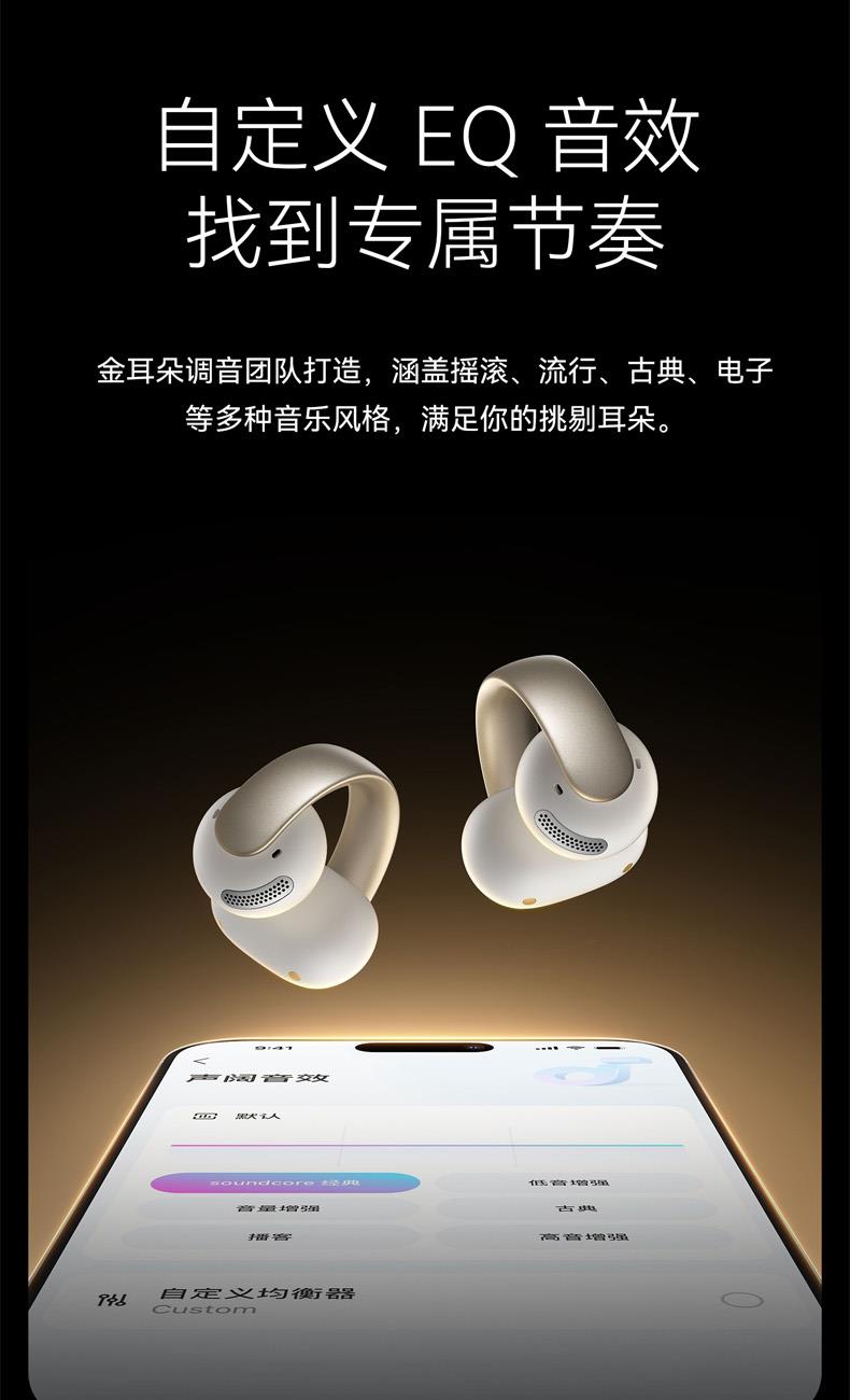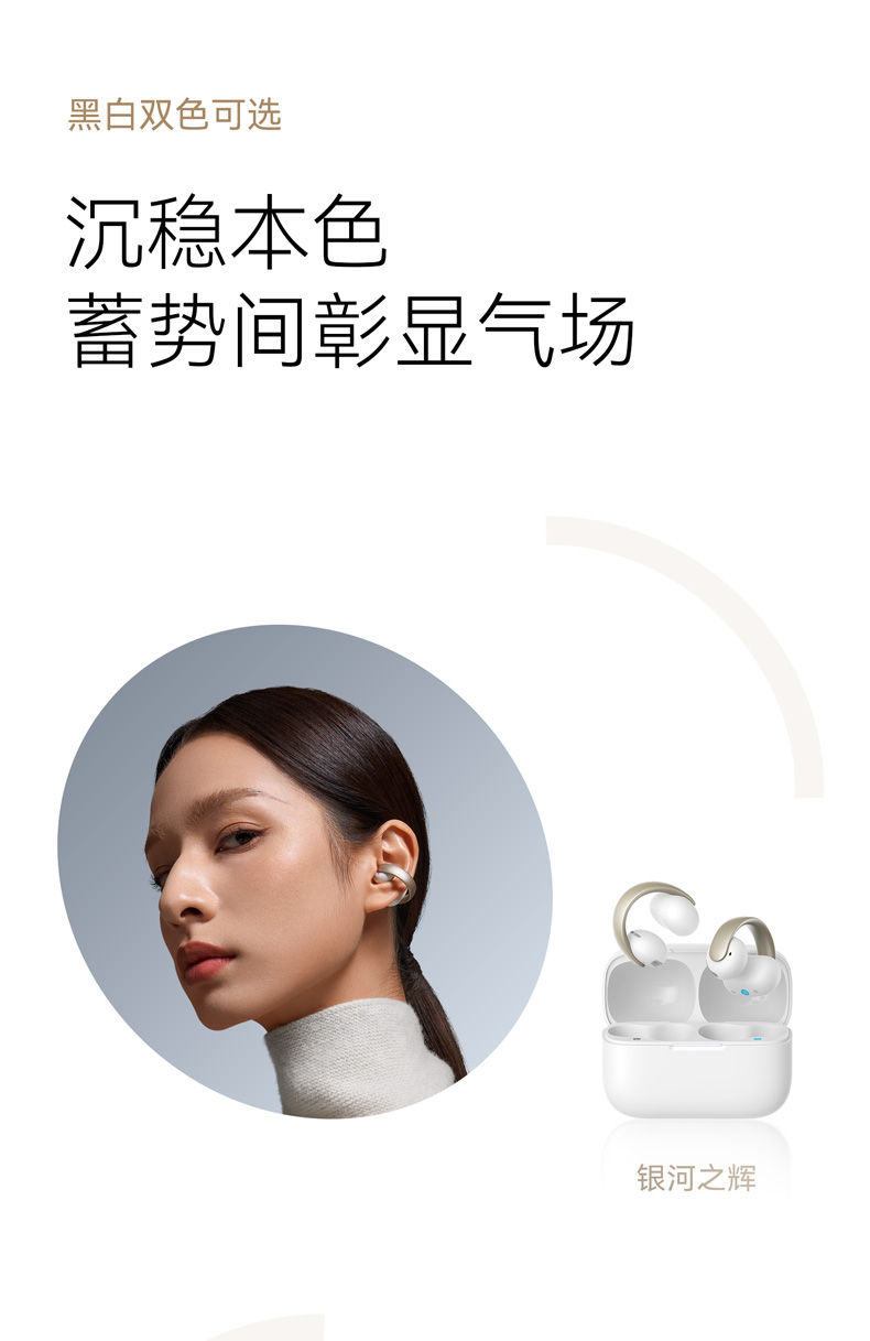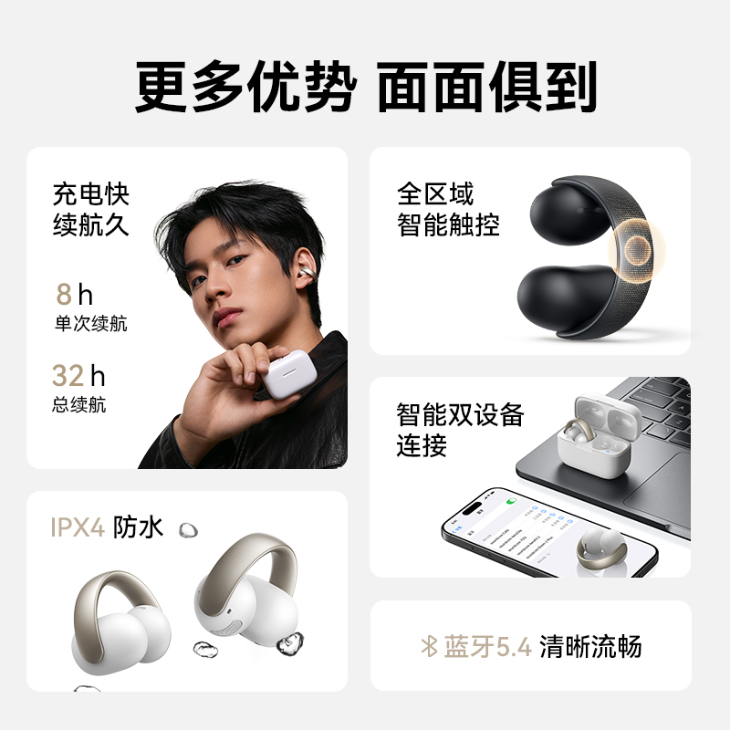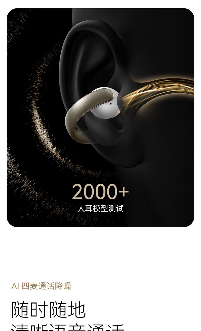 1、超亲肤弹性材质C 桥弧线延长设计高密度云感音腔 2、0.5mm 记忆钦丝柔性液态硅胶耳翼 3、耳机8小时/搭配充电盒使用32小时 4、4mic+Al 通话降噪