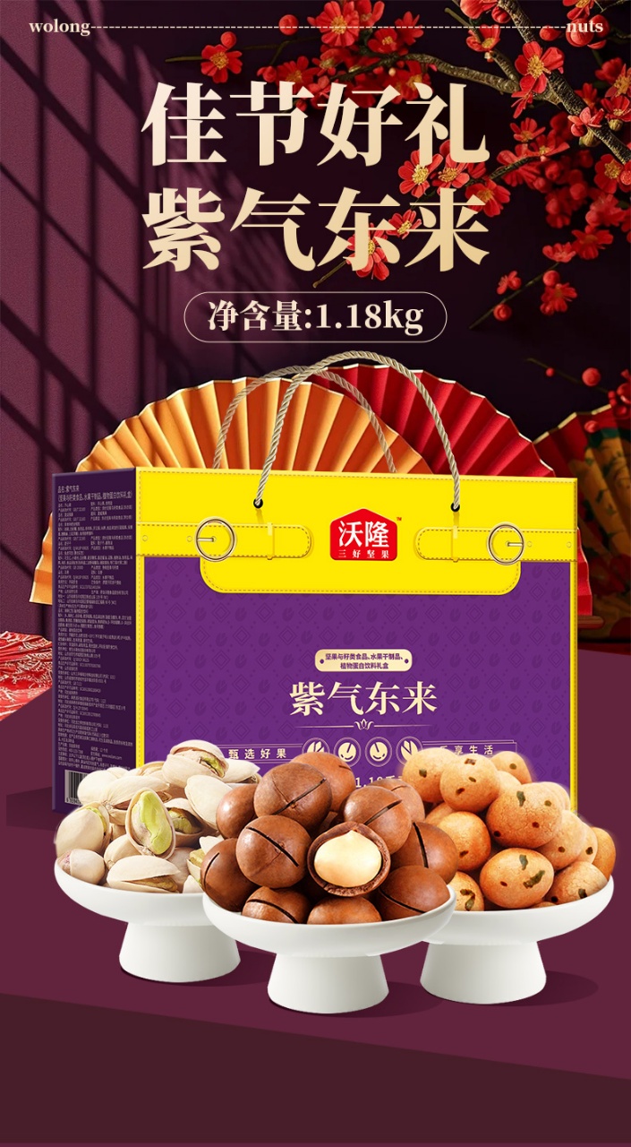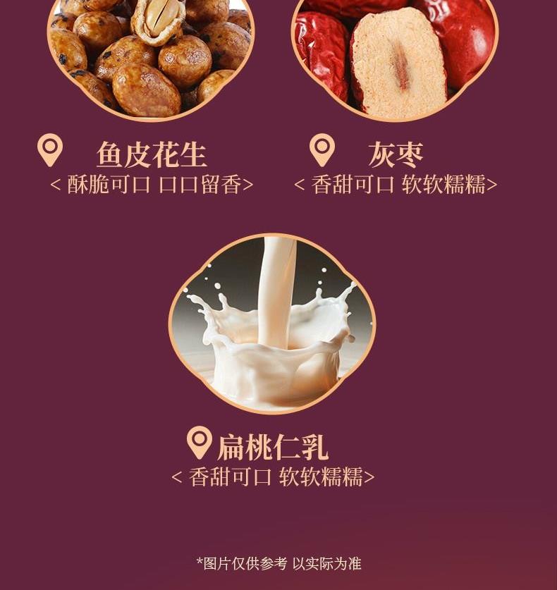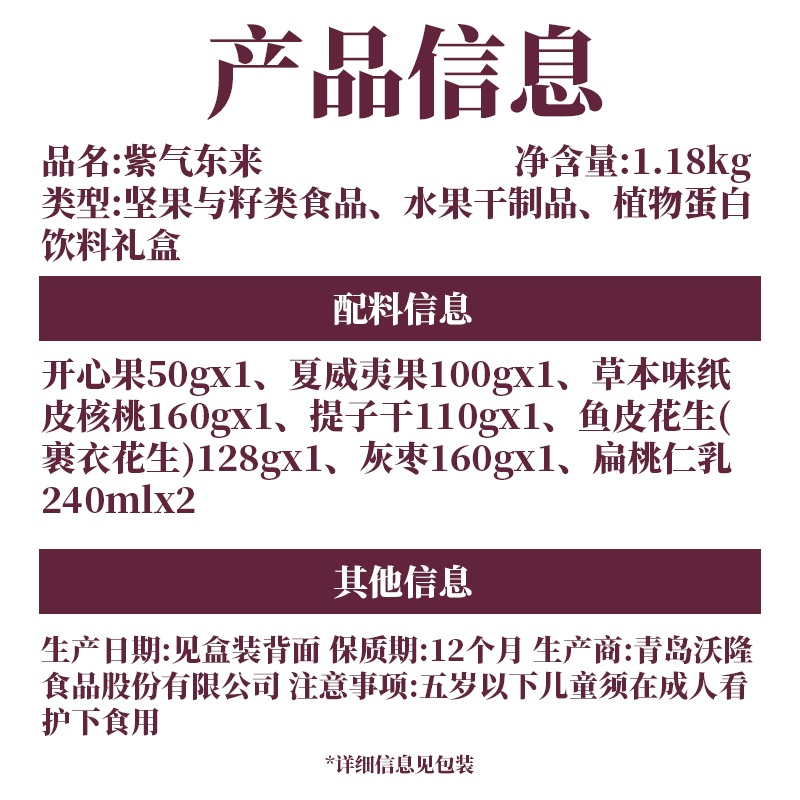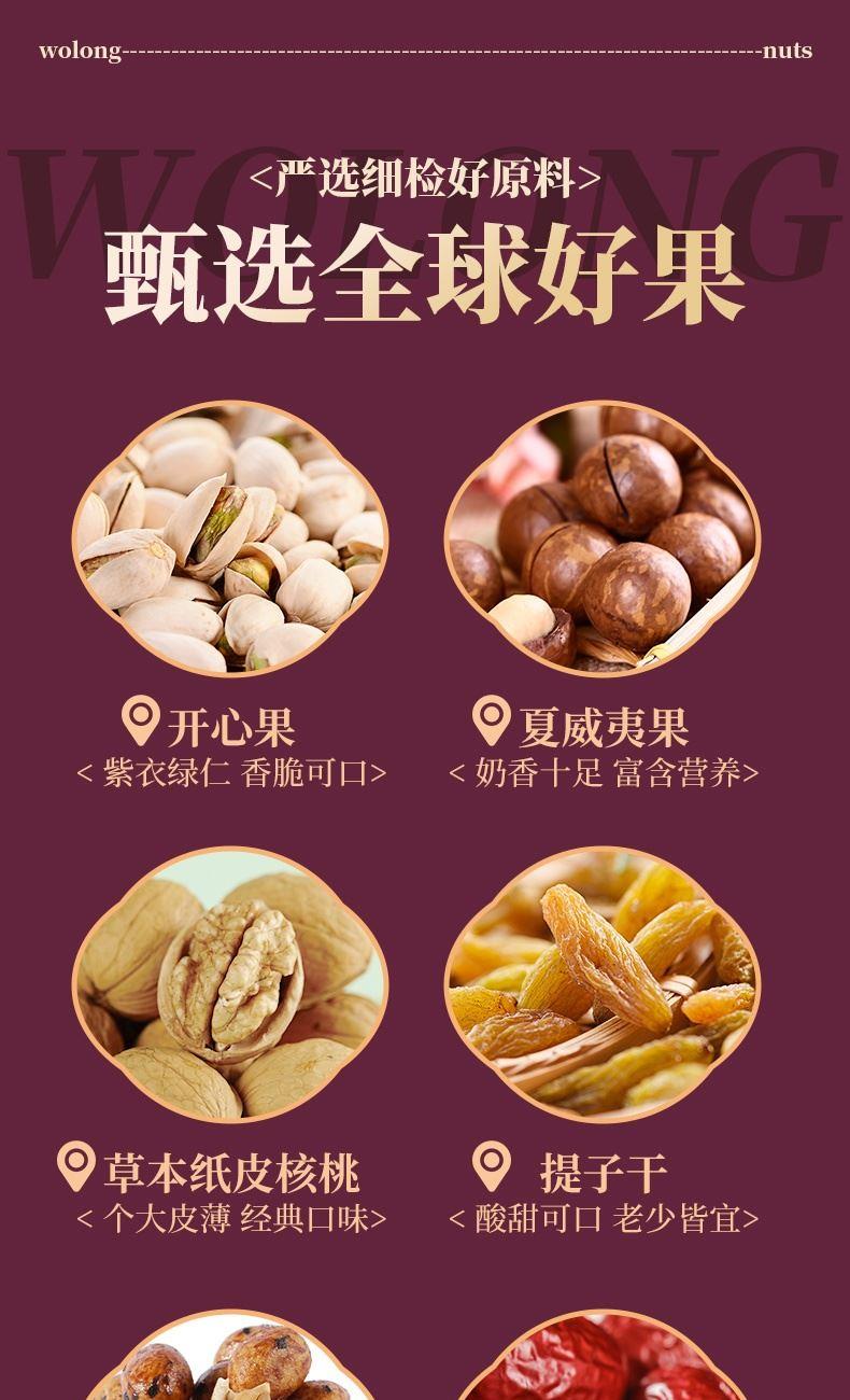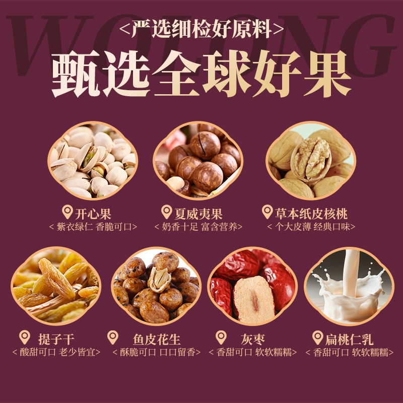 口袋开心果 50g×1袋(21/26) 草本味纸皮核桃 160g×1袋 夏威夷果 100g×1袋 提子干 110g×1袋 灰枣 160g×1袋 鱼皮花生(裹衣花生) 128g×1袋 扁桃仁乳 240mL×2罐
