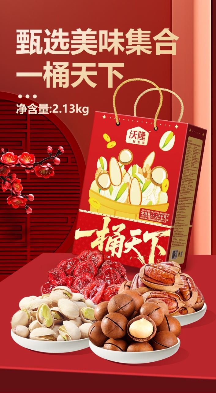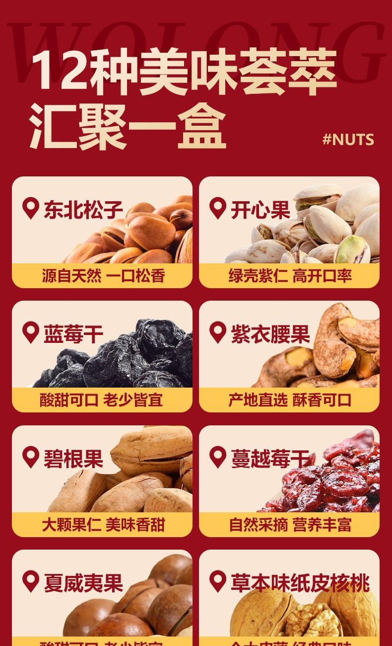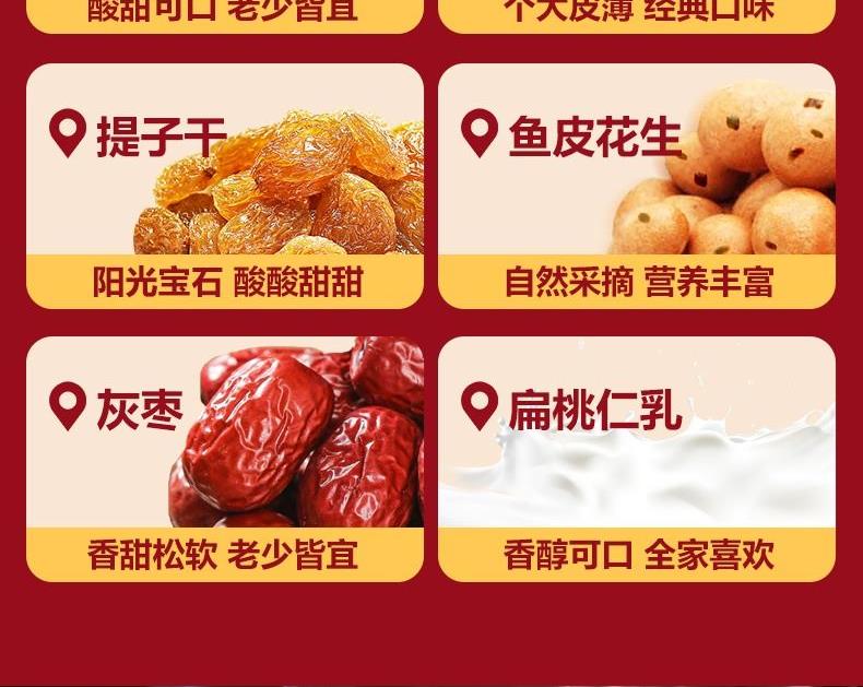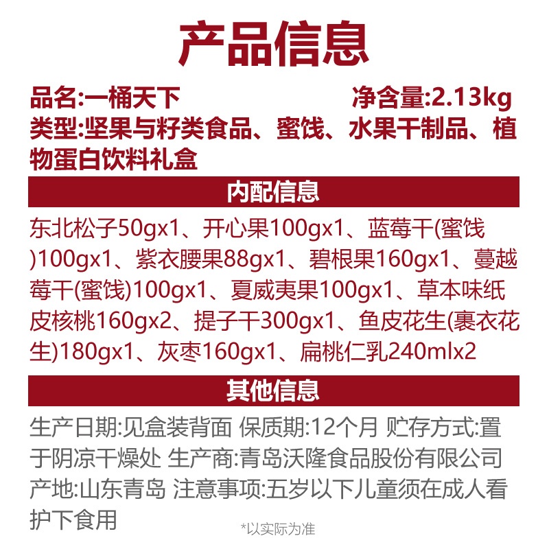 开心果 100g×1袋(21/26) 草本味纸皮核桃 160g×2袋 夏威夷果 100g×1袋 紫衣腰果 88g×1袋(A240) 提子干 300g×1袋 灰枣 160g×1袋 鱼皮花生(裹衣花生) 180g×1袋 蓝莓干(蜜饯)100g×1袋 碧根果 160g×1袋 蔓越莓干(蜜饯) 100g×1袋 东北松子 50g×1袋(950) 扁桃仁乳 240mL×2罐