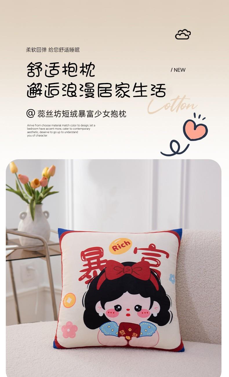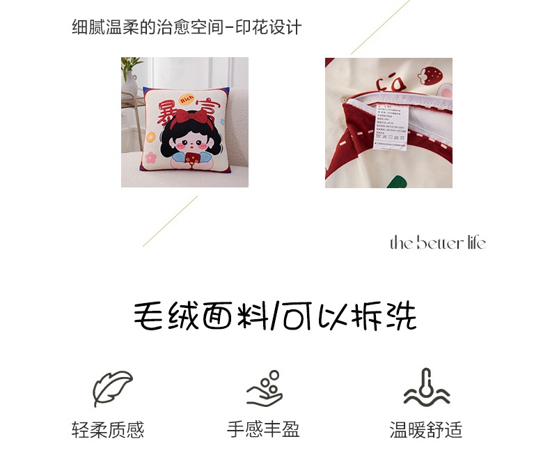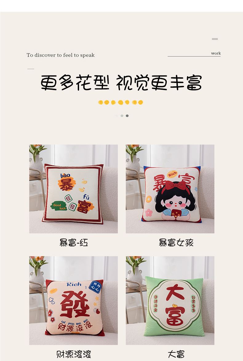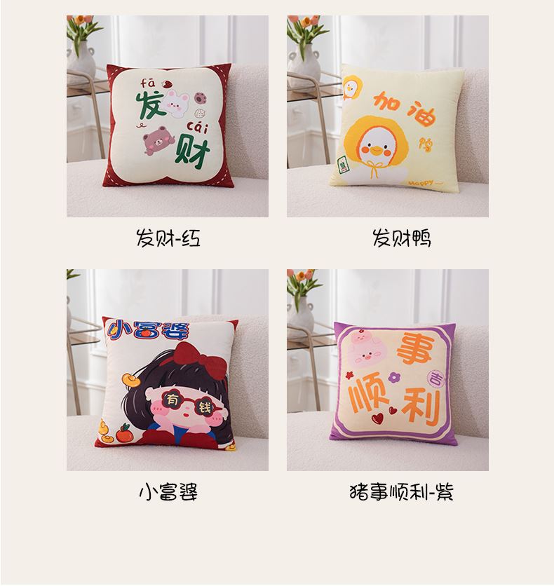 花色:暴富-红/暴富女孩/财源滚滚/大富/发财-红/发财鸭/小富婆/猪事顺利-紫 规格:40*40cm 面料:短毛绒 填充:聚酯纤维 短毛绒面料,绒毛细腻,柔软亲肤,触感舒适;填充饱满,回弹迅速;活性印染工艺,图案清晰,色牢度高,不易脱色,外套可拆洗。午休枕,沙发靠枕,飘窗坐垫,汽车靠垫,一枕多用。