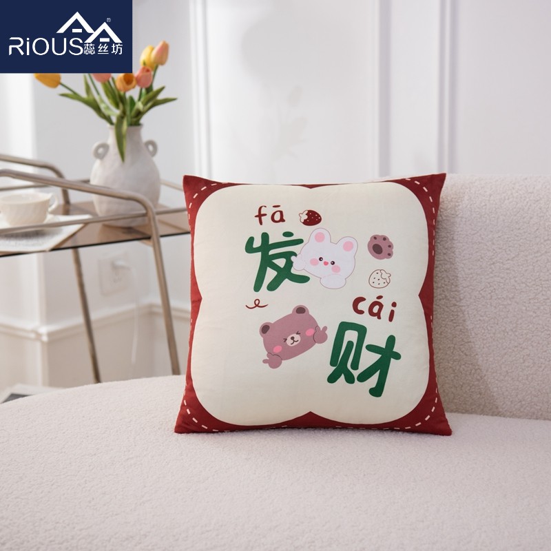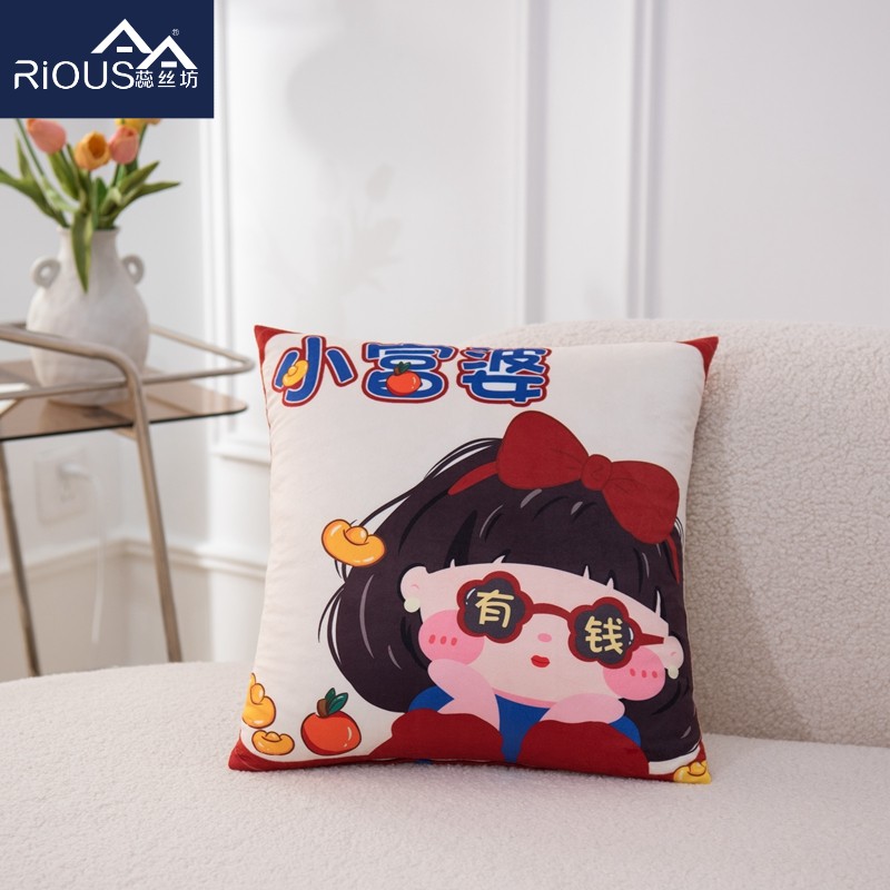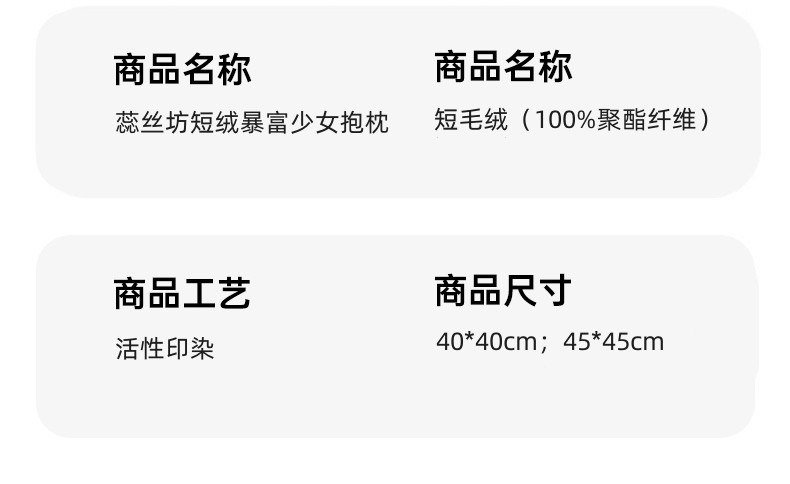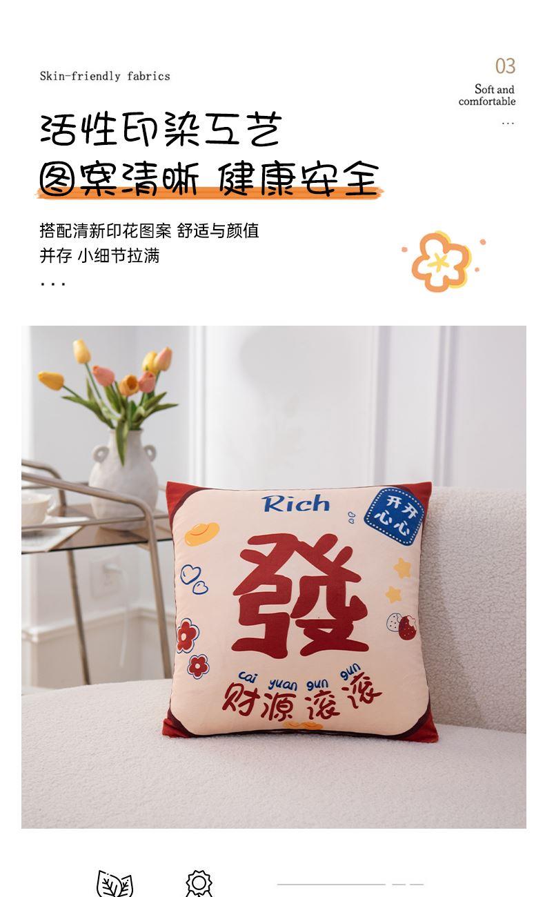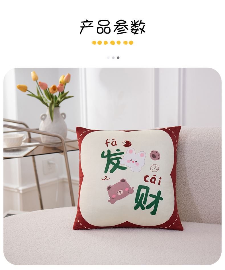 花色:暴富-红/暴富女孩/财源滚滚/大富/发财-红/发财鸭/小富婆/猪事顺利-紫 规格:40*40cm 面料:短毛绒 填充:聚酯纤维 短毛绒面料,绒毛细腻,柔软亲肤,触感舒适;填充饱满,回弹迅速;活性印染工艺,图案清晰,色牢度高,不易脱色,外套可拆洗。午休枕,沙发靠枕,飘窗坐垫,汽车靠垫,一枕多用。