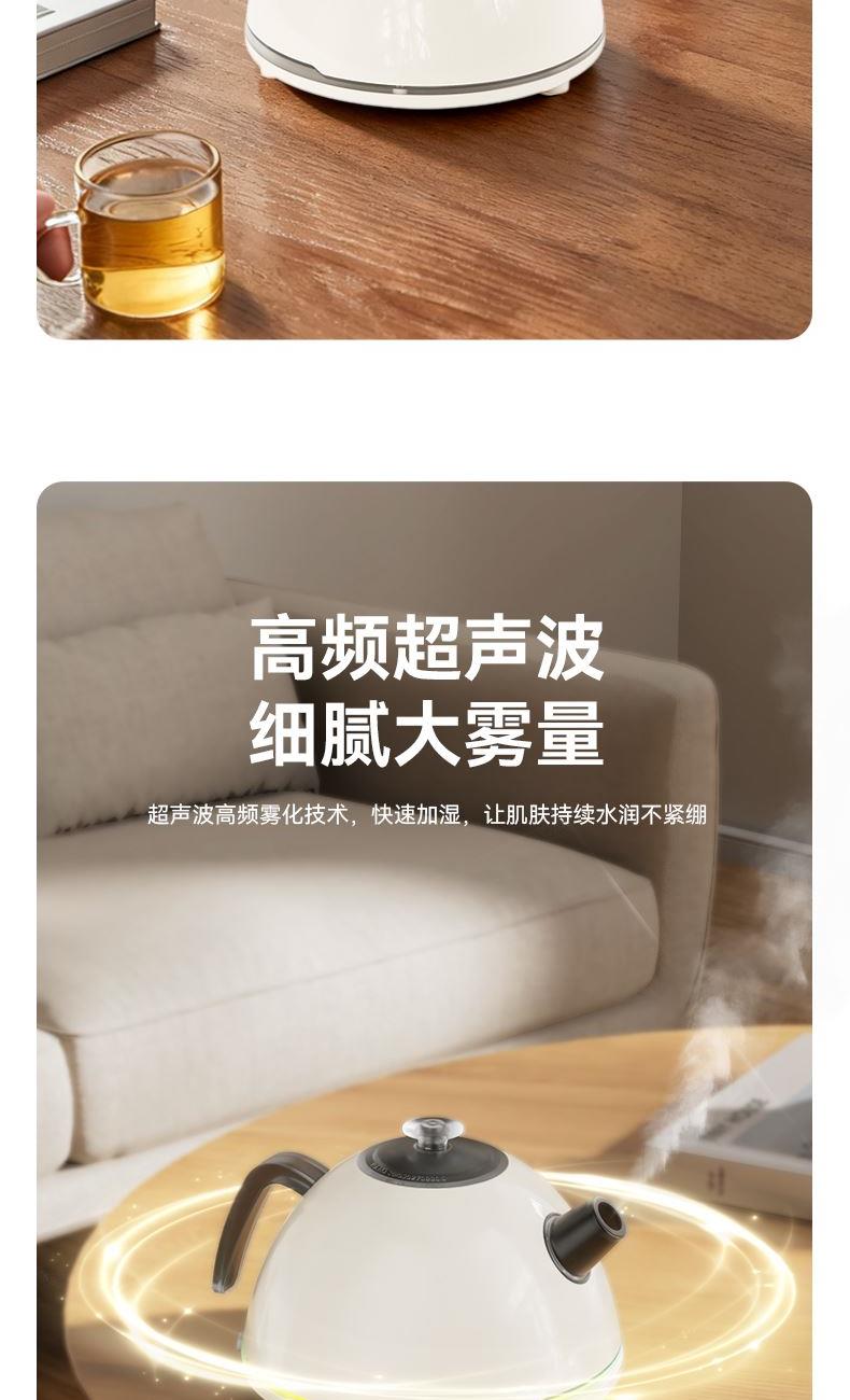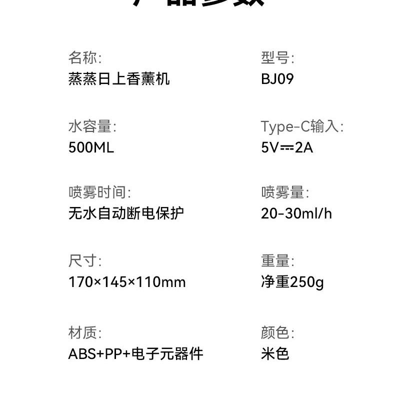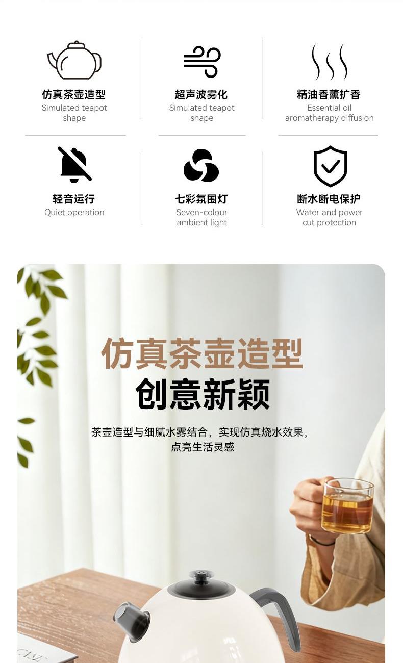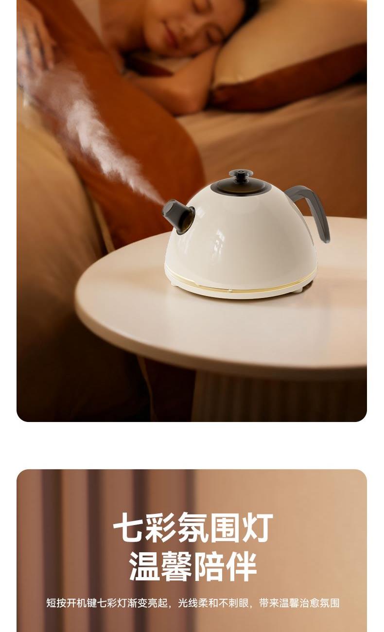 水容量500ML 产品尺寸:170x145X110MM 净重:250g 喷雾时间:无水自动断电保护 喷雾量:20--30ml/h 七彩氛围灯光 输入TYPE-C,5V2A颜色:米色 材质:ABS+PP+电子元器件 仿真烧水效果,七彩灯光效果 PP材质水箱可添加水溶性精油香薰雾化 彰显品质;灯光定色模式可调节 内置智能芯片,缺水断电保护