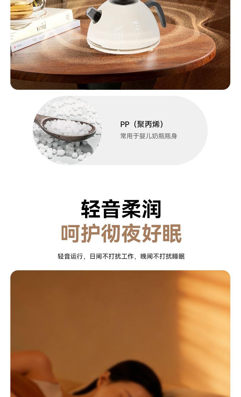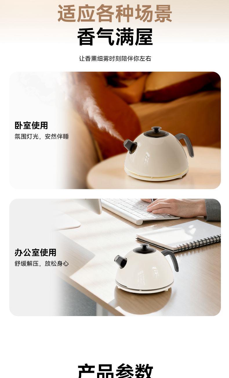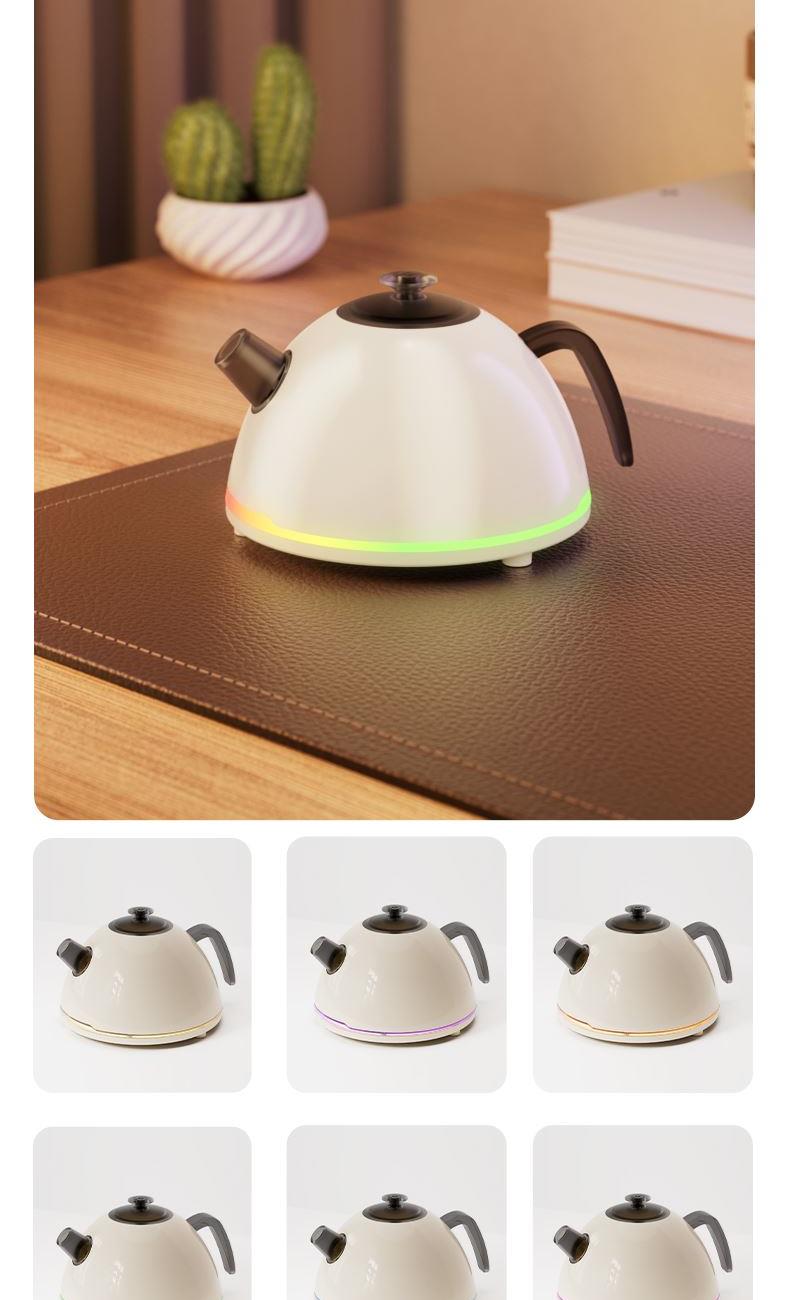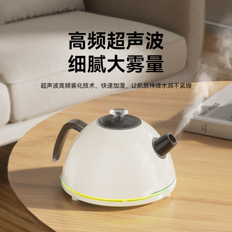水容量500ML 产品尺寸:170x145X110MM 净重:250g 喷雾时间:无水自动断电保护 喷雾量:20--30ml/h 七彩氛围灯光 输入TYPE-C,5V2A颜色:米色 材质:ABS+PP+电子元器件 仿真烧水效果,七彩灯光效果 PP材质水箱可添加水溶性精油香薰雾化 彰显品质;灯光定色模式可调节 内置智能芯片,缺水断电保护