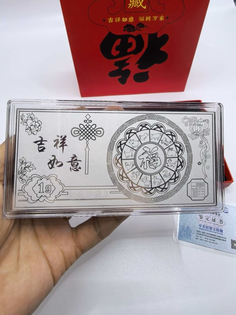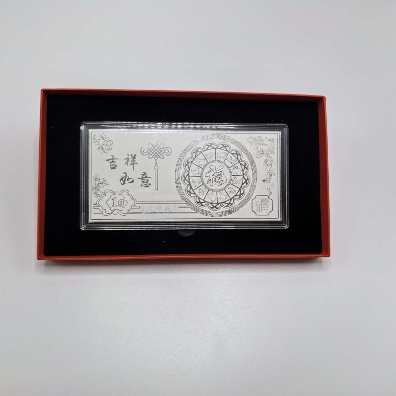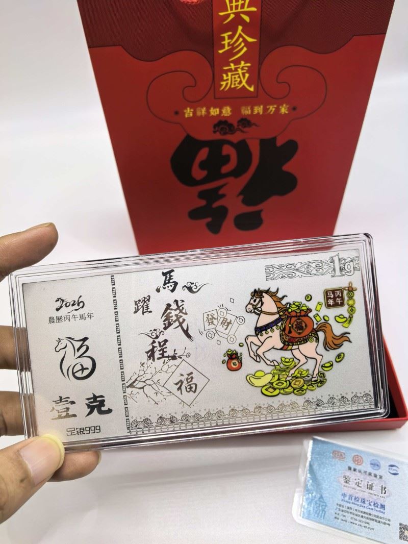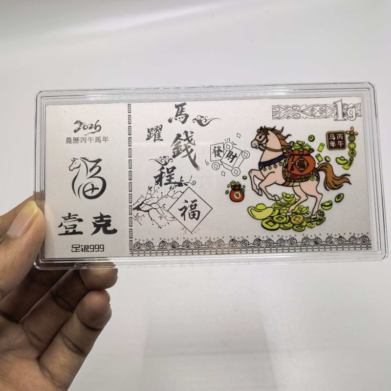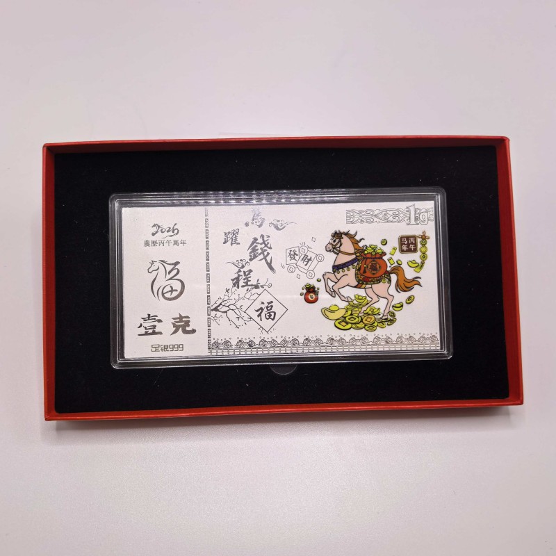 产品材质:足银999 1g 产品尺寸:130*70*4mm 以999足银匠心铸造却寓意万千!奔腾骏马跃然钞上,伴祥云铜钱与"福"字环绕,寓意"跃马钱程,财源广发" 红盒金袋装载吉祥,是新春赠礼、收藏传家的祥瑞之选。经典珍藏,福到万家!