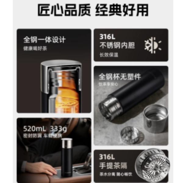 容量:520ml 颜色:黑色 灰色 尺寸:6.5*21.5cm 材质:316L不锈钢内胆, 无尾抽真空超保温技术,保温保冷。 316L不锈钢茶漏,316L抽真空杯盖, 防烫保温,一盖多用。硅胶底垫,防滑耐磨。