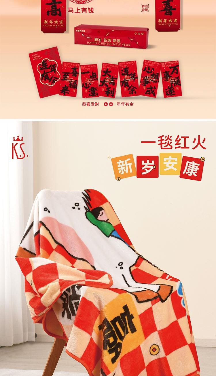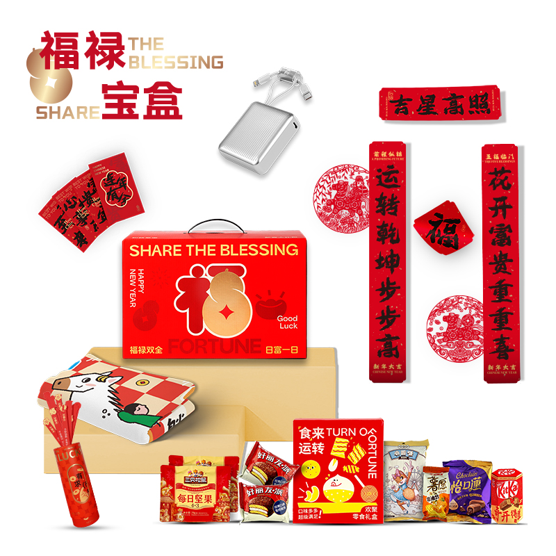 充电宝170*180mm(18签入)铜版纸 毛毯/95x148cm、 300克涤纶针织布 春联/福贴*1副(157G铜版纸) 窗花/pvc10丝带纸140G静电膜23.5*23.5cm 红包/铜版纸200g 传统福禄纹样烫金纸盒,设计轻盈便携,年味洋溢,传递真挚祝福。 满足企业员工福利、普适客户问候等广谱送礼需求,彰显贴心关怀。 精选传统年味春联、红包、窗花与零食礼盒构成经典组合,并搭配实用好物(求签桶、充电宝、躺赢毯),支持产品替换,灵活自由。 支持小批量灵活定制,打造专属年礼,彰显诚意。 以下代发价不含偏远地区:黑龙江、吉林、内蒙古、青海、云南、宁夏、海南、贵州、甘肃、新疆,(西藏地区按官网核价)